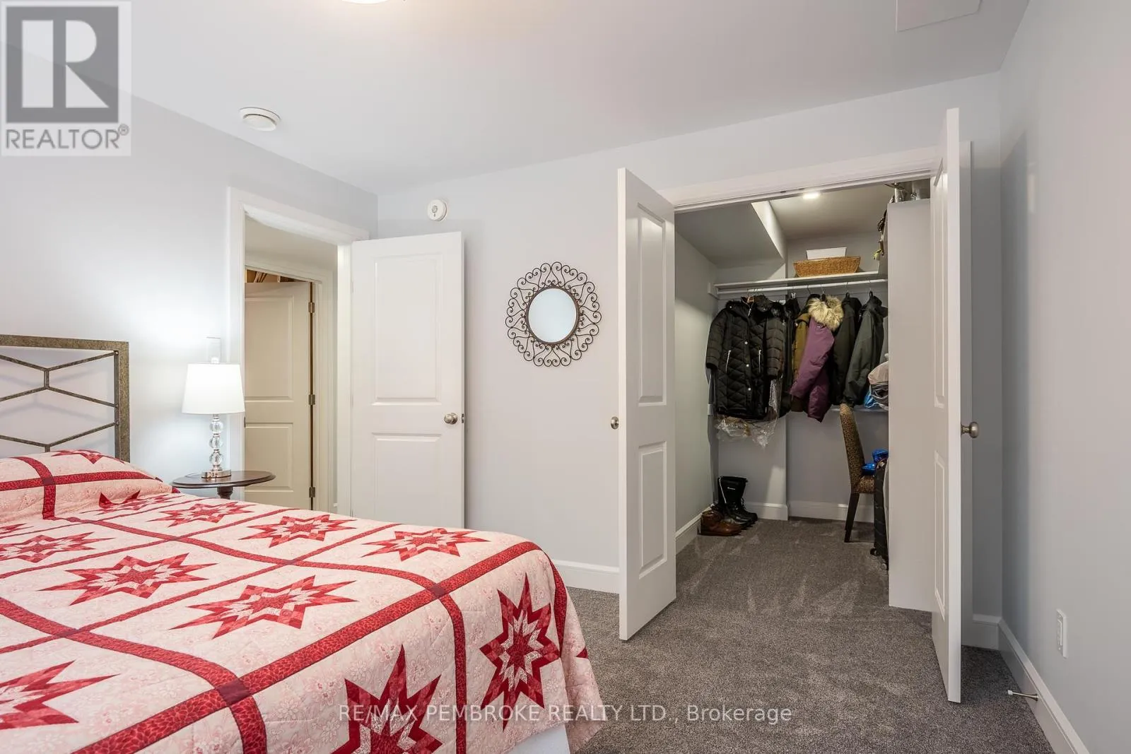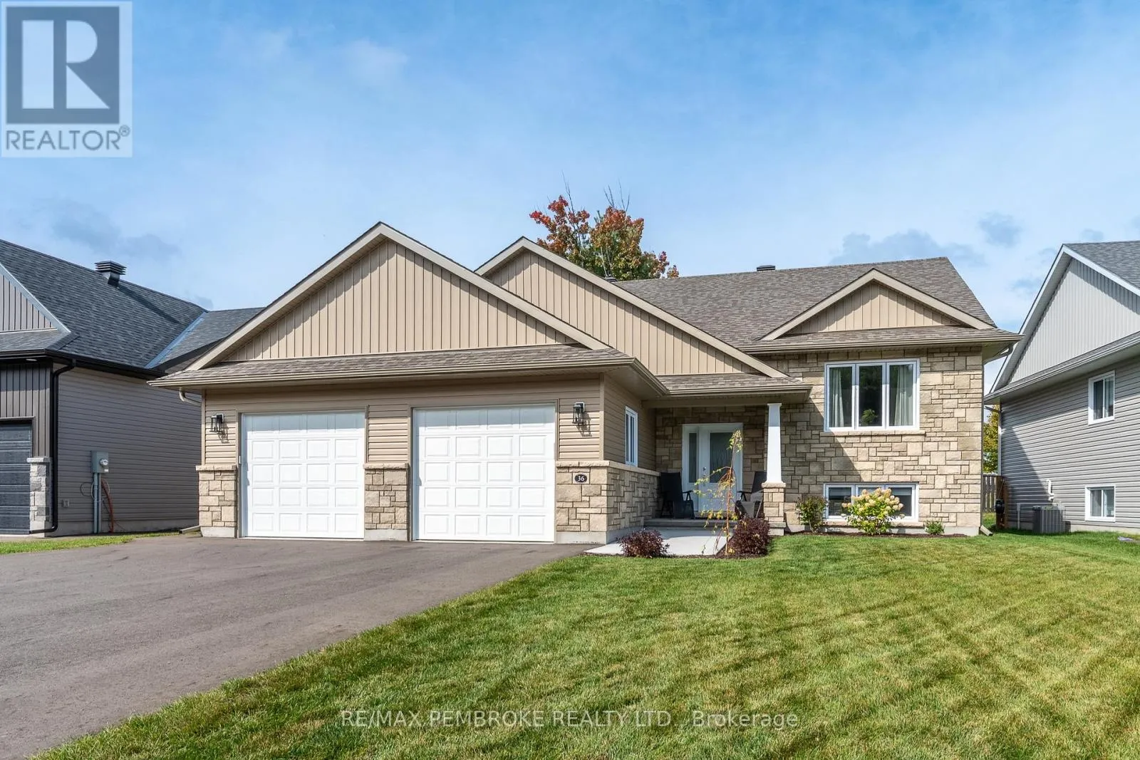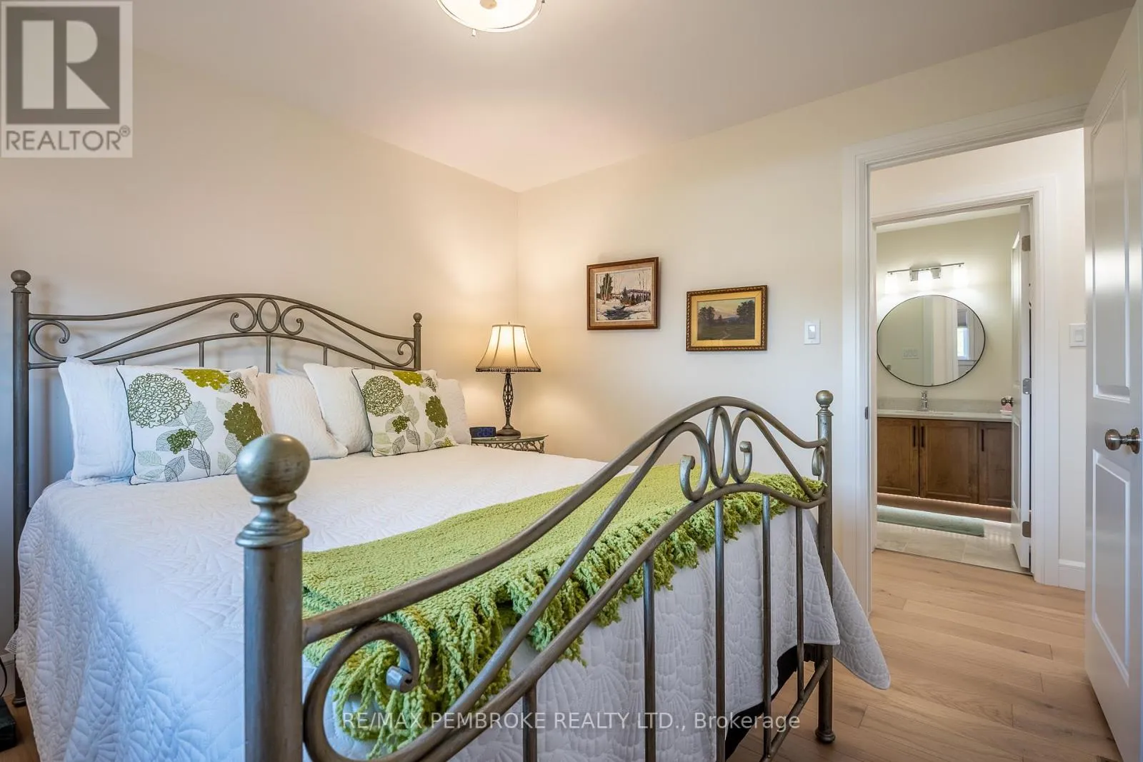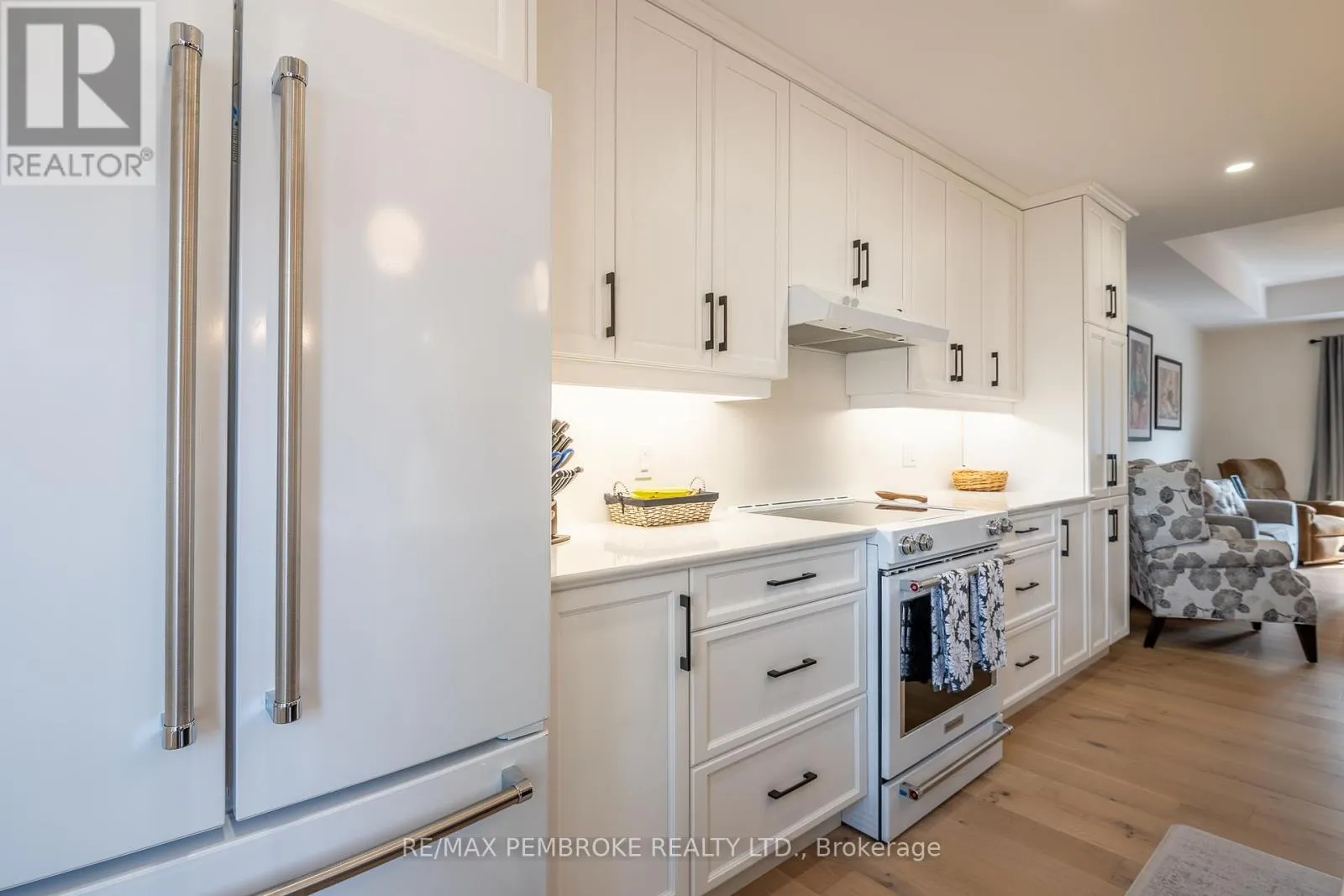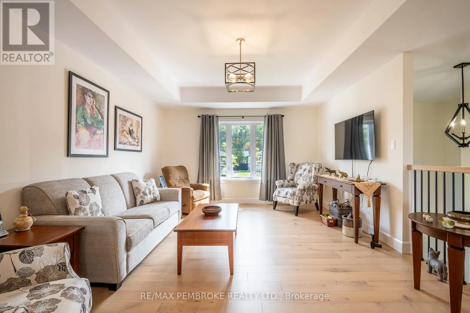 Cross Streets: Bedard & Zachary. ** Directions: Take HWY 17 or Petawawa Blvd to Murphy Rd, then Bedard onto Zachary. Welcome to this meticulously maintained, like-new home offering approximately 1,360 sq ft of beautifully designed living space plus a spacious 25 x 23 attached garage, perfect for extra storage, hobbies, and vehicles. Built in 2024, this property stands out with its unique layout, upscale finishes, and move-in ready condition. Step inside to discover an open-concept main level featuring warm french vanilla engineered hardwood flooring throughout the living spaces and bedrooms. The heart of the home is the chef-inspired kitchen with KitchenAid appliances, where ceiling-height cabinetry, quartz countertops, soft-close drawers, and an additional pantry tower offer both style and function. A large island with built-in trash/recycling drawer, additional storage, and seating for four makes this the perfect space for entertaining or casual meals.The spacious primary suite is a true retreat, complete with a 3-piece ensuite showcasing a custom tile shower with a built-in bench and niche, plus an exceptionally rare 14ft x 9ft connected dressing room/laundry room with French doors; an elegant and highly functional touch you will not find in most homes. Downstairs, plush carpeting leads you to a cozy family room with a natural gas fireplace, a third full bathroom, and two additional spacious bedrooms, one with frosted glass French doors which is currently used as a home office. You will also find both finished and unfinished storage areas to meet all your needs. Step outside to enjoy a fully fenced yard with a two-tier deck right off of the dining room, complete with natural gas hookup for a grill and an in-ground irrigation system to keep your lawn lush.This home combines high-end finishes with thoughtful functionality, offering a lifestyle of comfort, convenience, and quiet luxury. This is your chance to own a standout property in a desirable neighbourhood. 24 hour irrevocable required on any written offer. (id:27476)
