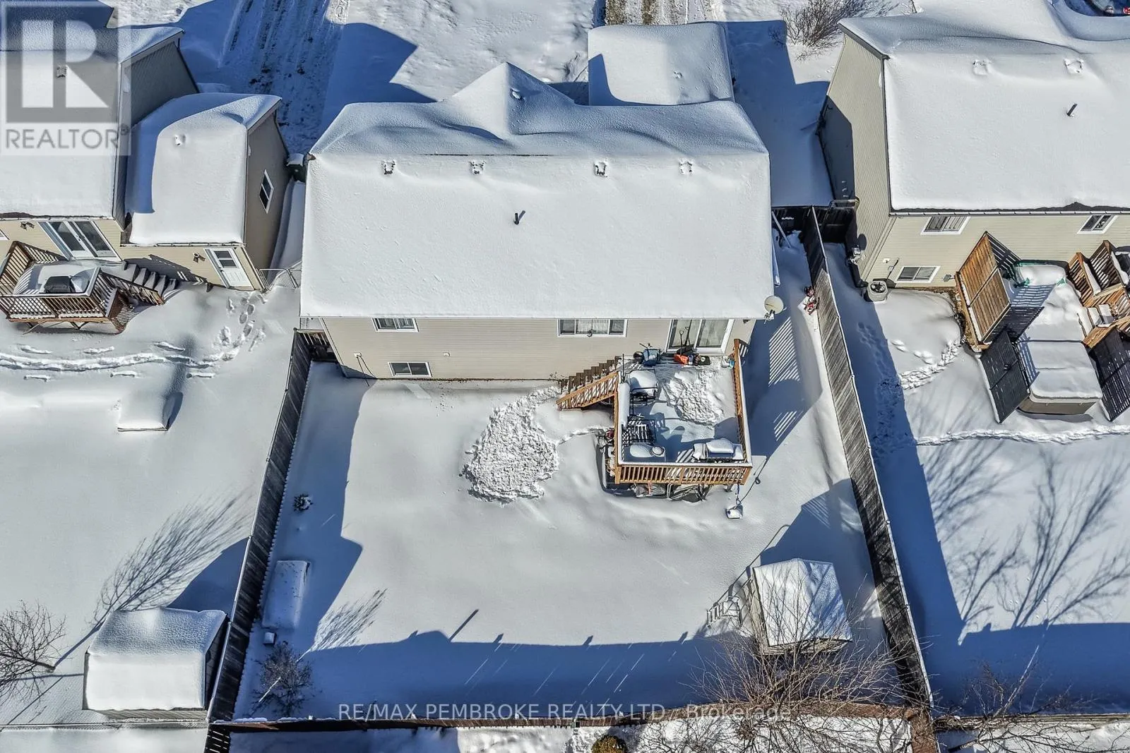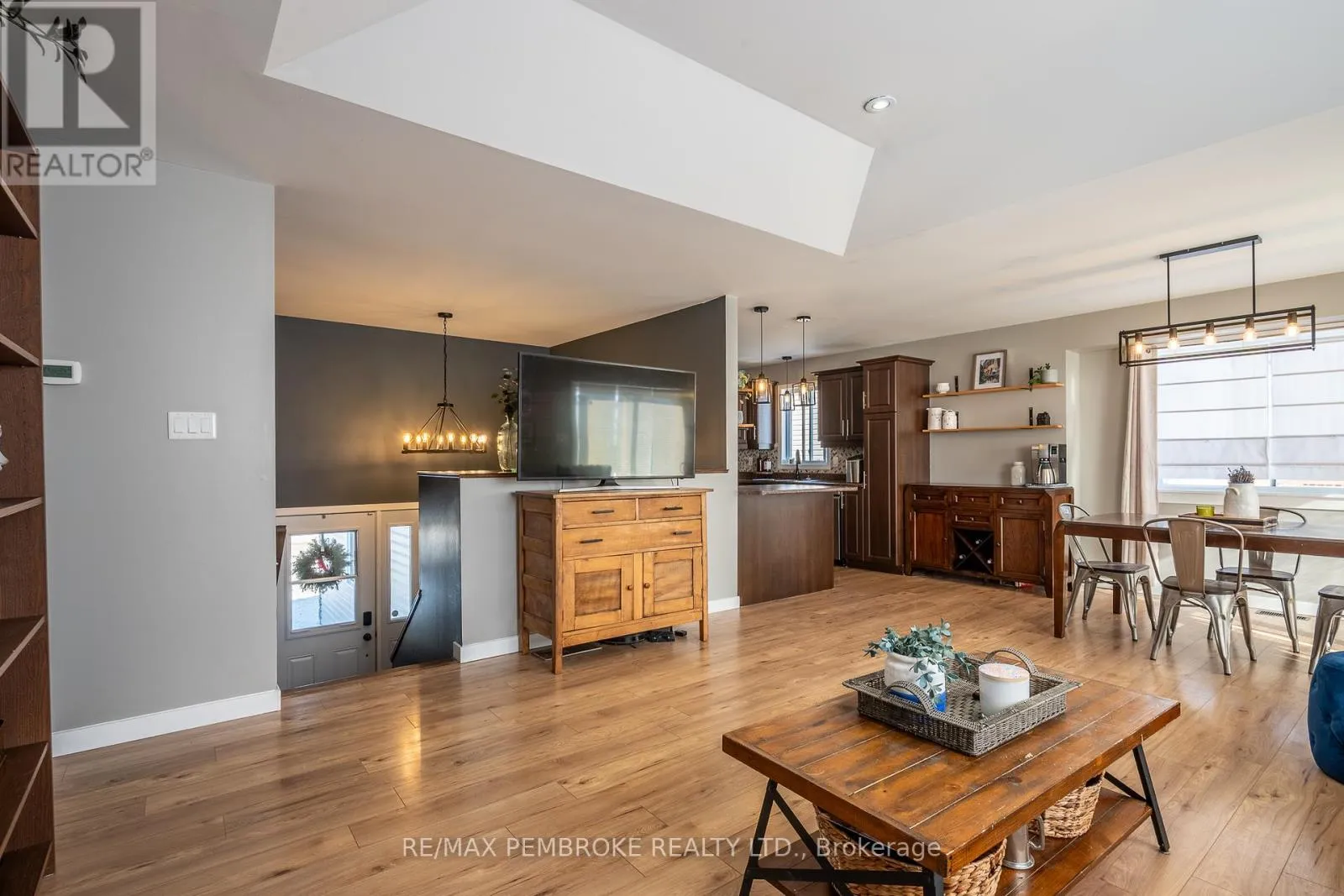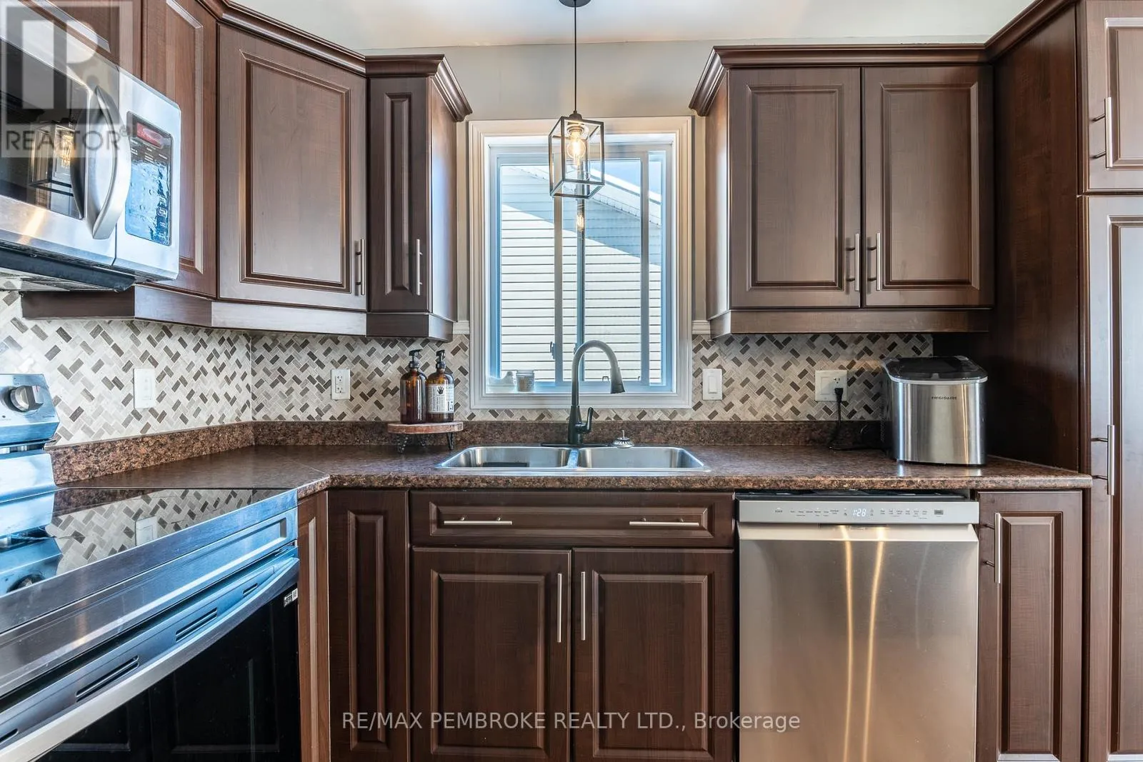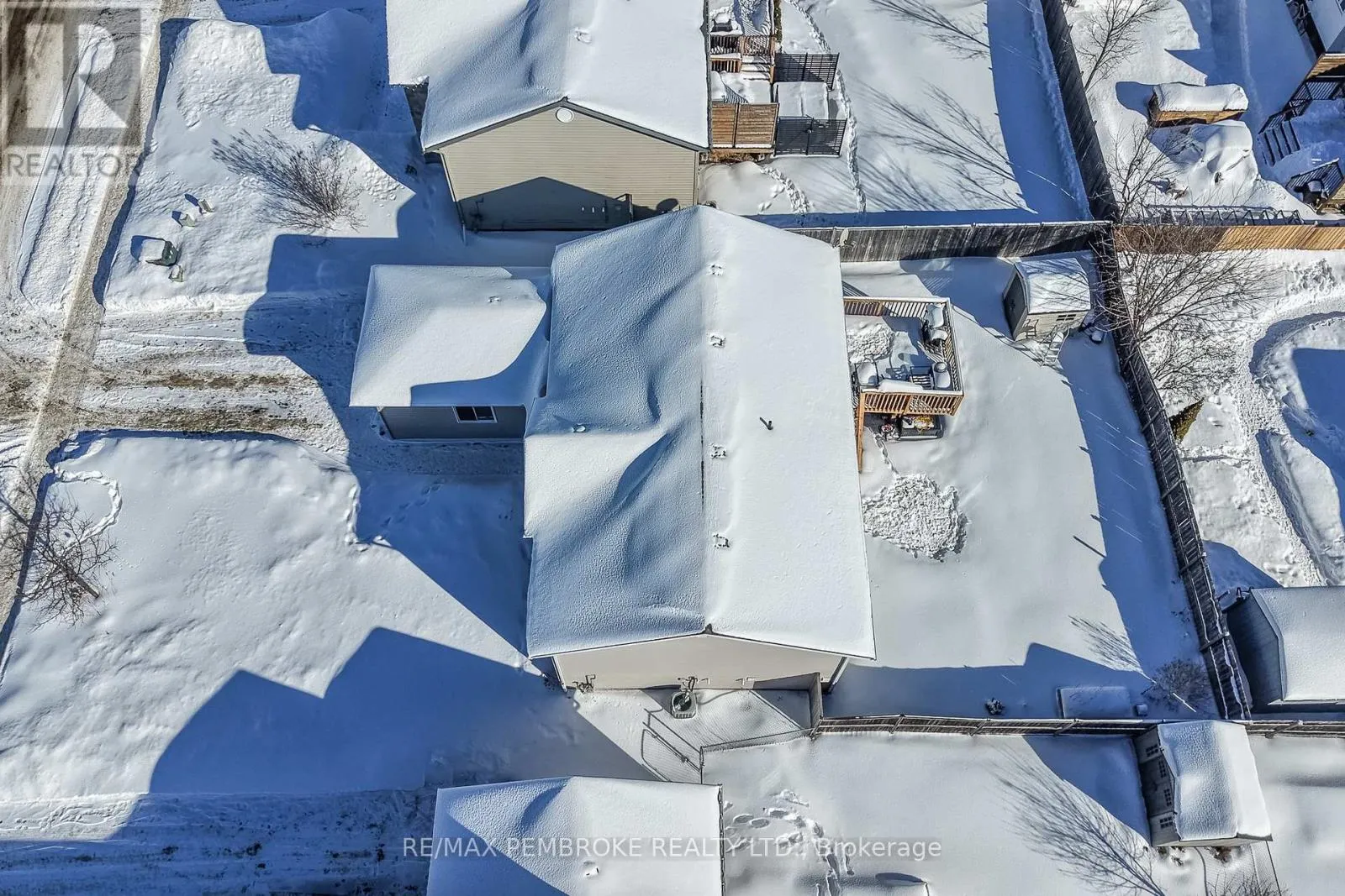 Cross Streets: Riverstone Tr and Limestone Tr. ** Directions: Laurentian Dr to Limestone Tr, then right onto Riverstone OR or Petawawa Blvd to Limestone Trail, then left onto Boulder Creek and right onto Riverstone. Welcome to this bright and welcoming home, ideally situated close to schools, parks, shopping, and more. You will appreciate the lovely curb appeal with gardens, and once inside, you will find a spacious and functional foyer with access to the attached garage. The upper level offers an open-concept layout that is perfect for both everyday living and entertaining, and is complete with elegant light fixtures. The living room flows seamlessly into the dining and kitchen areas, where you will find additional prep space and seating at the peninsula, ample cabinetry, and a sliding door leading outside to the 12'x14' composite deck with access to the fenced yard. This is the ideal spot to host summer barbecues or have your morning coffee with the sunrise. The main level includes a primary bedroom, which you enter through French doors, two additional bedrooms and a full bathroom with a convenient linen closet. The lower level features two more gathering spaces offering plenty of flexibility for a home office space, play area or gym. A fourth bedroom and a second full bathroom adorn this level. If you are looking for additional space for your outdoor equipment or a work kit, there is a bonus storage room approximately 6'x10' with shelves. Once outside, you will enjoy the fenced backyard, complete with a shed for quick and easy storage of your garden tools. Perfectly located in the desirable Limestone Trail subdivision, this home is a fantastic opportunity for anyone looking for a great balance of space, comfort, and convenience. (id:27476)