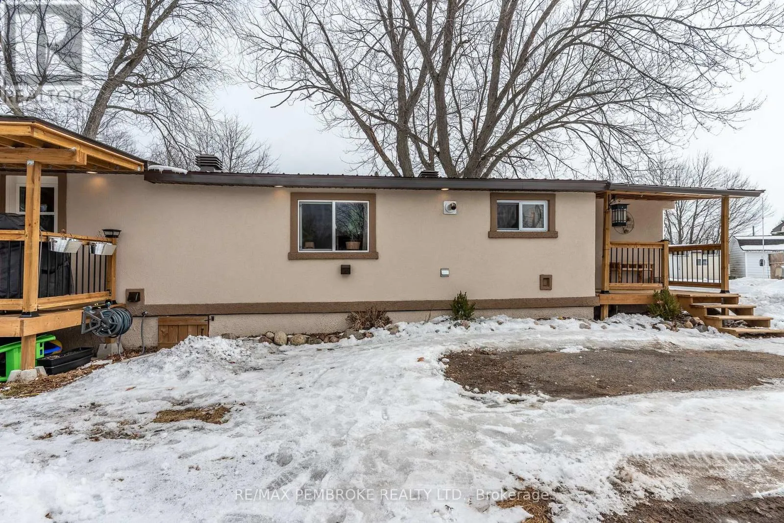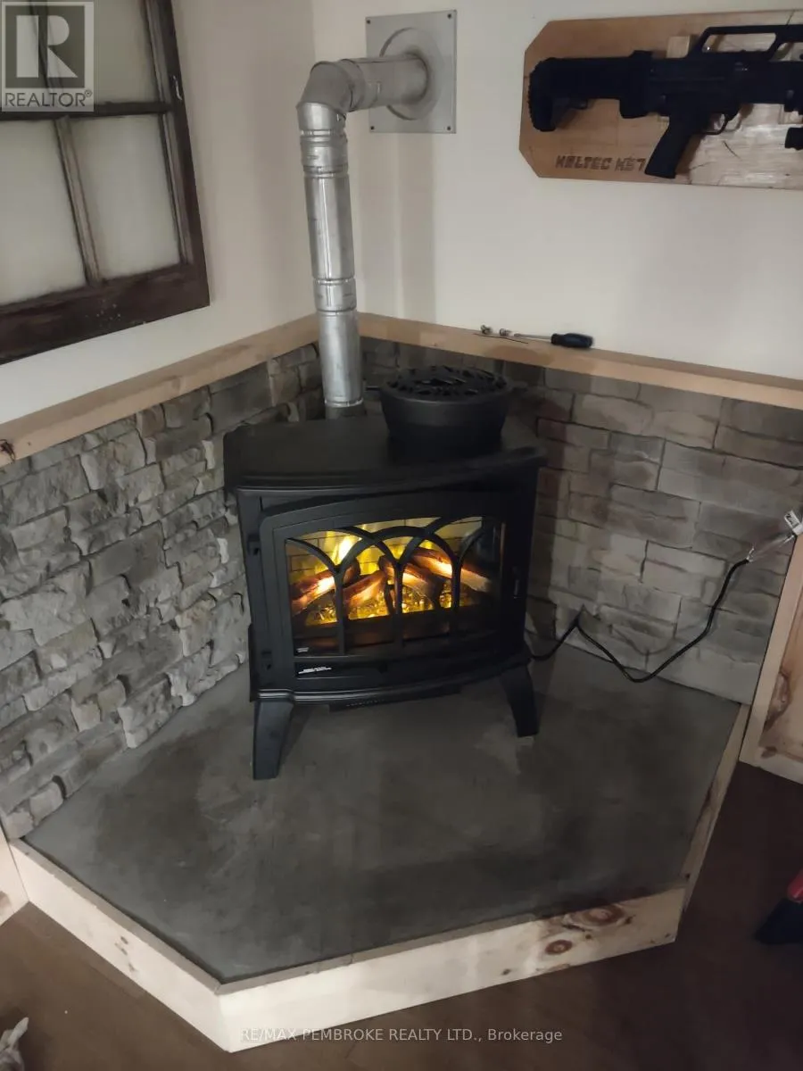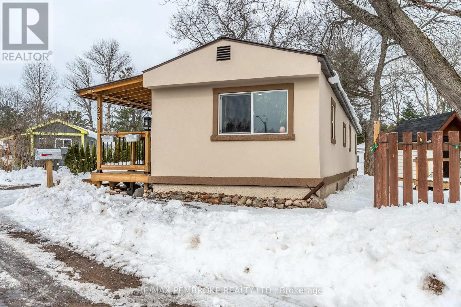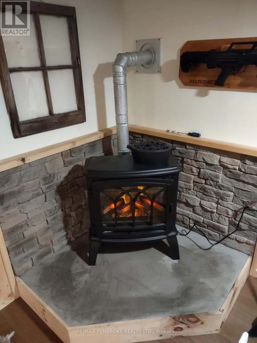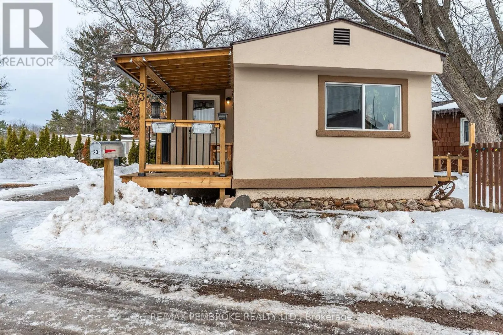 Cross Streets: Pinehurst Estates x Petawawa Blvd. ** Directions: Petawawa Blvd to Pinehurst Estates - make a right at the first opportunity, and then a left at the 2nd road. #23 will be on your right. This beautifully renovated 2-bedroom, 1-bathroom mobile home is ideal for a single professional, couple, or small family and offers a rare blend of rustic charm and modern comfort. Extensive updates have been completed both inside and out, giving peace of mind for many years to come. Exterior improvements include new eavestroughs, a durable metal roof [Nov 2024], updated windows and doors-including stylish sliding barn doors [2025]. Exterior walls re-done with new plywood, Tyvek, and Styrofoam insulation and finished with clean, modern stucco [2025]. Step inside and you'll immediately feel the warm, relaxing atmosphere. The interior has been completely transformed with rustic pine, creating a cozy yet modern aesthetic. A brand-new electric fireplace/heater adds to the ambiance, making the home comfortable year-round. New flooring and lighting flow throughout, enhancing the bright and inviting feel. The custom kitchen is a standout feature, complete with under-cabinet lighting and a beautiful stone backsplash. The updated bathroom feels spa-like, featuring a freshly tiled rain-shower, and a deep soaker tub - perfect for unwinding at the end of the day. The laundry area includes a laundry sink, newer dryer vent, and convenient access to the side deck. Outside, enjoy a nicely landscaped green space with new topsoil and sod [2025] and a garden. Two storage sheds provide plenty of room for tools and outdoor gear, and a recently added generator plug adds extra convenience and preparedness. Lot fees are currently ~$600 per month, however fees will be different for future owner. This location offers excellent walkability, with nearby shopping, restaurants, and the Catwalk just minutes away, as well as quick access to Garrison Petawawa. Thoughtfully renovated and truly move-in ready, this home offers comfort, character, and value in a fantastic location. 48 Irrevocable on all offers. (id:27476)