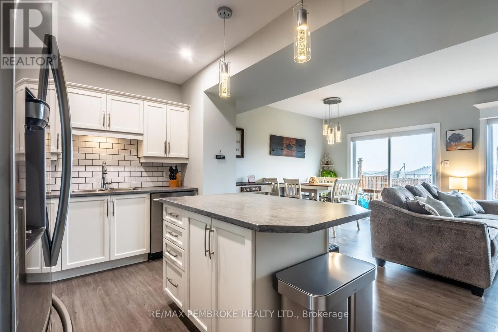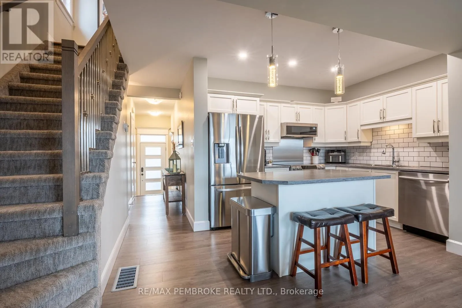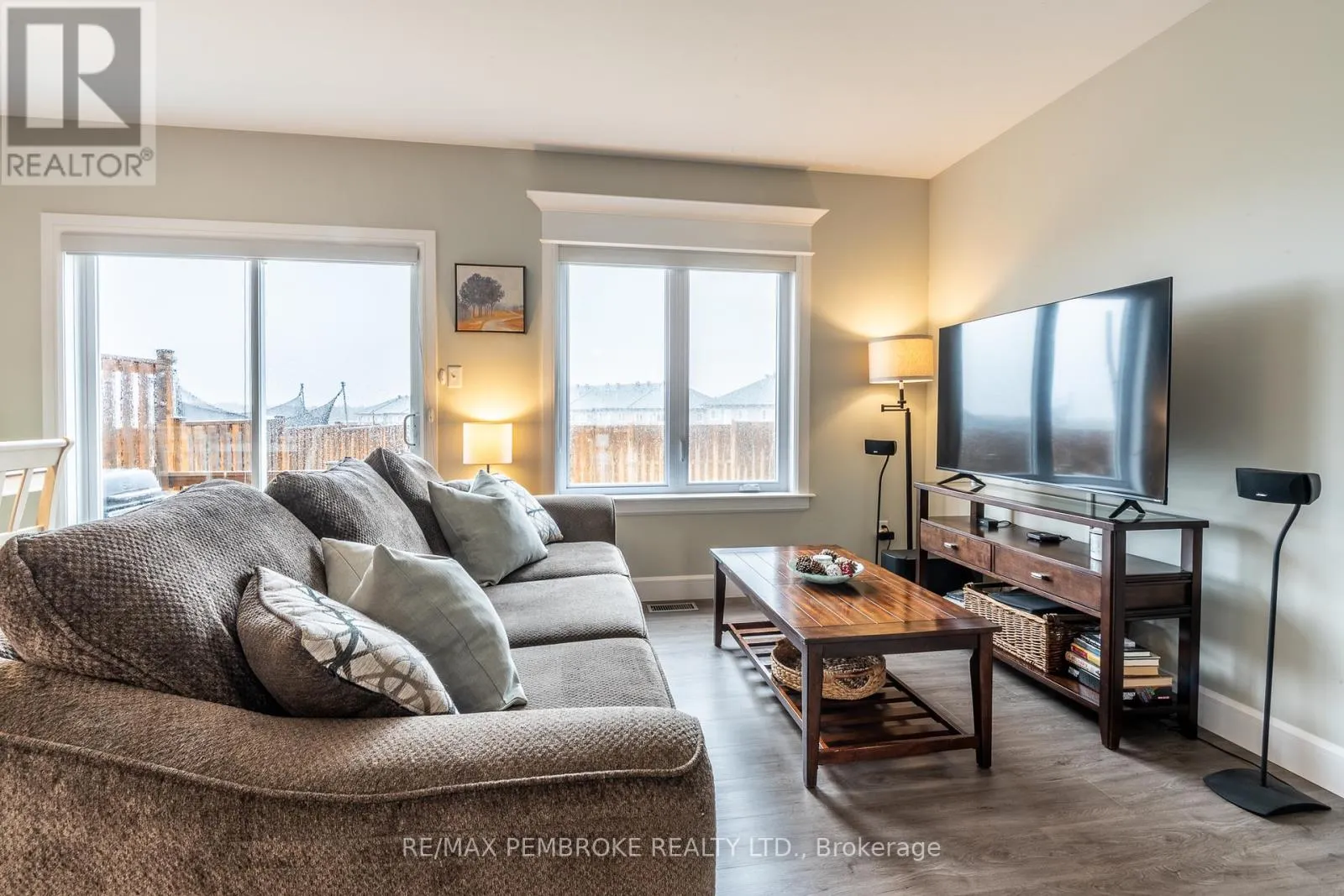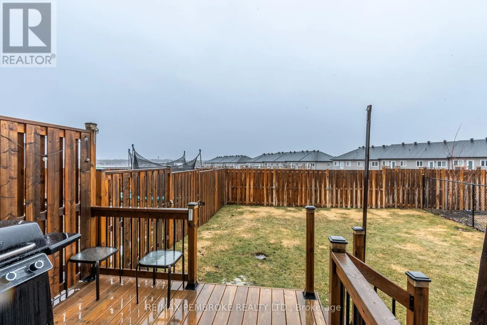 Cross Streets: Murphy & Butler. ** Directions: Petawawa Blvd to Murphy, onto Butler and left onto Chad St. This modern, beautifully maintained three-bedroom, three-bathroom end-unit townhouse is ideal for someone looking for quality finishes, style, and added natural light throughout with addition windows on the side. Bright and airy, this move-in ready home is well suited for owner-occupancy or as an investment property. The main floor features an open-concept living, dining, and kitchen layout with 8.5-foot ceilings, large windows, and patio doors leading to a deck with a privacy partition, perfect for outdoor lounging. The generous kitchen is finished with plenty of custom cabinetry, a large island with additional seating space, and stainless-steel appliances. The main floor is completed with a convenient powder room and foyer with a large closet and direct access to the attached garage. Durable and luxurious vinyl plank flooring runs throughout the main and second levels, while all bathroom floors are finished with beautiful tile. The large primary suite includes an impressive walk-in closet and a full ensuite with a walk-in shower. Two additional bedrooms share a full bathroom, making this layout perfect for family or guests. The upper floor is complete with a handy laundry closet and a large linen closet. The lower level offers a spacious family room as well as a large, enclosed storage area. Outside, the fully fenced yard adds privacy and functionality, while the paved driveway is extra wide and can comfortably accommodate three vehicles. This home also offers the added convenience of an attached garage with an automatic opener. Close to Garrison Petawawa and a short commute to Highway 17 and CNL, this location is fantastic. Minimum 24 hour irrevocable on any written Offer from a Buyer. (id:27476)