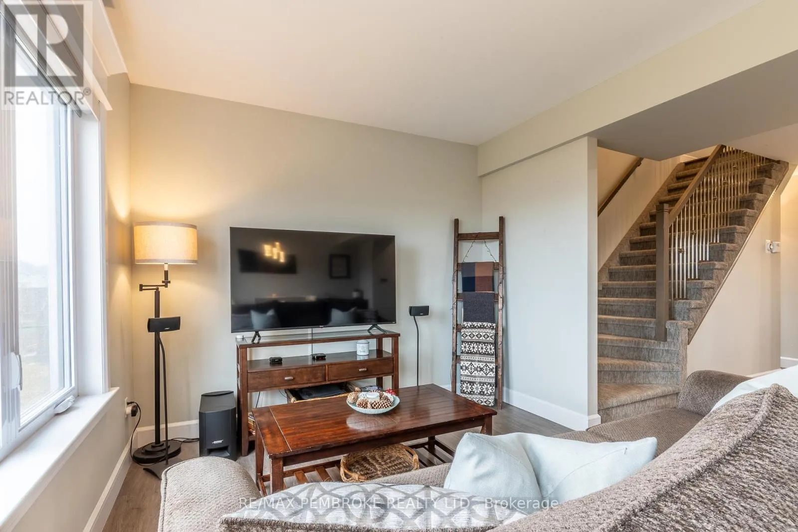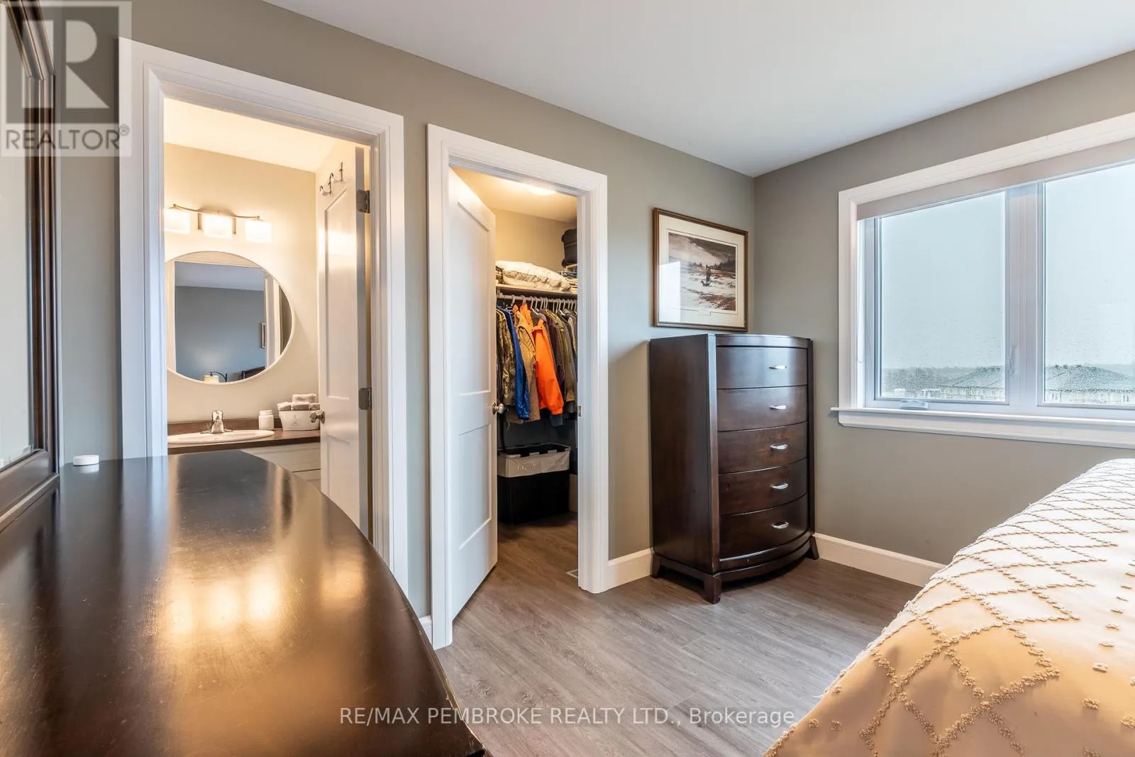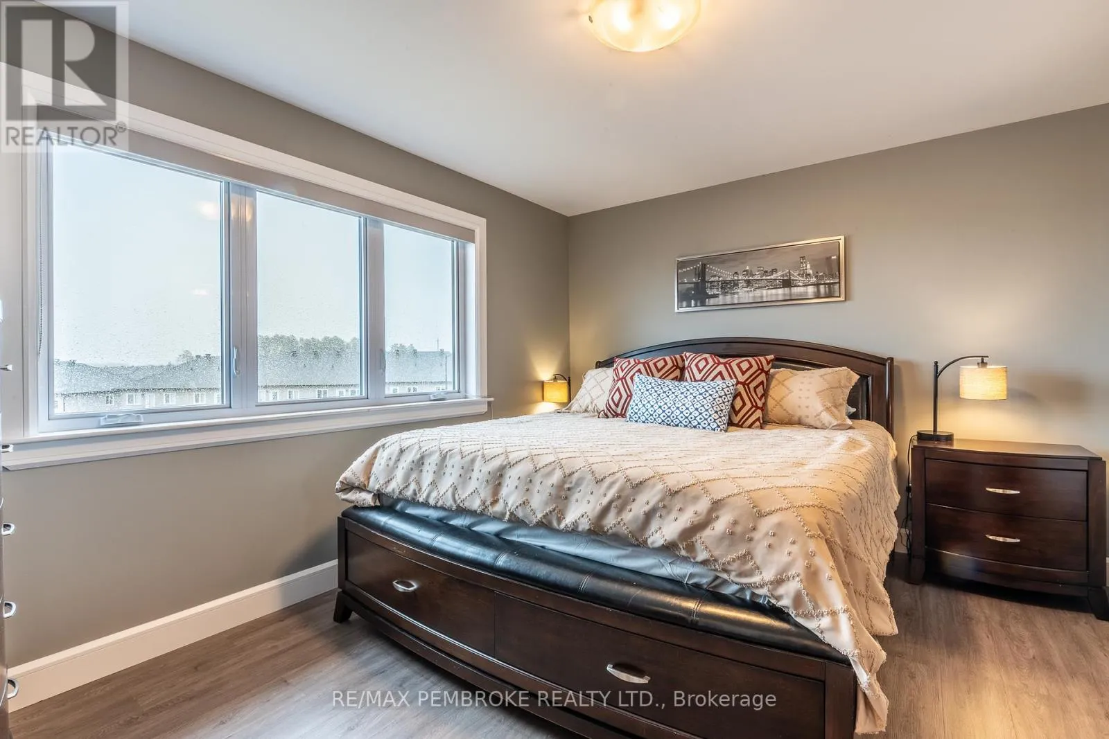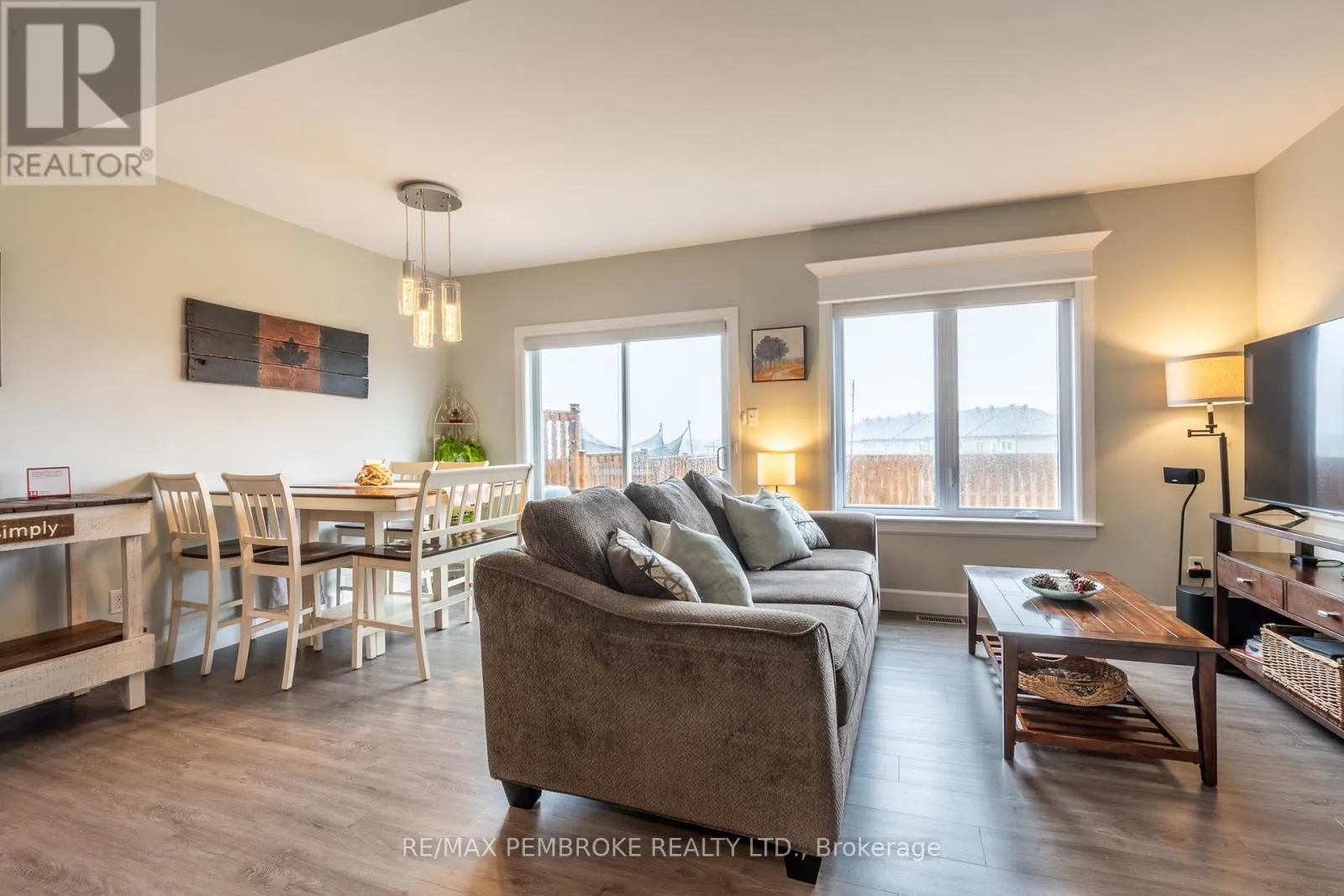 Cross Streets: Murphy & Butler. ** Directions: Petawawa Blvd to Murphy, onto Butler and left onto Chad St. This modern, beautifully maintained three-bedroom, three-bathroom end-unit townhouse is ideal for someone looking for quality finishes, style, and added natural light throughout with addition windows on the side. Bright and airy, this move-in ready home is well suited for owner-occupancy or as an investment property. The main floor features an open-concept living, dining, and kitchen layout with 8.5-foot ceilings, large windows, and patio doors leading to a deck with a privacy partition, perfect for outdoor lounging. The generous kitchen is finished with plenty of custom cabinetry, a large island with additional seating space, and stainless-steel appliances. The main floor is completed with a convenient powder room and foyer with a large closet and direct access to the attached garage. Durable and luxurious vinyl plank flooring runs throughout the main and second levels, while all bathroom floors are finished with beautiful tile. The large primary suite includes an impressive walk-in closet and a full ensuite with a walk-in shower. Two additional bedrooms share a full bathroom, making this layout perfect for family or guests. The upper floor is complete with a handy laundry closet and a large linen closet. The lower level offers a spacious family room as well as a large, enclosed storage area. Outside, the fully fenced yard adds privacy and functionality, while the paved driveway is extra wide and can comfortably accommodate three vehicles. This home also offers the added convenience of an attached garage with an automatic opener. Close to Garrison Petawawa and a short commute to Highway 17 and CNL, this location is fantastic. Minimum 24 hour irrevocable on any written Offer from a Buyer. (id:27476)