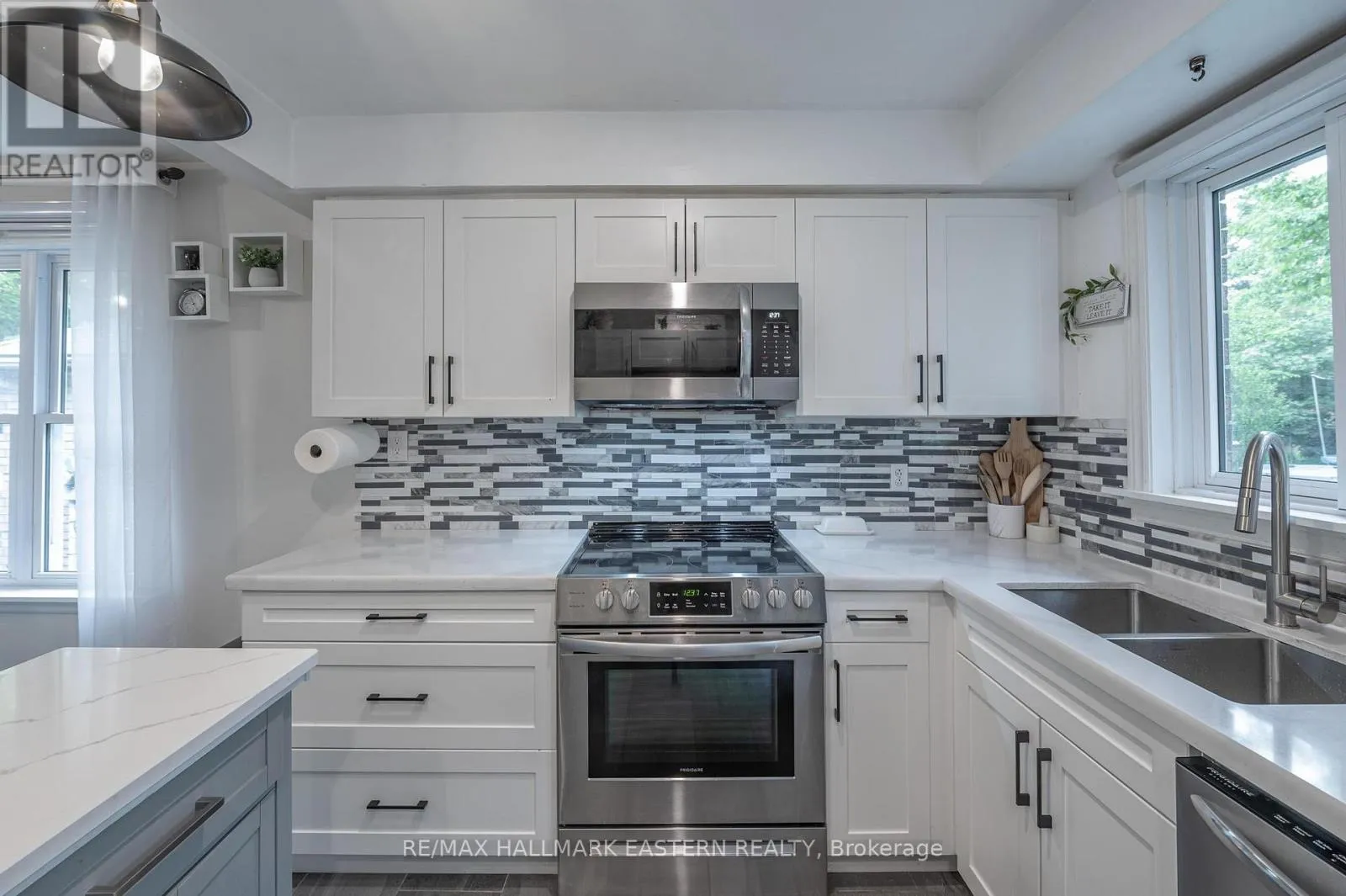 Cross Streets: Chemong Rd / Towerhill Rd. ** Directions: Chemong Rd, North East on Towerhill Rd. Welcome to this charming brick bungalow in a sought-after neighborhood ready for you to move in and make it yours! The main floor has been beautifully renovated with brand-new flooring throughout. You'll love the newly open-concept kitchen, complete with stainless steel appliances, quartz countertops, a custom backsplash, a spacious island, and a coffee bar with built-in shelving. Down the hall, you will find a fully renovated bathroom with quartz countertops, a generous primary bedroom featuring his and her closets and a second well-sized bedroom completing the main level. Downstairs, enjoy a spacious family room, third bedroom, a 4-piece bathroom, and a laundry room for added convenience. Step outside into your private backyard, featuring a covered deck, storage shed, and a separate patio for entertaining.The front driveway offers the potential for side-by-side parking, adding to the home's functionality. Stylish, spacious, and move-in ready, this home blends comfort, design, and practicality in one perfect package. (id:27476)