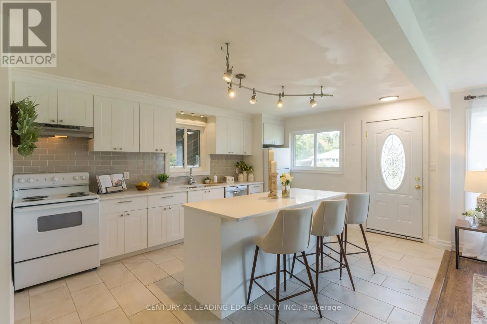 KAWARTHA HEIGHTS & SPRINGBROOK DR. RENT IN THE DESIRABLE WEST END OF PETERBOROUGH! Come home to this beautiful all brick bungalow. Updated modern all white kitchen with ample storage and complete with quartz counter tops and a large center island and breakfast bar. Living, Dining and Bedrooms graced with hardwood floors. The kitchen overlooks the living and dining room for a great open concept layout. The living Room boasts a large picture window. All 3 bedrooms generous in size and complete with closets and large windows. Convenient 2 car parking. Use of large backyard. Walk out to your large composite 17 1/2' x 6' Deck complete with glass railings and enjoy your morning coffee or your evening unwind. Walking distance to shopping, schools and the local college. Easy access to and from the city at Hwy 115 for commuters. Tenants responsible for their own snow removal. Landlord will handle all other exterior yard maintenance and grass cutting. Don't miss your chance to live in a great home in an amazing neighbourhood. Exhaust Range and new thermostat being installed prior to Occupancy. This property is available for immediate occupancy. Exhaust Range and New Thermostat being installed prior to occupancy. (id:27476)