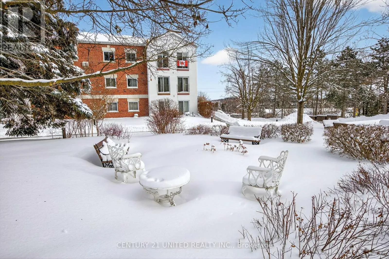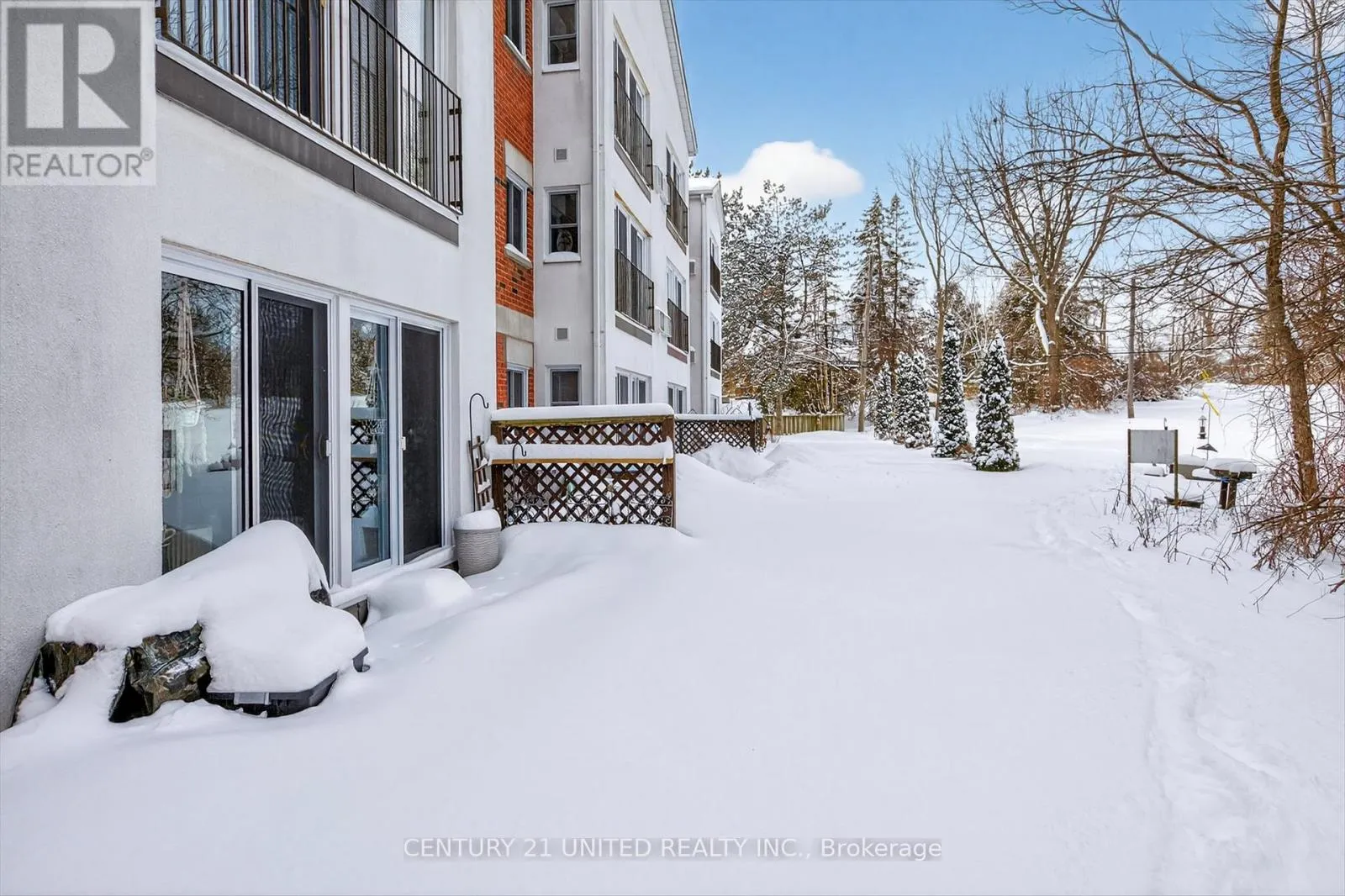 Water Street & Marina Blvd A perfect two bedroom, two bath, level entry ground floor condominium in "The Maples", offering truly carefree living. This home is in tip top condition, newer flooring, in-suite laundry, some updates in the baths, and newer fridge and stove. Bright living and dining areas with 2 sets of patio doors opening to a private patio, gardens and a wooded area with the babbling waters of Bears Creek. Convenient underground parking, meeting/party room, library, gym, storage, ample visitor parking and plenty of outdoor areas to enjoy. A lovely place to call home. (id:27476)