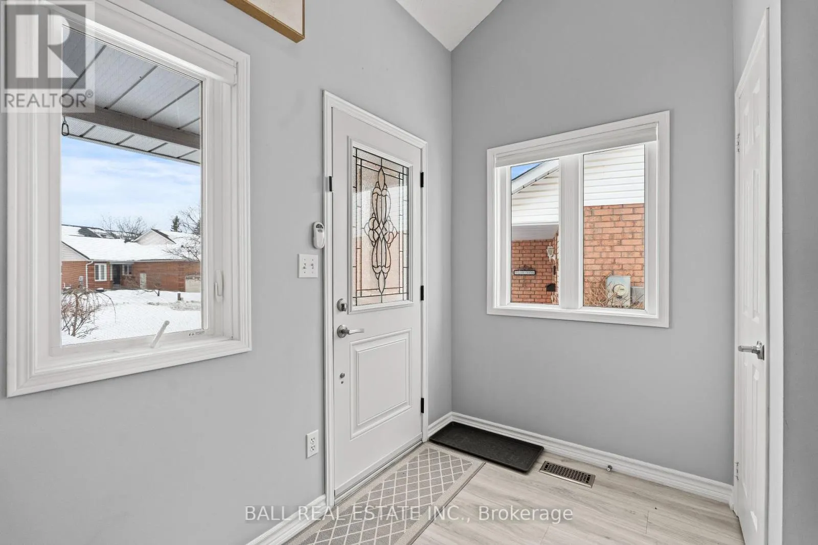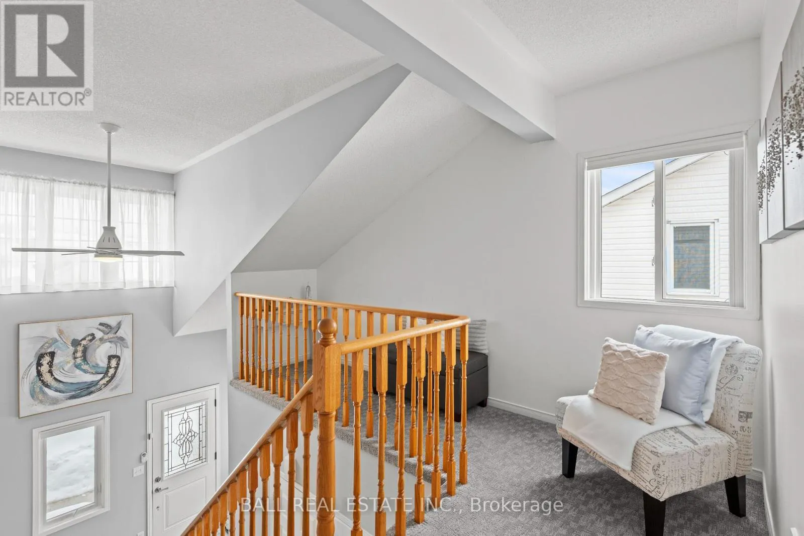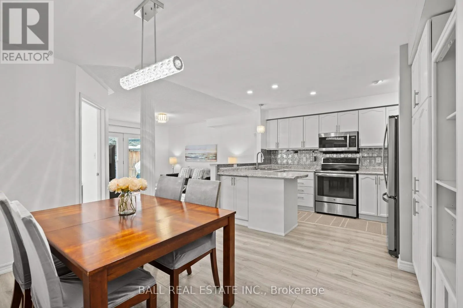 Glenforest Blvd and Eagle Cres Welcome to 1263 Eagle Crescent, a warm and inviting home tucked into one of Peterborough's sought-after West End neighbourhoods. Set on a quiet street and backing onto green space with a pond beyond, this property offers a rare balance of privacy and comfort while being just minutes to everyday conveniences and PRHC. The main level features a bright open-concept layout where the living, dining, and kitchen areas flow naturally together, creating a functional space for both daily living and gathering with family and friends. Large windows fill the space with natural light, and the majority of the home has been freshly painted with updated lighting fixtures throughout, giving it a clean, refreshed feel. The primary bedroom is conveniently located on the main floor along with an updated full bathroom and the added practicality of main-floor laundry. Upstairs, you'll find two additional bedrooms and another updated full bathroom, offering great separation for kids, guests, or a home office setup. Step outside to the backyard designed for both relaxation and entertaining, including a new wooden fence along the east side for added privacy. The deck features a retractable remote-controlled awning and a direct gas line hookup for the BBQ, perfect for summer evenings. The yard is supported by an ELF sprinkler system, and the 1.5 car garage includes a work bench for hobbies or storage. Located close to parks, schools, shopping, and amenities, this home combines everyday convenience with a peaceful residential setting. Cozy, functional, and thoughtfully updated in a family-friendly neighbourhood, it's a wonderful place to call home. (id:27476)
