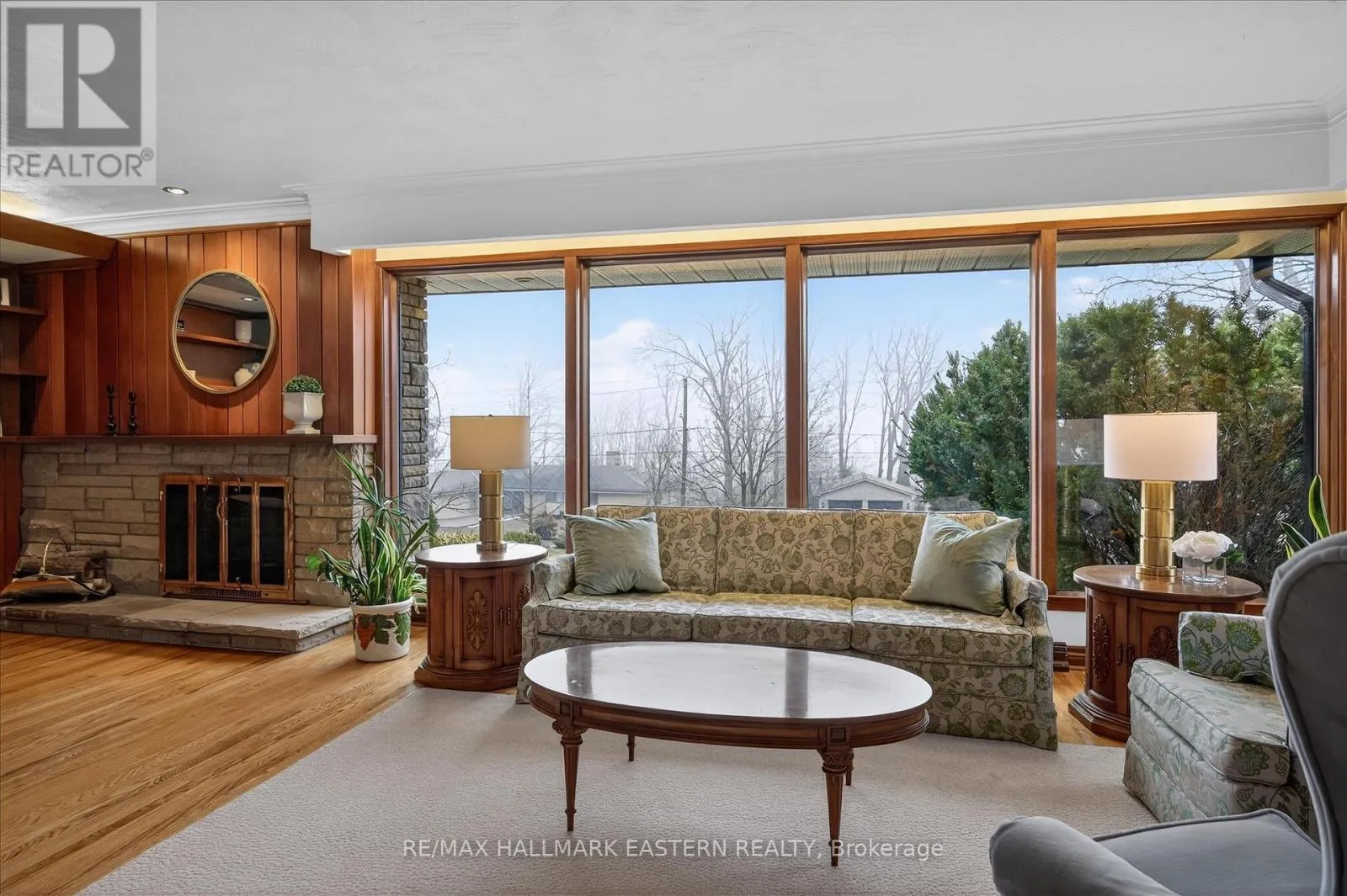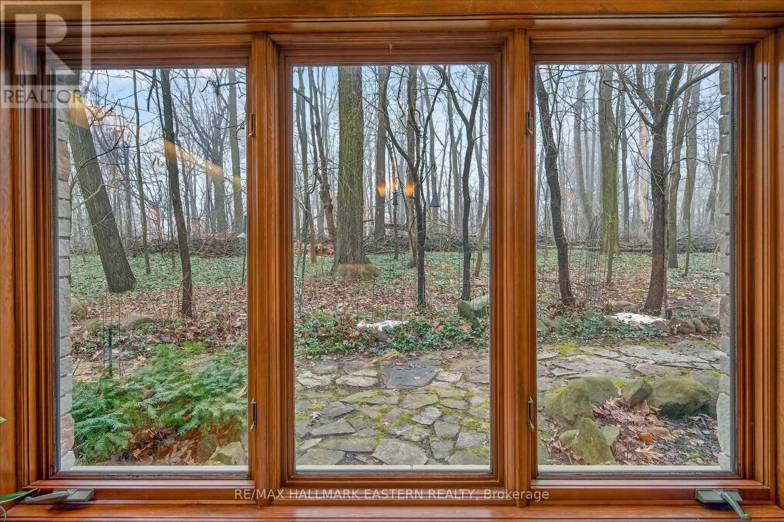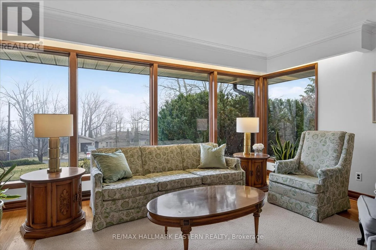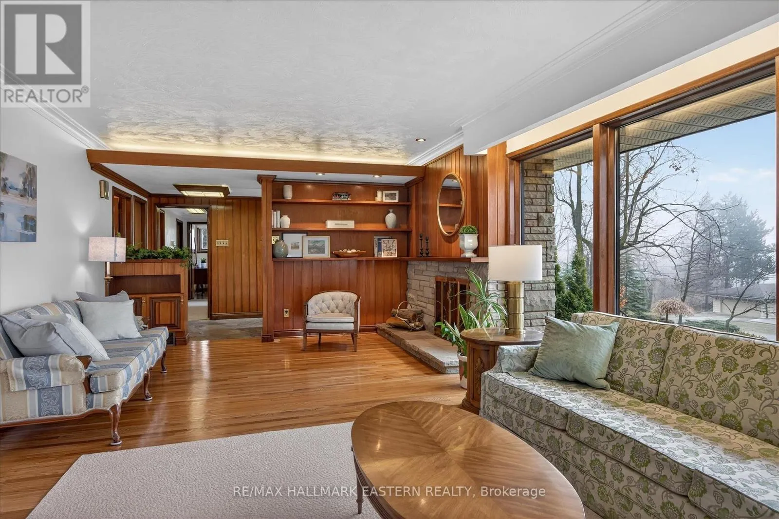 Cross Streets: kawartha Heights and Crestwood Ave. ** Directions: Sherbrooke St, south on Woodglade, first right on Ridgewood Road to 143. Rare opportunity to own this executive custom-built brick bungalow in one of Peterborough's most desirable west-end neighbourhoods. Situated on an elevated 1/2 acre private lot, this home offers sweeping views and backs directly onto the forested Oakwood Park. From the street the home exudes curb appeal with it's light shade of brick and stone complemented by dark trim. The interior features spacious primary rooms starting with the expansive living room (528 sq ft) a true showstopper, boasting floor-to-ceiling windows, luxurious wood accents and a wood-burning fireplace. The dining room includes a built in buffet and walk out to a screened in room, perfect for hot summer dining. The kitchen, featuring custom wood cabinetry, flows seamlessly into a spacious family room with sliding doors leading to a private flagstone patio. The main level includes three bedrooms and two bathrooms, including the primary ensuite with soaker tub. And if additional living space is needed the basement provides a versatile recreation room with a second wood fireplace, a home office, a third bathroom, and direct garage access, offering excellent in-law potential. Enjoy the tranquility of a quiet, treed setting while remaining minutes away from top-rated schools, grocery stores, and public transit. This home perfectly blends nature-inspired living with modern convenience. Experience the best of west-end living on a quiet street where you can hear the birds. (id:27476)