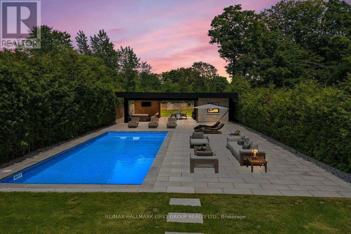 Altona / Sheppard Welcome to this spectacular custom executive home, nestled on a RARE 374FT DEEP PREMIUM LOT offering ultimate privacy and serenity. Surrounded by trees and fully fenced, the professionally landscaped backyard is a true oasis featuring over $200K in recent upgrades. Enjoy resort style living with an INGROUND SALTWATER POOL with automatic cover, expansive patio, and stunning covered cabana with pot lights and gas lines ready for your firepit and BBQ. Whether you're entertaining guests or enjoying a quiet evening outdoors, the large grassy area and ambient lighting create the perfect setting. Inside, enjoy luxury finishes throughout, including hardwood floors, smooth ceilings with elegant crown moulding, pot lights, and generously sized rooms. The gourmet eat-in kitchen boasts stainless steel appliances, a center island with breakfast bar, a butlers pantry with prep sink, walk-in closet, and ample storage. The great room features soaring ceilings, and the main floor includes a private office. Upstairs, the primary suite offers double-door entry, vaulted ceilings, a 6-piece spa-like ensuite, and his/her walk-in closets. Oversized secondary bedrooms come with ensuites or semi-ensuites. Additional highlights include a balcony library/piano room and an unspoiled basement ready for your personal touch! With a spacious double car garage and third tandem spot, this home truly has it all - just minutes to the 401, the GO Station, shopping, restaurants, schools, and parks. (id:27476)