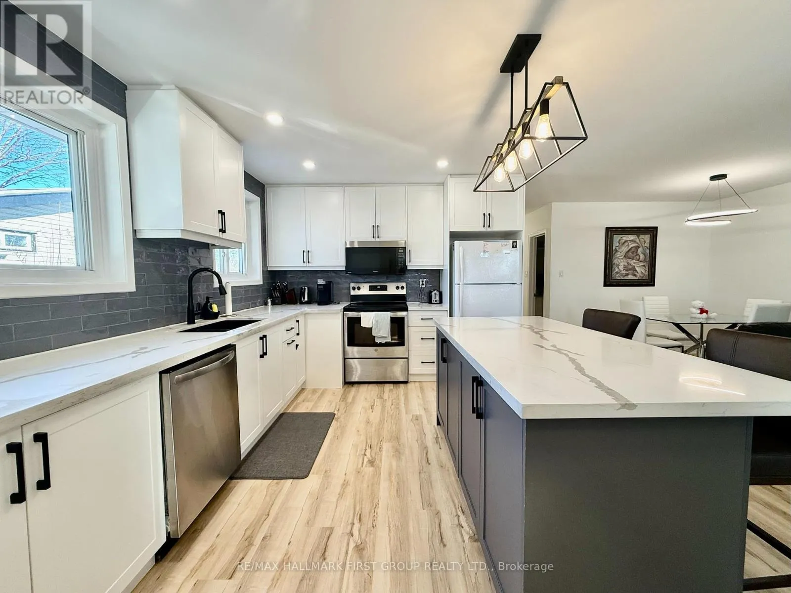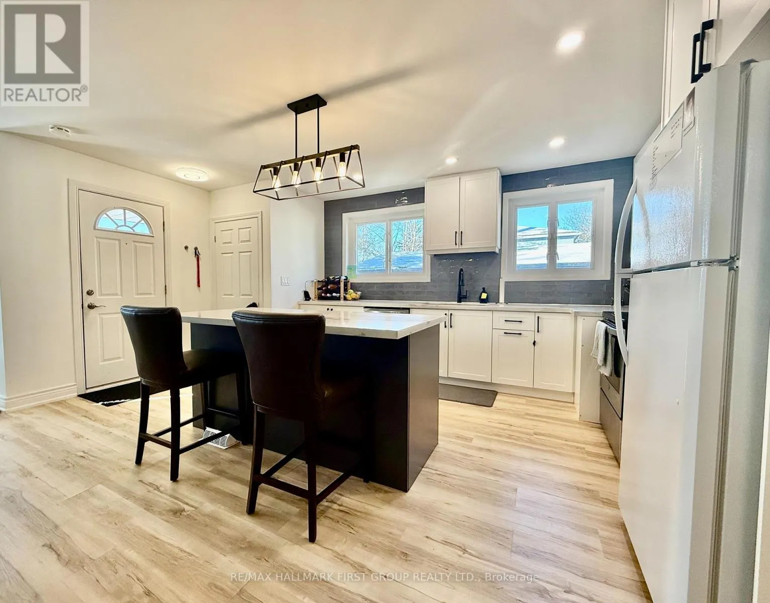 Liverpool / Tatra This fully renovated and meticulously maintained three-bedroom bungalow delivers modern comfort in an exceptional Pickering location. Just steps from the waterfront, dining, Pickering Town Centre, the GO Station, transit routes, schools, and parks; everything you need is right at your doorstep. Inside, a thoughtfully designed open-concept layout features large living and dining areas filled with natural light from oversized windows. The gourmet kitchen is equipped with quartz countertops, a custom backsplash, and an oversized breakfast bar, making it ideal for both everyday living and entertaining. Three well-proportioned bedrooms offer ample closet space and bright windows. Additional highlights include a renovated three-piece bathroom, carpet-free interior, ensuite laundry, private entrance and convenient parking for two vehicles. (id:27476)
