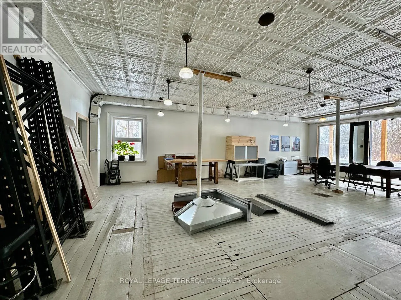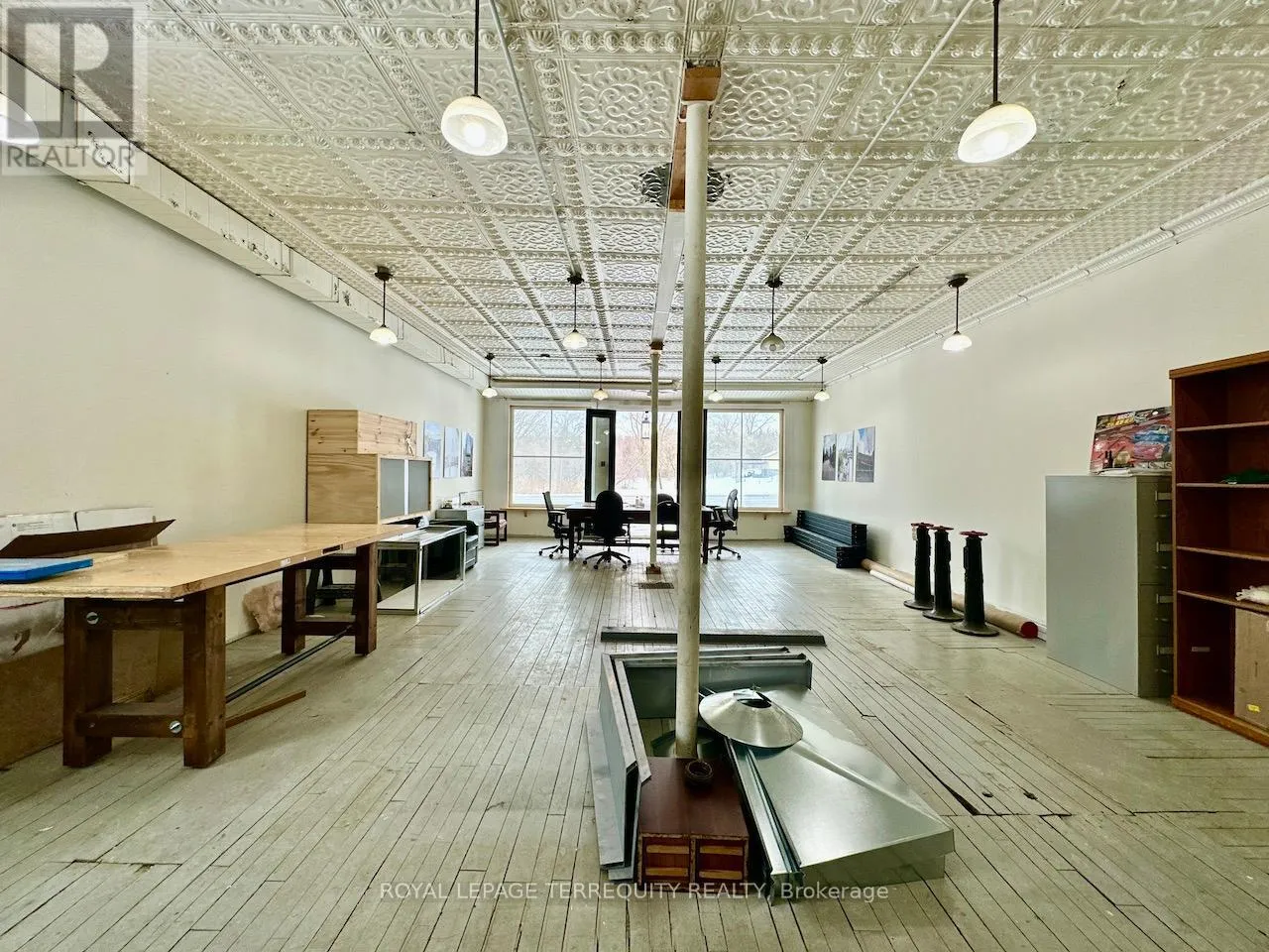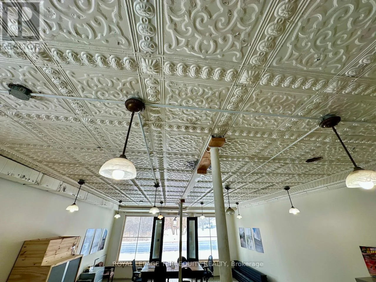 Cross Streets: Hwy 7 & York Durham line. ** Directions: Look for white siding and wood columns on building just east of York Durham Line. The building is situated on the North side of Hwy 7, formerly the site of Saunders Book Store. Newly renovated high exposure historic landmark building with professional tenant mix situated just east of York Durham Line in the quaint hamlet of Green River immediately on Highway 7 (formerly known as the Saunders Book Store). Conveniently located just east of Markham along the north west border of Rural Pickering. Ideally suited for office or similar use. Suites/ offices range from 156 - 569SF. See floor layout plan showing main and upper floors. E1 & E2 is a large 1041SF Build-To-Suit open concept shop front opportunity with a covered porch walk-way a a main double-door entrance, a rear entrance/ exit, high tin finished ceilings, and extensive lighting. The suite fronts onto Hwy 7 providing excellent street exposure with short term visitor parking immediately in front. The gross lease referenced herein allows for base building finishes in keeping with the building. Landlord Improvements may be subject to additional expense and can be negotiated into the gross lease. There are three common washrooms. Each unit comes with its own designated parking(s) Utilities (gas/ water/ hydro) are included. The interior of the building impresses with period correct materials throughout. Finishes include mosaic tilework, hardwood, high baseboards, crown mouldings, ornate trimwork, coffered/ tin ceilings, oversized vertical sliding slash styled windows that crank open, exposed wood, brickwork, and more. All office are sizeable, bright, and airy with ample separation from neighbouring suites. Office furniture can form part of the lease subject to availability. (id:27476)