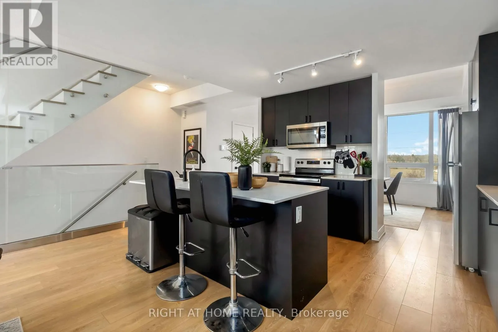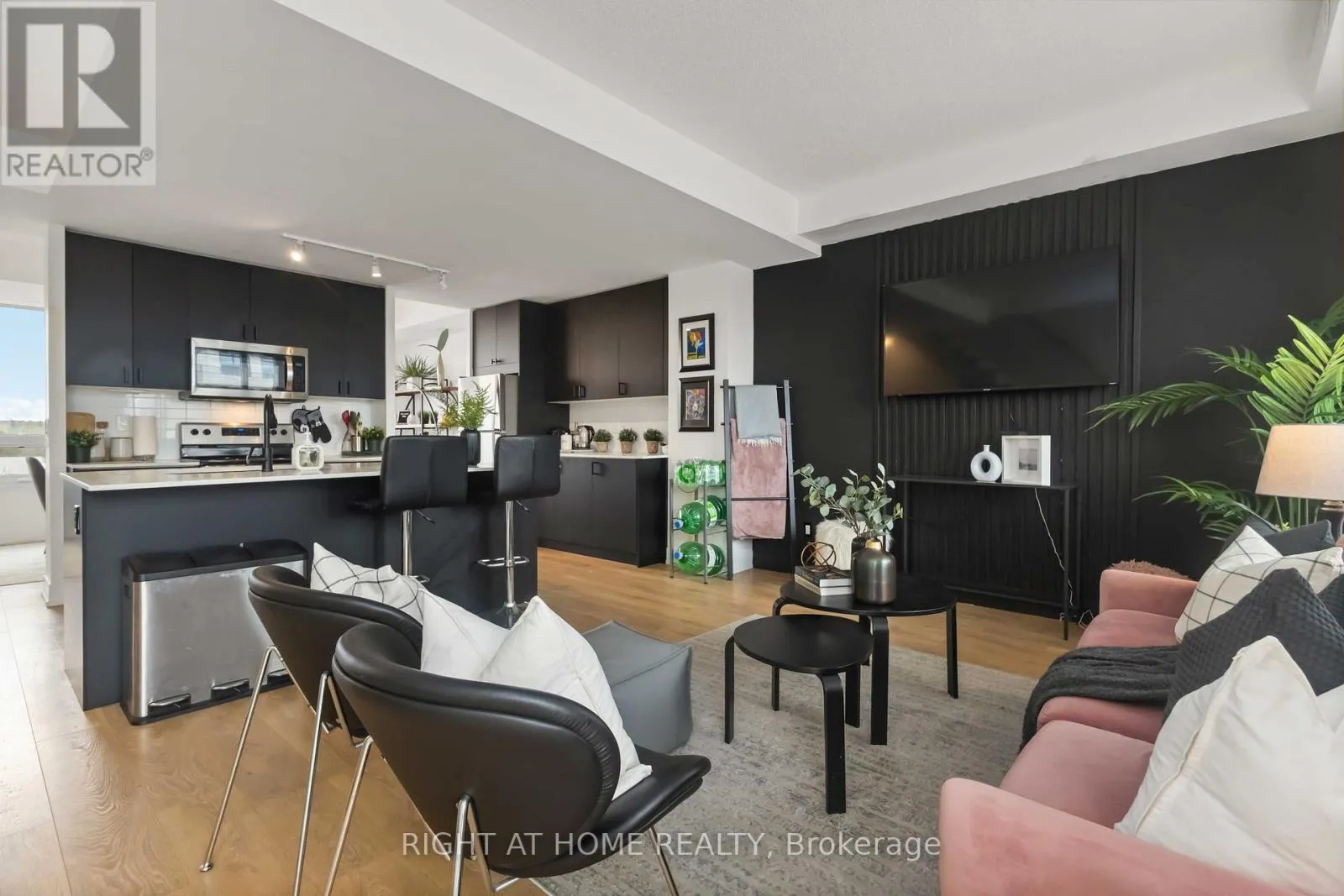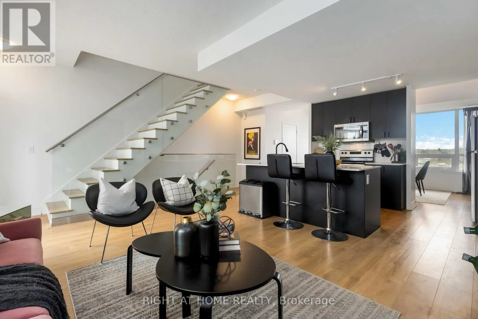 Liverpool/Bayly Modern style, resort-inspired amenities, and a location that puts everything within reach. This townhome feels less like a property and more like your own urban retreat. The South Beach-influenced 3-bed, 3-bath layout features a bright open concept kitchen featuring sleek black cabinetry (2025), stainless steel appliances, and a spacious centre island perfect for gathering or cooking. The open concept main floor creates an easy flow from the kitchen to the dining area as well as to the bright living room with modern finishes and is filled with natural light and a walkout to a private deck. The main floor powder room was recently updated (Dec 2025), Upstairs, the primary bedroom includes a 3-piece ensuite and a wall-to-wall closet. The second bedroom has its own balcony, while the third bedroom offers flexibility with other uses such as a home office, nursery, or guest room. When you're ready for some outdoor time, the rooftop terrace delivers..It's ideal for hosting friends, morning coffees, unwinding after work, or taking in panoramic views of the skyline and the surrounding neighbourhood. Monthly fees include Rogers Ignite TV & Internet as well as use of the community amenities including a full fitness centre (no expensive gym membership required), an outdoor pool with lounge areas, BBQ area, party/meeting room, guest suite, and more. The location is a standout being only minutes to Pickering GO, Highway 401, and Pickering Town Centre, with waterfront parks, trails, and the marina close by. Restaurants, shops, schools, and daily conveniences are all within easy reach. Whether you're moving up, scaling down, or simply craving a blend of comfort, style, and convenience, this home delivers it all-move-in ready and waiting for its next chapter. (id:27476)