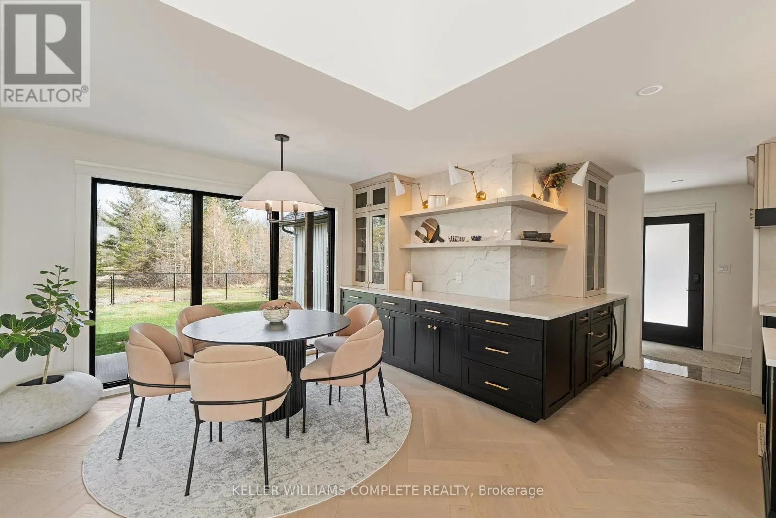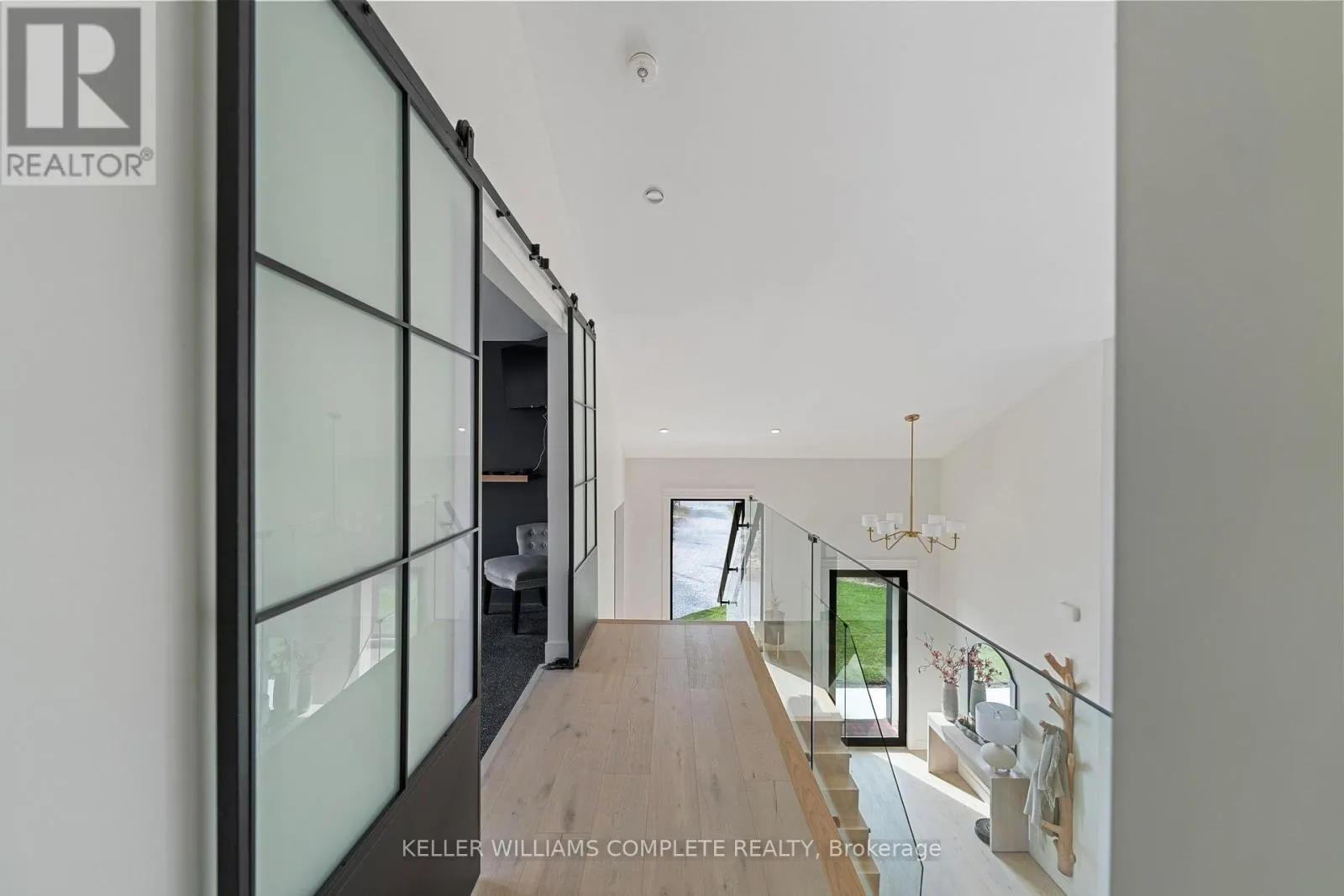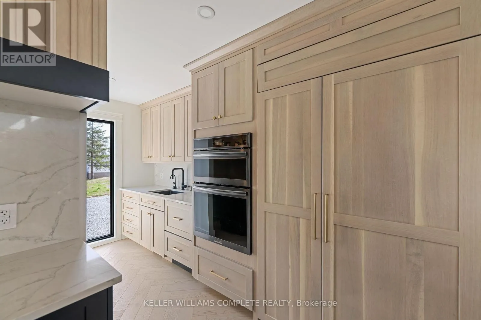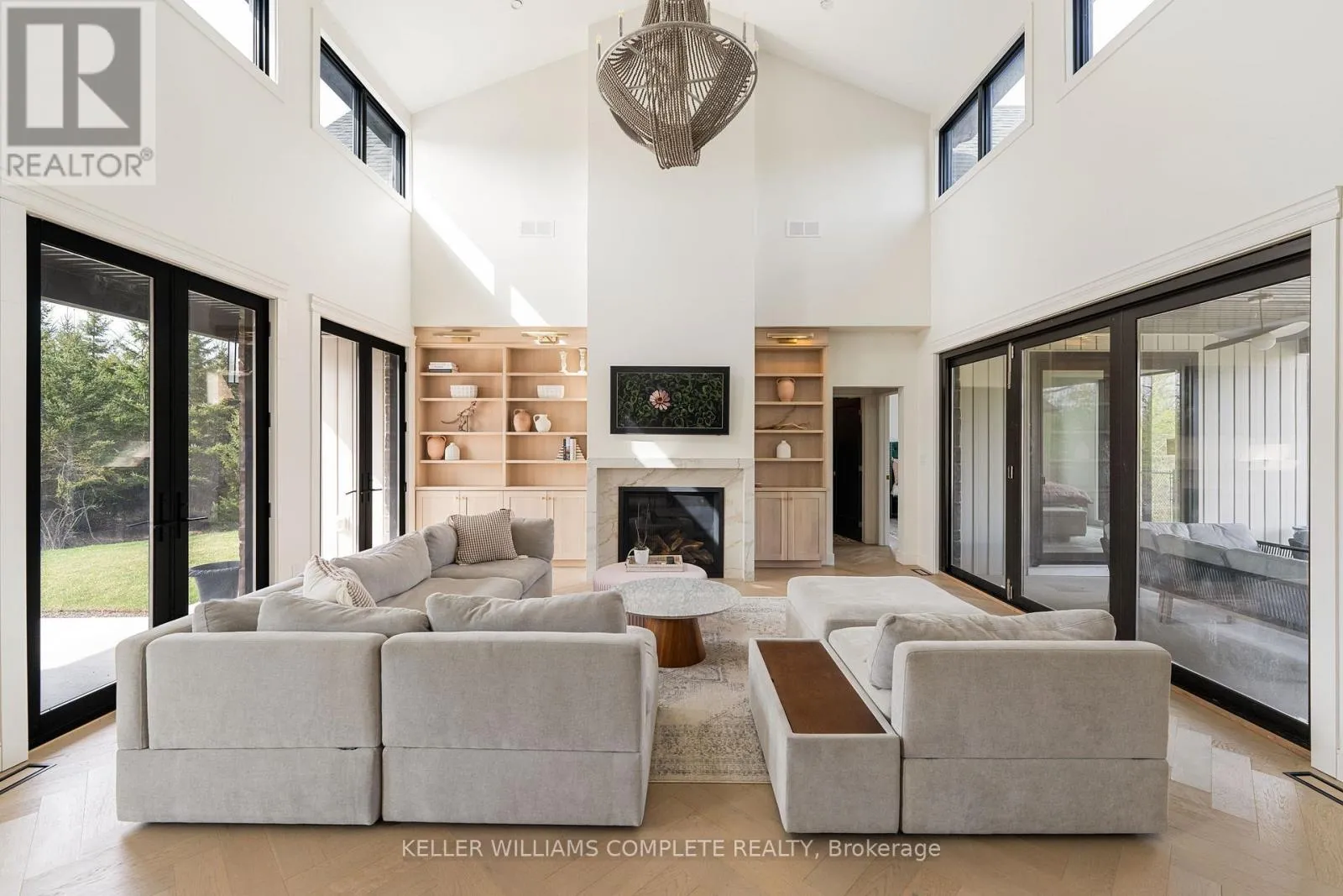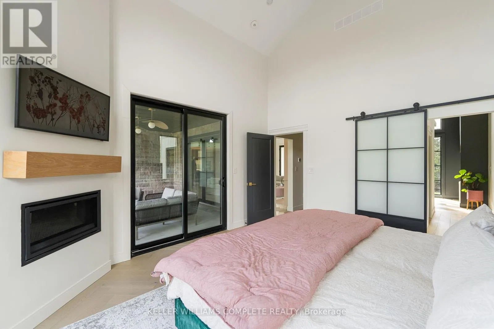 Cross Streets: Forks Rd. East. ** Directions: Forks Rd to White Rd. Experience unmatched luxury and craftsmanship in this breathtaking custom-built bungaloft, completed in 2024 and set on nearly six private, picturesque acres. From the moment you step inside, the soaring cathedral ceilings, sun-drenched interiors, and dramatic black-trimmed windows create a sense of grandeur and sophistication. Every detail of this home has been carefully curated for both beauty and function. The main living area showcases exquisite herringbone hardwood floors, a stunning built-in gas fireplace with custom shelving, and expansive sliding doors leading to a fully covered outdoor retreat the perfect spot for entertaining or unwinding in peace. The kitchen is a true showstopper: sleek black cabinetry paired with natural oak uppers, granite countertops, a gas cooktop, an oversized butlers pantry, and abundant storage for the serious chef. The elegant dining area features built-in cabinetry and shelving, offering a stylish yet intimate space for family meals or dinner parties. The luxurious primary suite is a private sanctuary on the main level, complete with its own gas fireplace, walkout to the covered deck, spa-style ensuite, and a walk-in closet with center island and built-in vanity. Also on the main floor are a designer powder room, a dream laundry room, and a custom mudroom with a built-in dog bath. A few steps up, discover a dramatic library with custom shelving, and in the loft, a fully equipped gym, additional bedroom, and 4-piece bath. For extended family or guests, a self-contained in-law suite offers the ultimate in privacy and comfort with its own entrance, living room, kitchen, bedroom, laundry, and 4-piece bath all perfectly integrated yet completely independent. With a triple-car garage, nearly six acres of tranquility, and flawless attention to detail throughout, this home is truly one-of-a-kind. If you've been searching for a property that exceeds every expectation, this stunning estate checks every box. (id:27476)