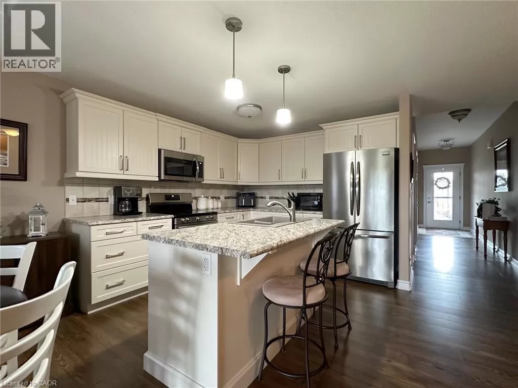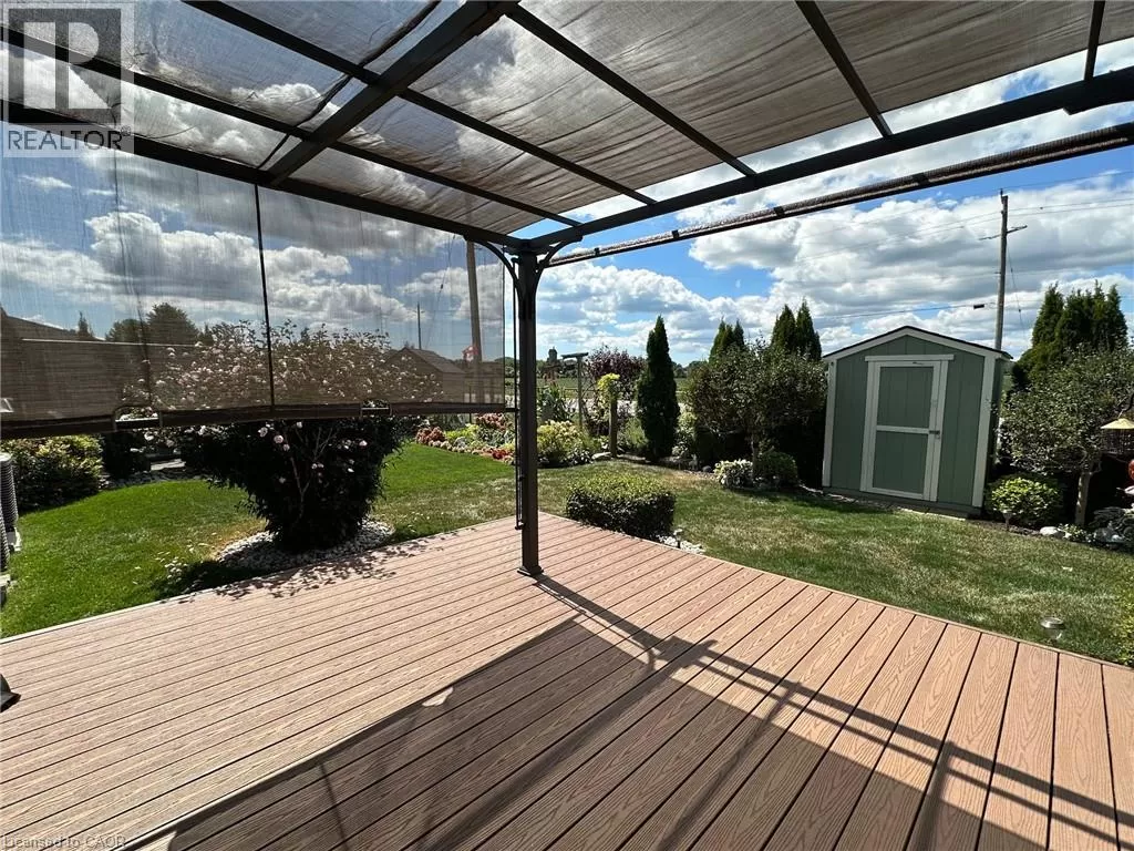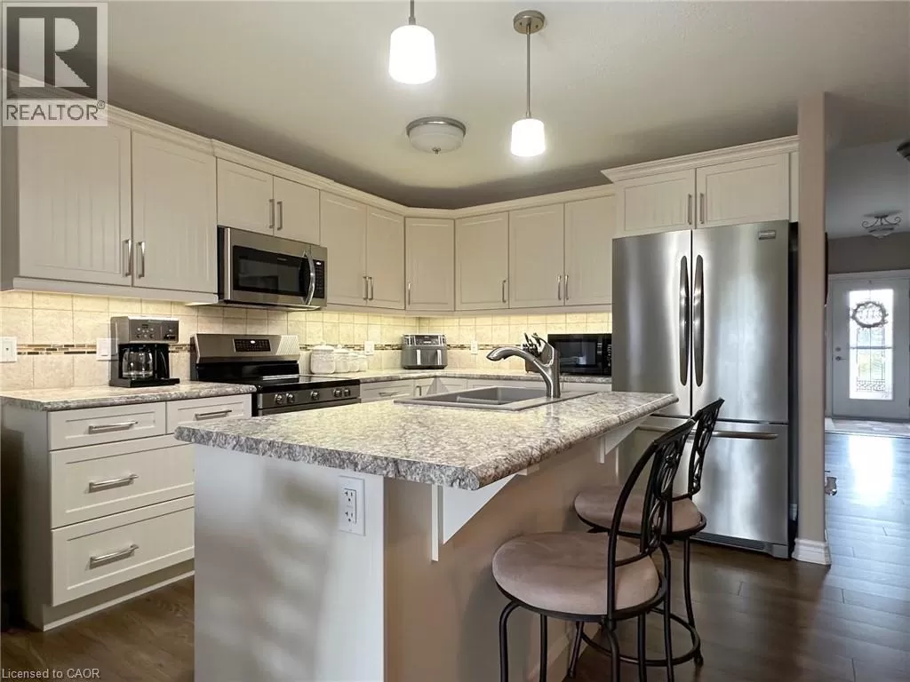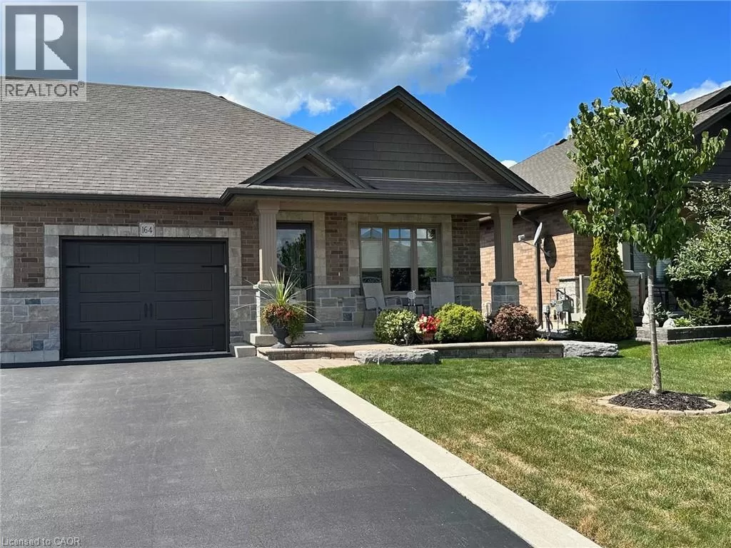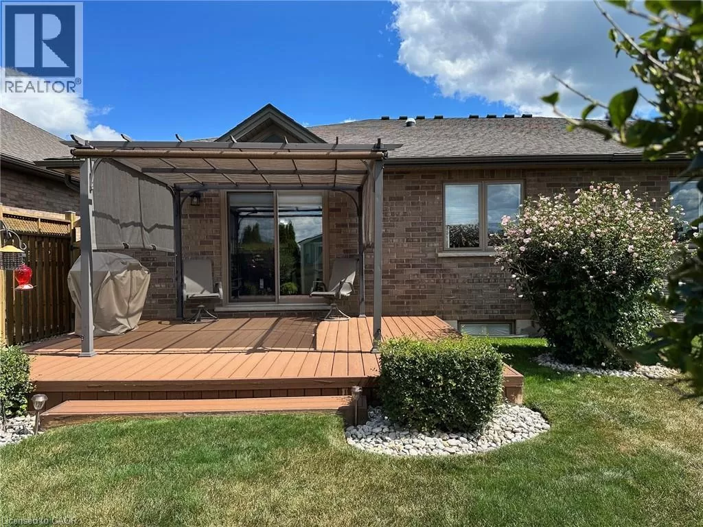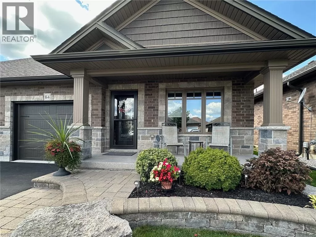 Cockshutt to LynnDover Drive, left on Angler This immaculate stone and brick semi-detached bungalow is situated in a desirable neighborhood, offering both comfort and style. With 2 bedrooms and 2 bathrooms, this property features a welcoming covered front porch and an upgraded kitchen equipped with an island, under-cabinet lighting, and stainless steel appliances. The generous primary bedroom includes a walk-in closet and an ensuite bathroom for added convenience. The second bedroom, currently set up as a sitting room, is great flex space - perfect for an extra bedroom, office, study etc. Step outside to enjoy the beautifully landscaped yard featuring a composite deck with pergola with sunshades, natural gas line (BBQ included), and a shed for additional storage. The unfinished basement has a rough in for a third bathroom. With a main floor laundry and an attached garage, this home is designed for low maintenance, comfortable living. (id:27476)