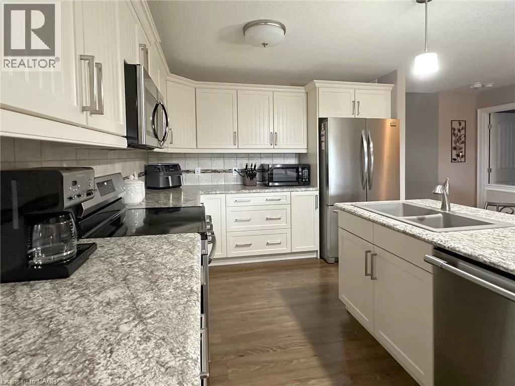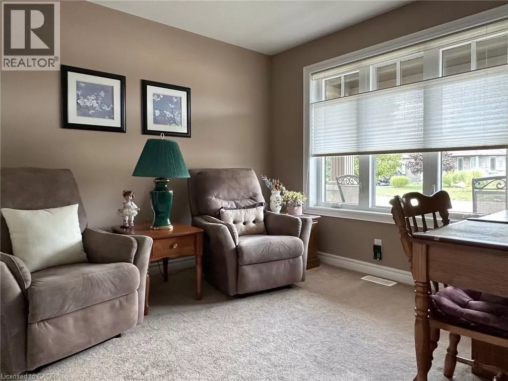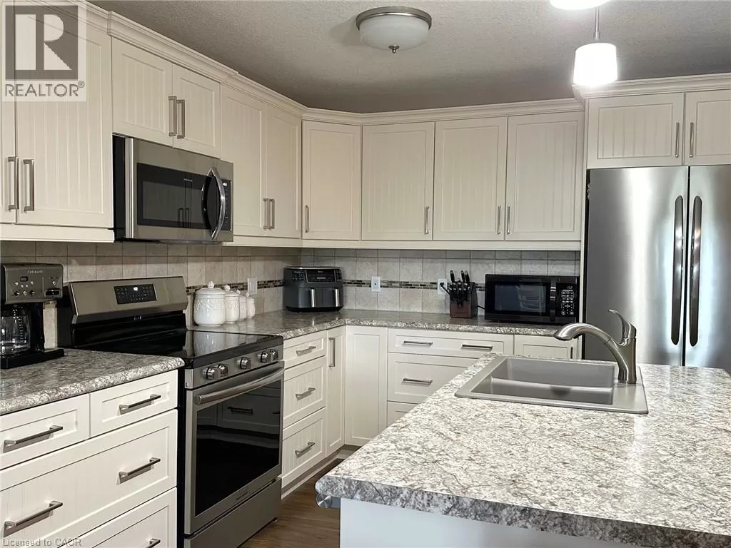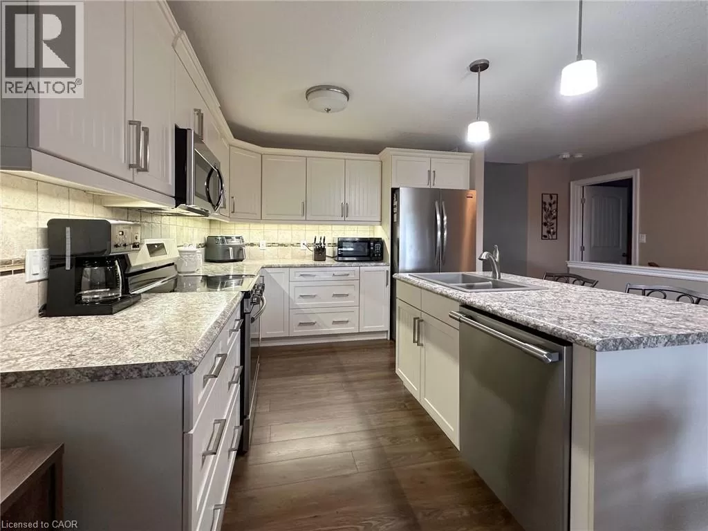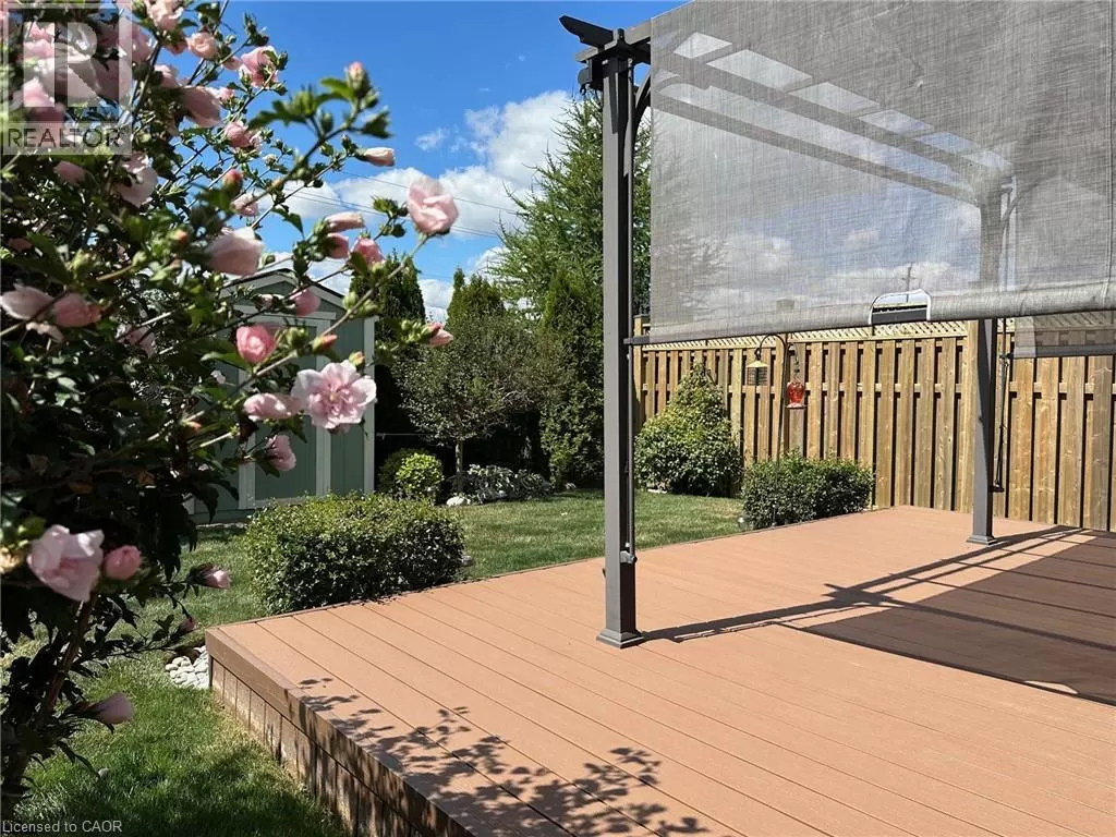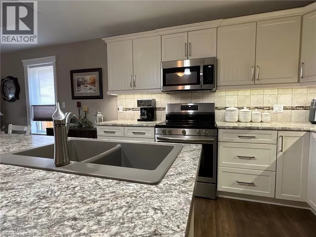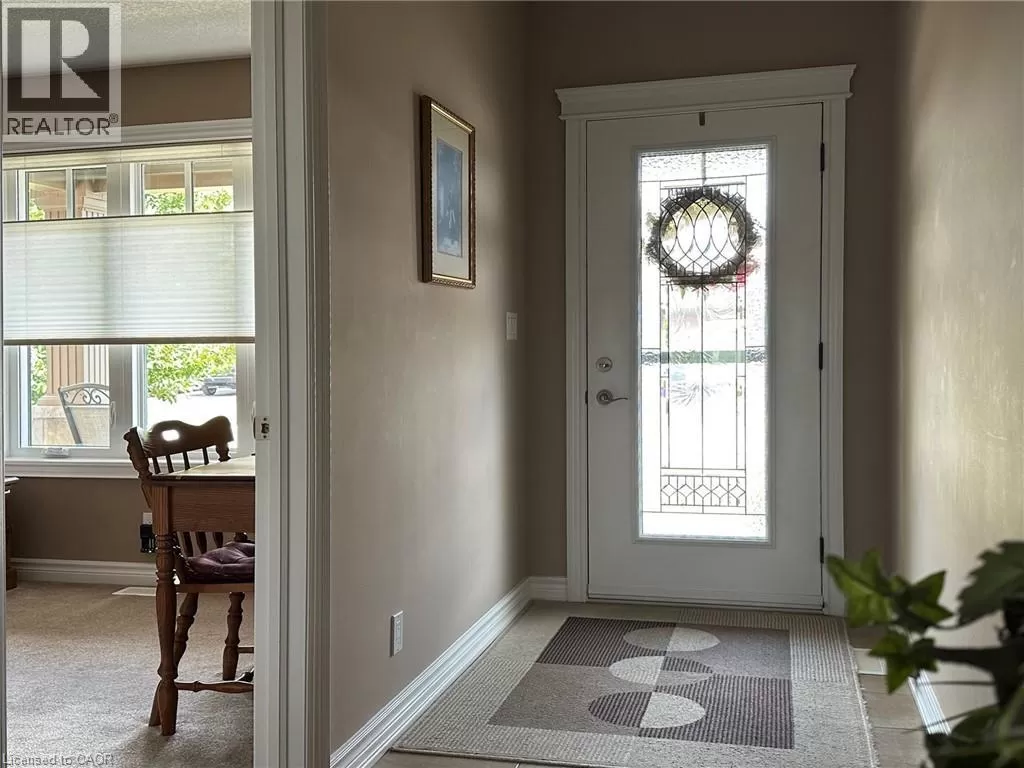 Cockshutt to LynnDover Drive, left on Angler This immaculate stone and brick semi-detached bungalow is situated in a desirable neighborhood, offering both comfort and style. With 2 bedrooms and 2 bathrooms, this property features a welcoming covered front porch and an upgraded kitchen equipped with an island, under-cabinet lighting, and stainless steel appliances. The generous primary bedroom includes a walk-in closet and an ensuite bathroom for added convenience. The second bedroom, currently set up as a sitting room, is great flex space - perfect for an extra bedroom, office, study etc. Step outside to enjoy the beautifully landscaped yard featuring a composite deck with pergola with sunshades, natural gas line (BBQ included), and a shed for additional storage. The unfinished basement has a rough in for a third bathroom. With a main floor laundry and an attached garage, this home is designed for low maintenance, comfortable living. (id:27476)