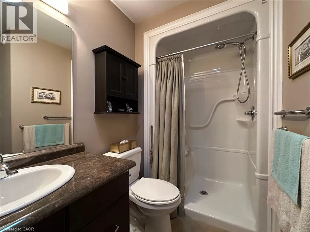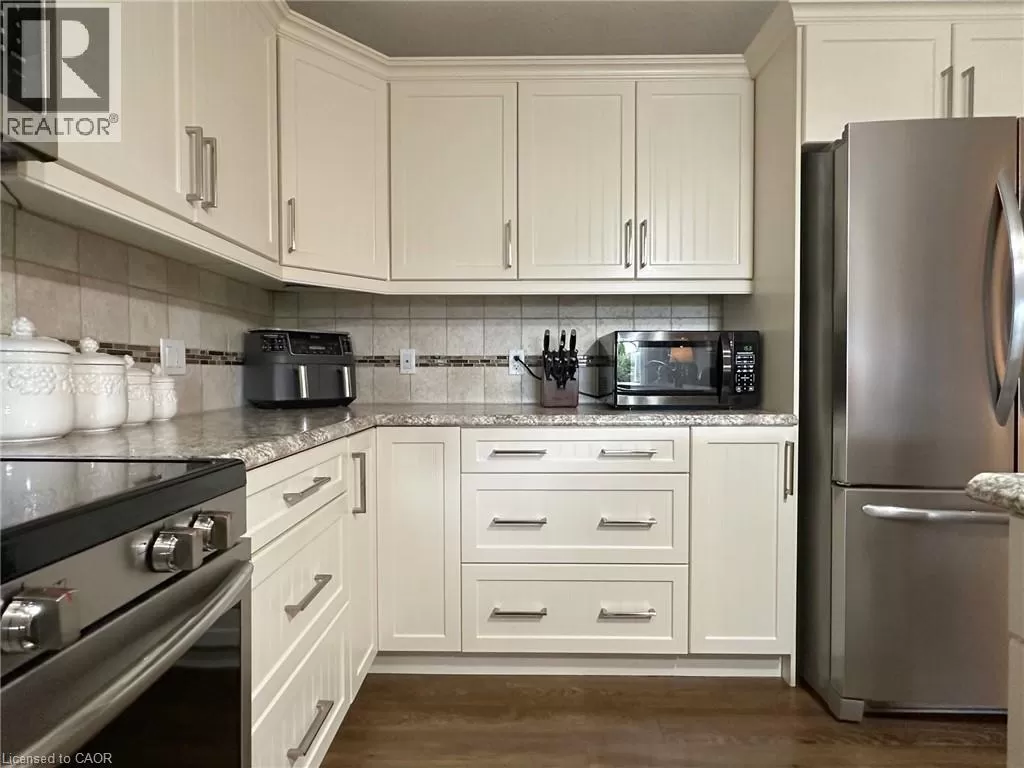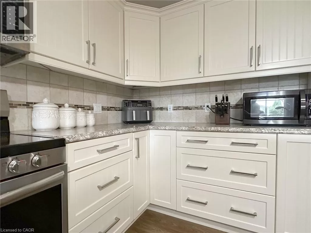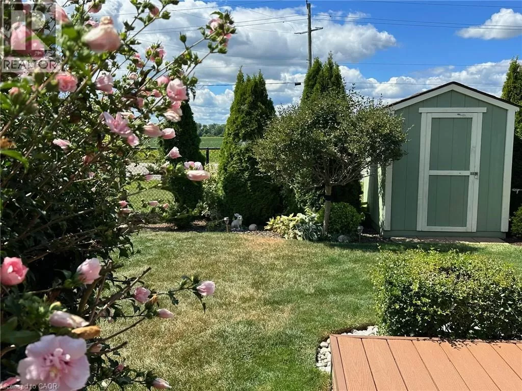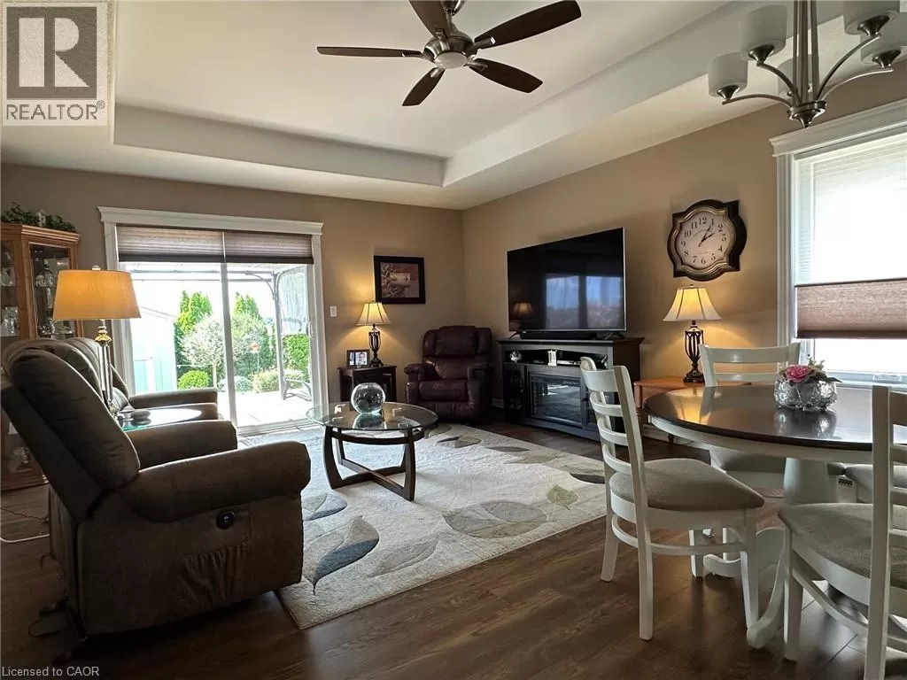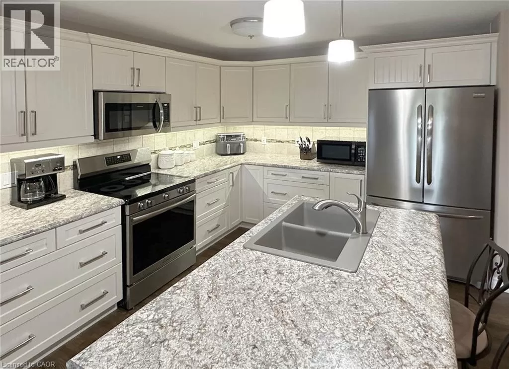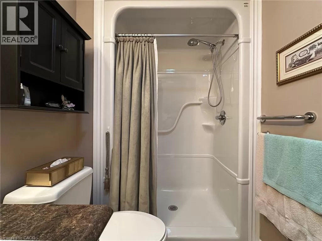 Cockshutt to LynnDover Drive, left on Angler This immaculate stone and brick semi-detached bungalow is situated in a desirable neighborhood, offering both comfort and style. With 2 bedrooms and 2 bathrooms, this property features a welcoming covered front porch and an upgraded kitchen equipped with an island, under-cabinet lighting, and stainless steel appliances. The generous primary bedroom includes a walk-in closet and an ensuite bathroom for added convenience. The second bedroom, currently set up as a sitting room, is great flex space - perfect for an extra bedroom, office, study etc. Step outside to enjoy the beautifully landscaped yard featuring a composite deck with pergola with sunshades, natural gas line (BBQ included), and a shed for additional storage. The unfinished basement has a rough in for a third bathroom. With a main floor laundry and an attached garage, this home is designed for low maintenance, comfortable living. (id:27476)