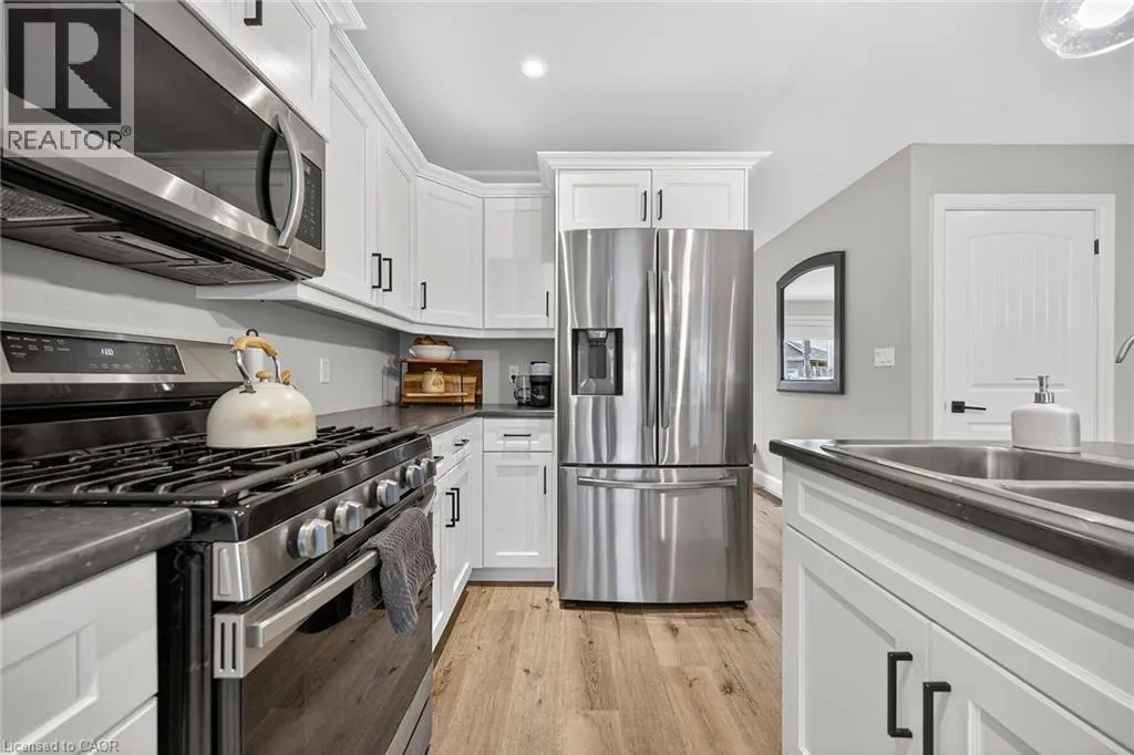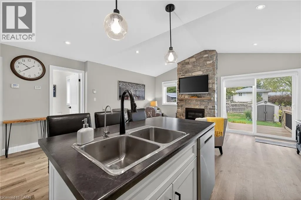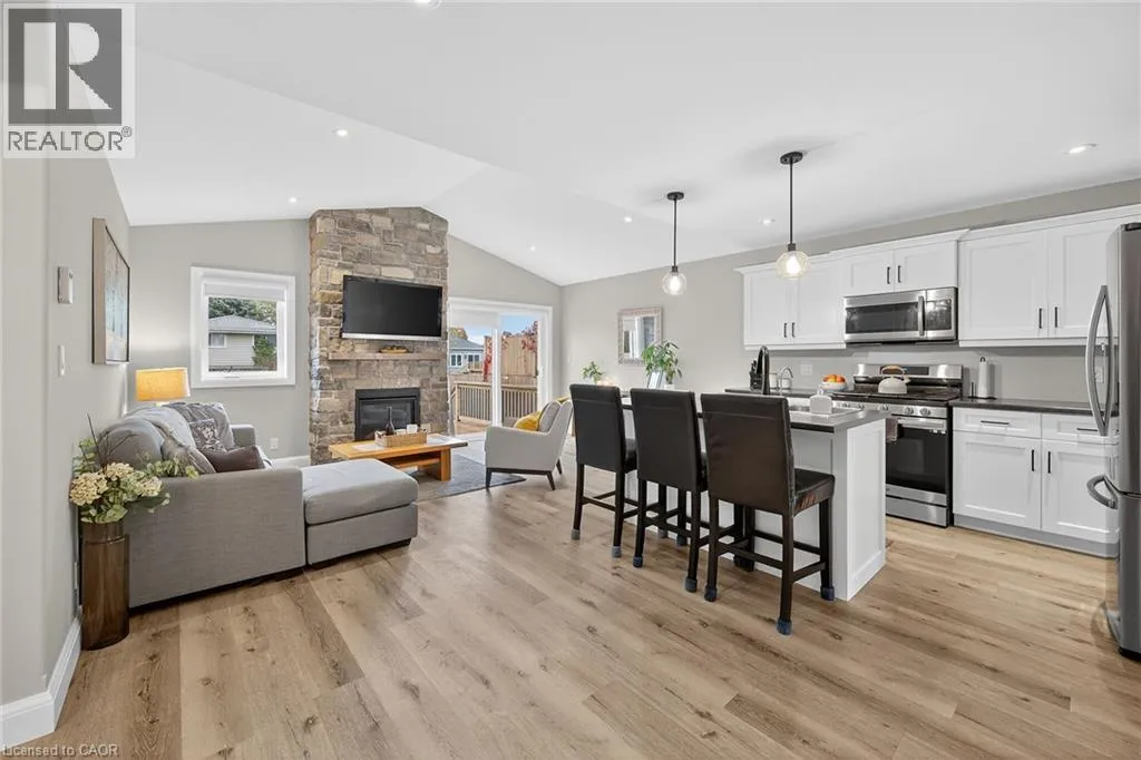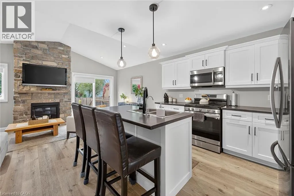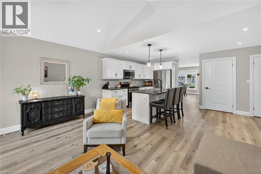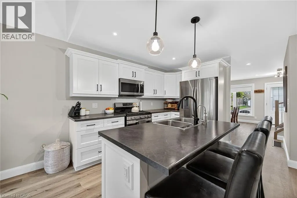 From #6 Hwy Haldimand County, becomes Main St., follow RT at 1st lights BEAUTIFUL BOER BUILD IN BUSTLING BEACH TOWN PORT DOVER! Just short walk away from the Summer Savvy Lake Erie Downtown destination is this 3+ year old home located amongst other impressively maintained properties. Bright white concrete drive pulls you up to the cozy covered front porch for front row seats to Dover's famous Friday the 13th motorcades. Home opens to a bright showroom dining area with large windows & all the area you need to fit that family table. Follow thru on the Notty Bleached Rustic luxury flooring to a modern open concept entertaining kitchen to living room. Stunning black hardware contrasting the gleaming white cabinets and trim work plus sporting a wet centre breakfast bar island including sink, Alkaline water system & hidden dishwasher. Convenient kitchen work areas are backlit by hidden under cab lighting. In open unison is your showcase living room with vaulted ceiling and from floor to peak Stone Hearth surrounding a toe toasting gas fireplace. Steps away are patio doors to your 15x12 deck over looking your fenced in lavishly landscaped backyard with veggie garden box at the end. To water all these lush things the owner installed a 2,500 gallon cistern to collect rain water for free plant & outside cleaning/watering needs. Sleeping level features 2 generous secondary bedrooms, large main/guest bathroom & to die for Primary Bedroom with his & her closets, large private ensuite oasis + 14x6 balcony for evening private shooting the breeze talk or witness bike traffic from above in the clouds! Your basement features newer equipment you won't be worrying about like owned hot water on demand + furnace and convenient wash sink. Big area currently used as a gym can all be finished into a great rec room and games area! Built in 2022 and still has the shine to prove it. Great value in this energetic summer hot spot and a tremendous area to raise your family in a warm welcoming small town only 15 minutes to Simcoe and 45 minutes to Hamilton! (id:27476)