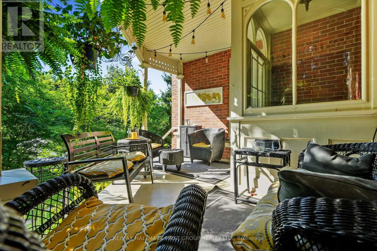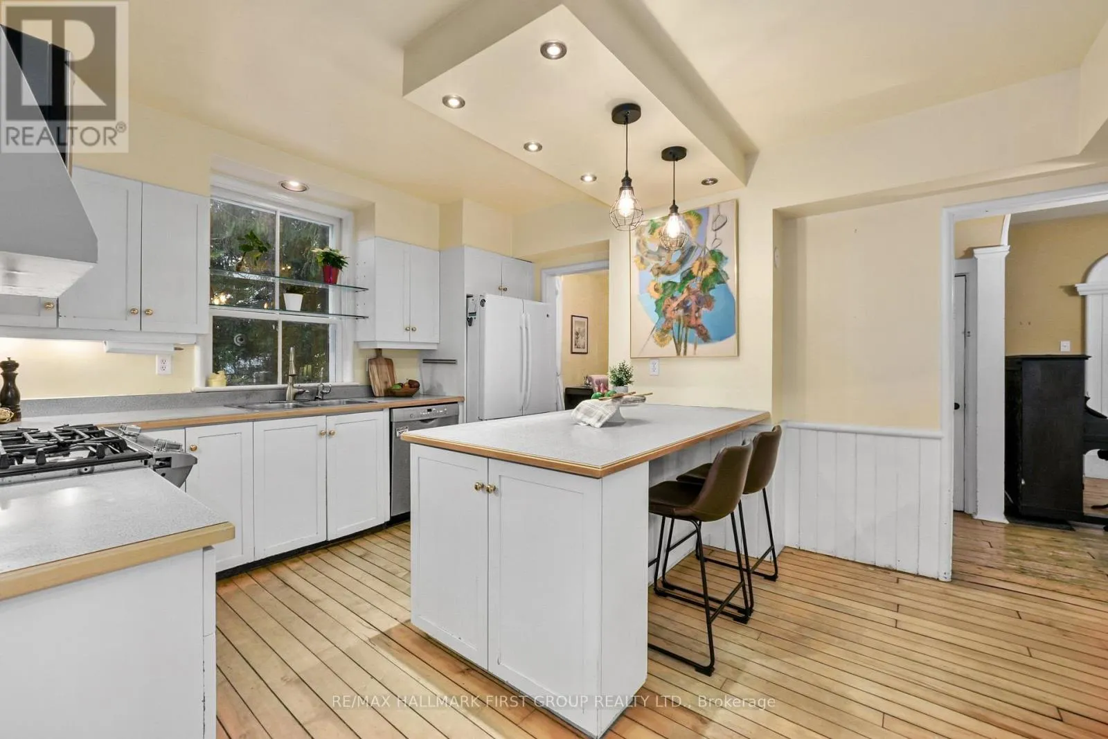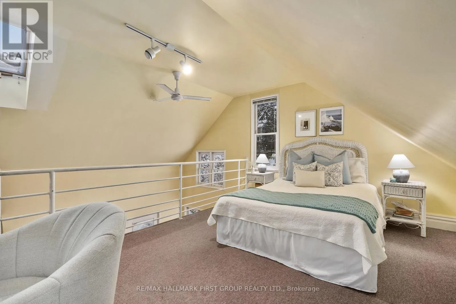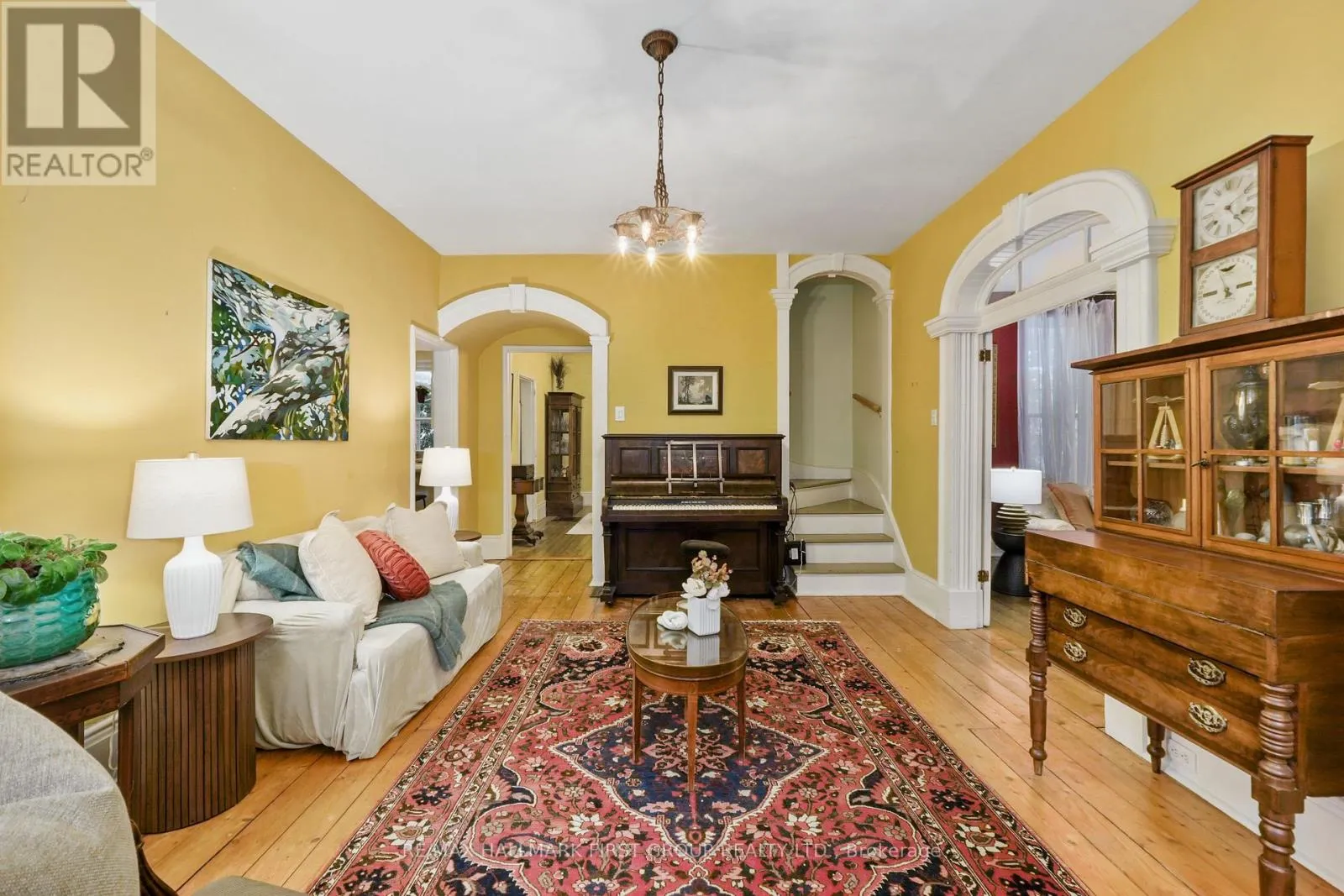 Cross Streets: Bruton St & Pine St N. ** Directions: CR2 (Walton St) heading W, Right onto Pine St, Left onto Bruton St. Located on a picturesque, tree-lined street in the heart of Downtown Port Hope, this distinctive 1850s-built home blends timeless character with thoughtful modern updates. Guests are greeted by a beautiful open foyer featuring a striking floor design and large windows that flood the space with natural light. The living room impresses with a sun-soaked layout, a wall of windows, and a soaring two-storey ceiling. In contrast, the spacious dining room showcases detailed trim and high baseboards, an ideal setting for holiday gatherings and year-round entertaining. The kitchen is designed for hosting, offering generous cabinet and counter space, a coffee bar area, gas stove, breakfast bar, and a prep counter accented by pendant lighting. A character-filled sitting or music room connects to the family room through an elegant arched doorway. The cozy family room features an ornate decorative fireplace and floor-to-ceiling windows overlooking the gardens. A main-floor three-piece bathroom and a convenient laundry room complete this level. Upstairs, the primary bedroom offers a spacious retreat with dual closets featuring French doors, high ceilings, and recessed lighting. The bathroom includes skylights, a glass shower enclosure, and a relaxing soaker tub. Two well-appointed bedrooms and an open loft ideal for a home office or guest space complete the upper floor plan. Outside, a private secret garden oasis awaits. Enjoy a covered porch perfect for morning coffee in any weather, a back patio ideal for alfresco dining, and lush mature trees and gardens, all complemented by a charming bunkie. Situated moments from Trinity College School local amenities, downtown shops, and restaurants, this home offers the exceptional lifestyle Port Hope is known for, with easy access to the 401. (id:27476)