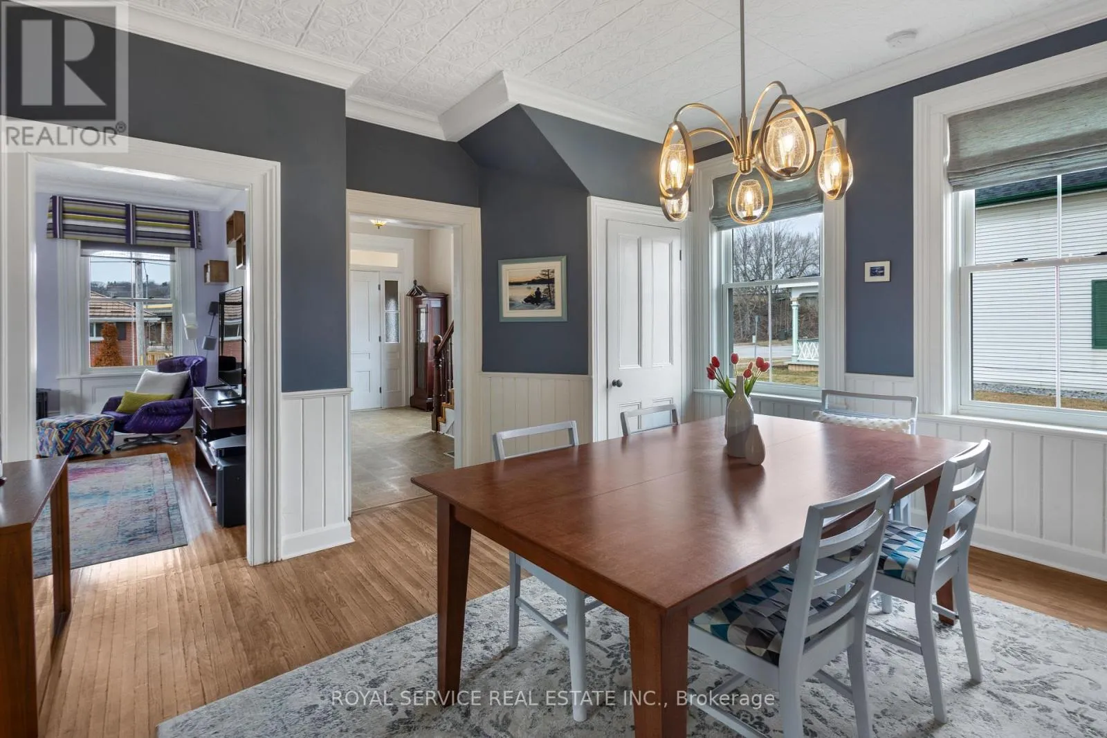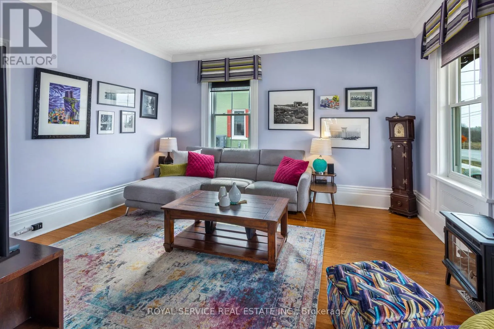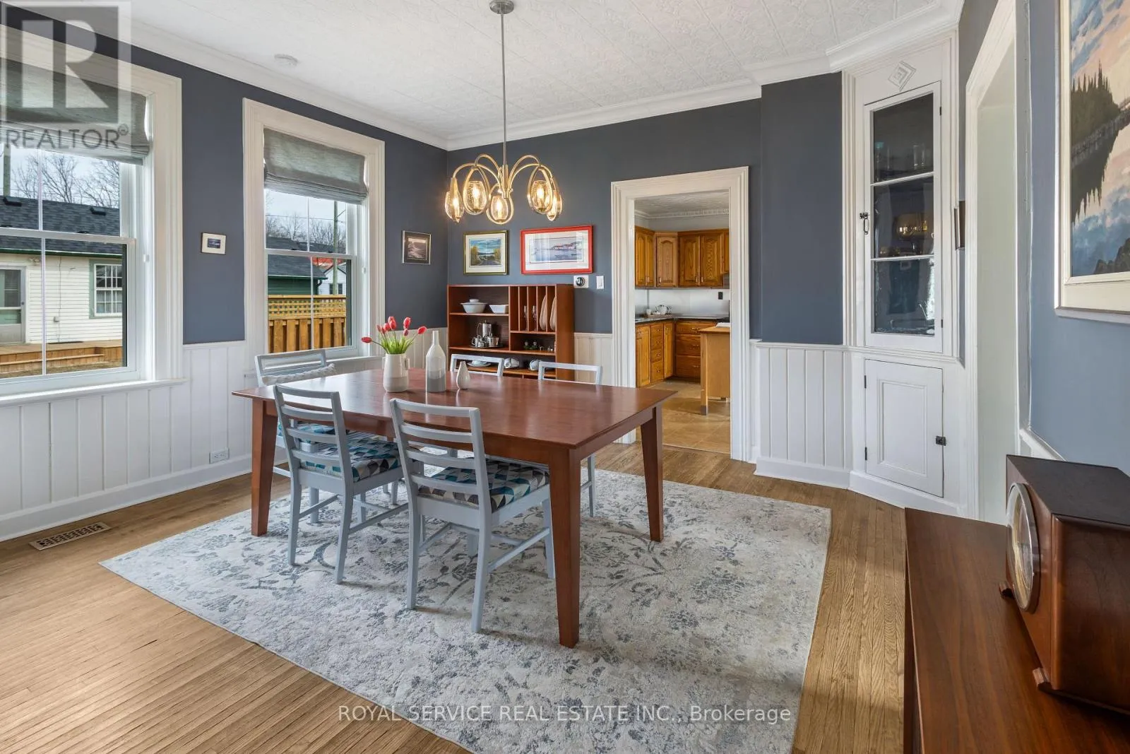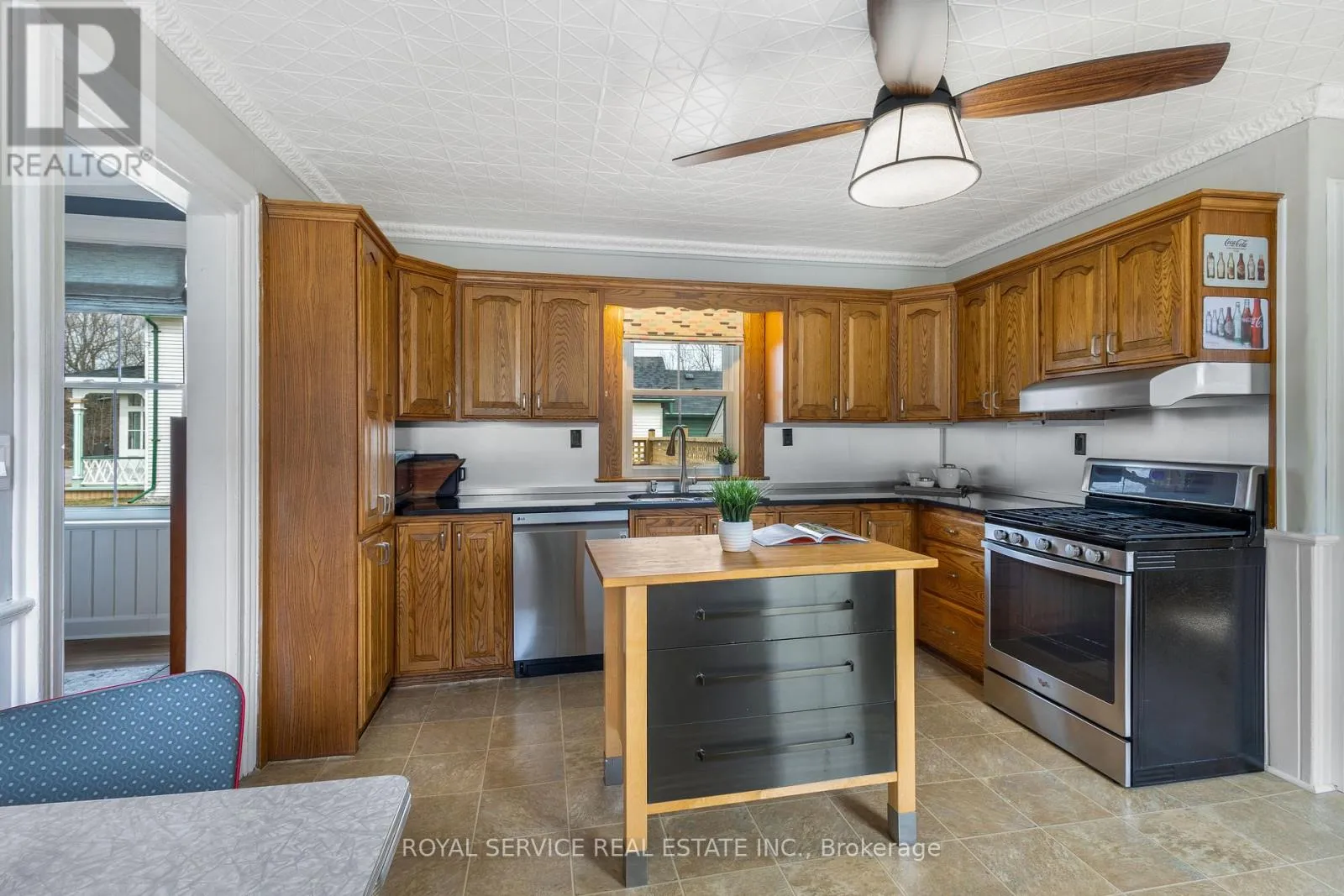 Cross Streets: Peter St. and King St. ** Directions: From 401 head south down Ontario St., keep left on Mill St. S., turn left onto Peter St. (Hwy 2) turn right onto King St. A Piece of Port Hope History - With All the Right Updates. Step into one of Port Hope's storied Captain's Houses and feel the difference that over a century of good bones makes. This two-storey century home sits on a level double lot, just a two-minute walk to the waterfront, 10 minute walk to downtown, and is close to so many amenities. At just under 2,000 SqFt of finished space, there's room to spread out. A sizable front foyer with 9ft ceilings and curved staircase opens into generously sized primary rooms filled with natural light from the large windows. You'll love the historic mouldings and trim throughout the home. The eat in kitchen features granite countertops, original tin ceiling, SS appliances (including a gas stove) and flows well for cooking and gathering. A rear entrance mudroom with main floor laundry and powder room adds everyday practicality, and a new front porch and enclosed portico make for a welcoming arrival. There are three bedrooms upstairs plus a flexible main-floor room that works well as a fourth bedroom, home office, or studio. The large primary bedroom includes a spacious walk-in closet. A full bath with heated tile floors & quartz counters and a powder room serve the household comfortably. The big-ticket items have all been looked after, including metal roof, eavestroughs, windows, mechanicals, and attic insulation, so you can settle in without a long to-do list. Custom window treatments including motorized blinds are all included. This home also offers more storage than you often find in homes of this era. A brand new rear wrap-around deck and fully fenced yard open onto a large, level backyard - a blank canvas ready for your flower beds, gardens or whatever else you can imagine for your space. A home with real history, ready for its next chapter. (id:27476)