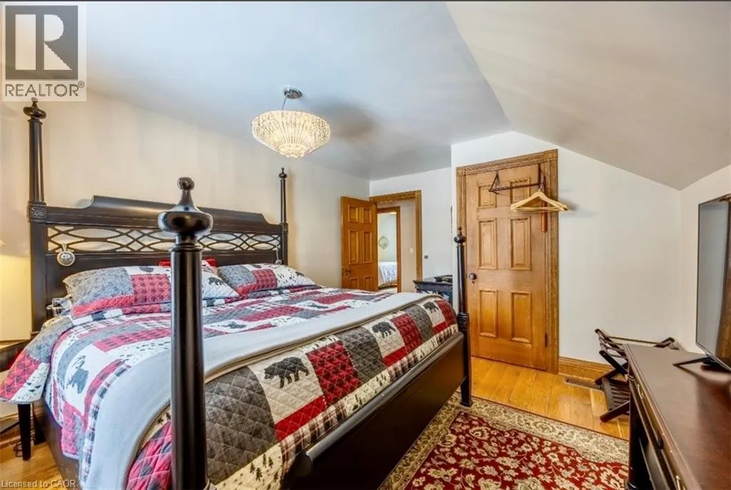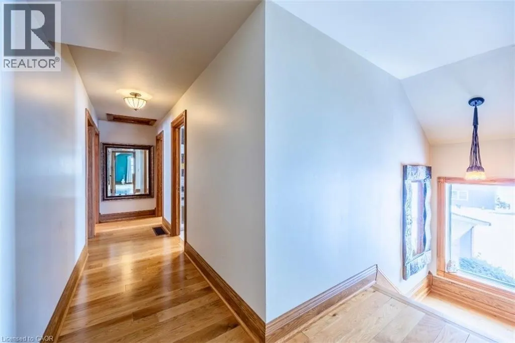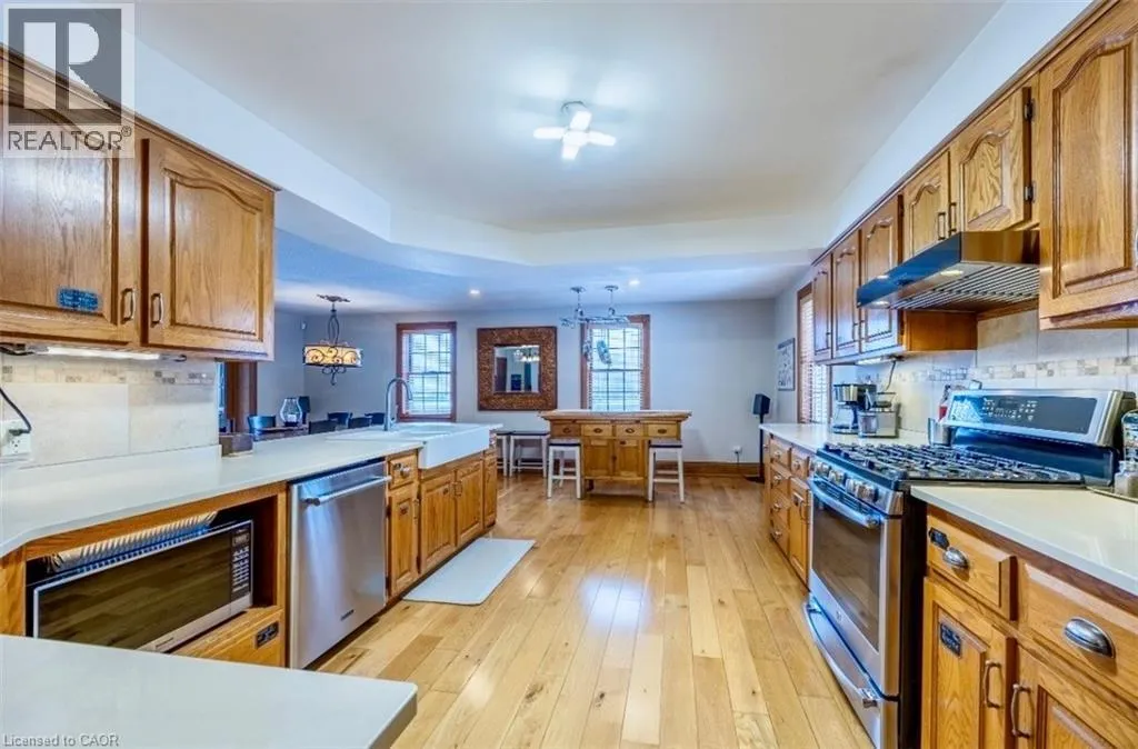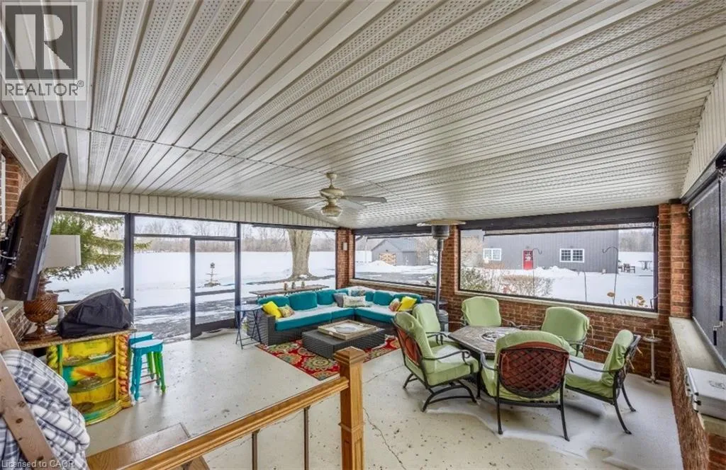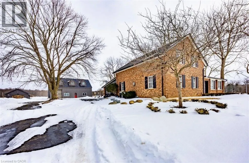 Highway 24 South to Highway 59 Turn Left property on left Wonderful 48.5-acre property with approximately 33 acres workable with the remaining property consisting of a wooded area and land with mature trees surrounding the house. The large brick four bedroom, one and a half story home is quality finished from top to bottom oak hardwood throughout much of the floorplan and closets. On the main level of the house, there is a large three season sunroom with a double door entry located at the front of the house. This leads into a spacious chef's kitchen and dining area, equipped with original Oak cabinetry and solid surface counter tops. off the kitchen is the laundry room and a two-piece powder room located near the back door which takes you directly onto the screened in patio. The living room features a large natural stone wood-burning fireplace, and sizable windows completing the main floor. The second level features four bedrooms; a large primary, plus three other bedrooms all with good sized separate closets. A four-piece bathroom includes a cast iron claw foot tub and separate shower and linen closet. The Basement has been updated in 2025, including new windows and vinyl flooring. The expansive living space has a completely finished recreational room that could be used in many different ways. The basement also has a convenient entrance/exit that leads directly into the screen in patio. The barn has a games room with gas fireplace, the other half of the barn is a two-story garage/storage space and large back facing dry shed, the second outbuilding has been recently renovated and is heated. This stunning property offers great work/play areas to relax and enjoy. See MLS # 40803033 (id:27476)