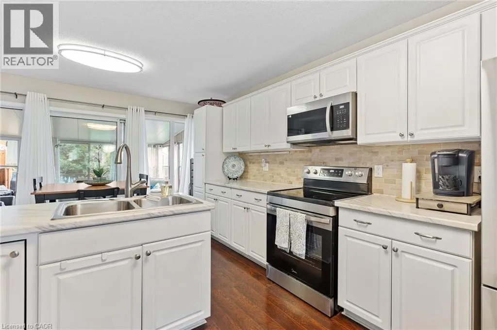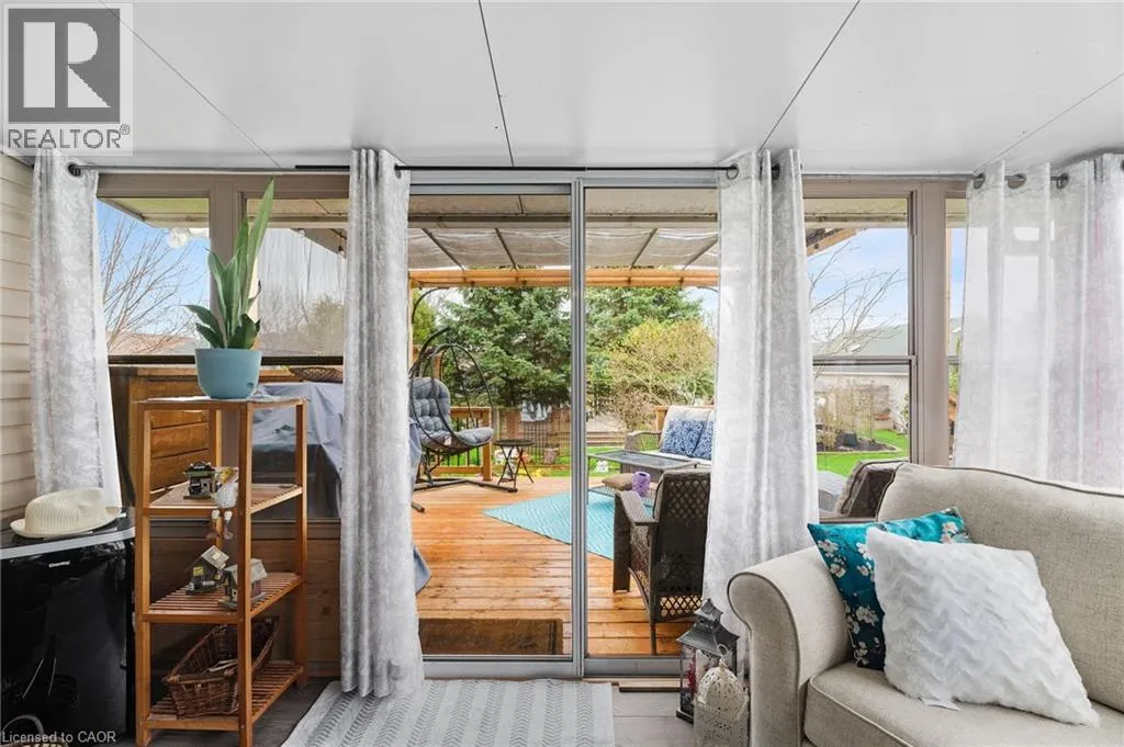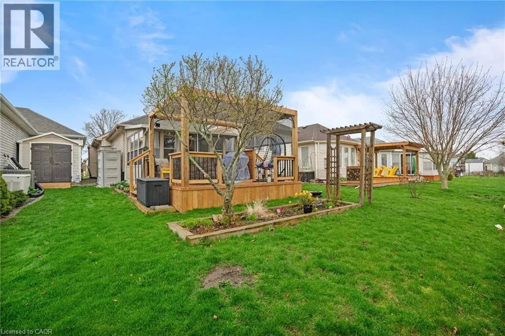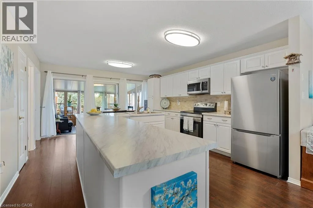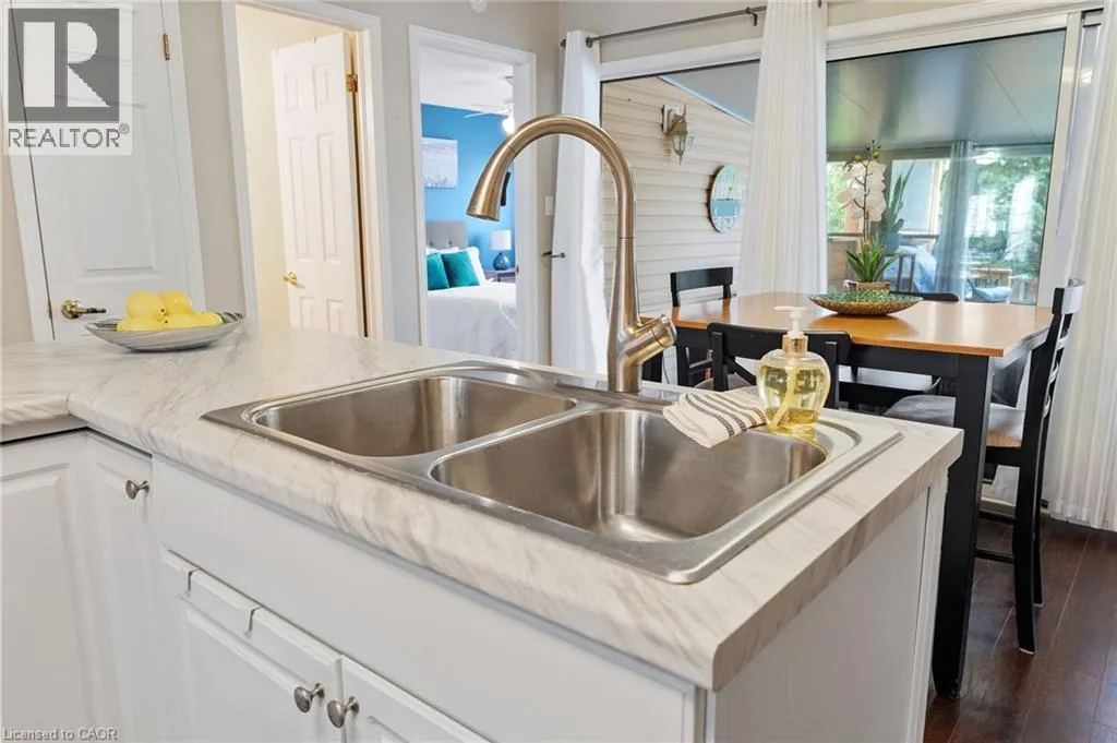 Turn on Long Point Blvd from Bay Street, close to clubhouse. Bright & Updated 2-bed 2-bath Bungalow w Garage & 2-car driveway, Sunroom, front porch & newer deck. Well-located steps from pool, hot tub,sauna,billiards,party room w stage & kitchen,gym, media room, library, workshop, craftroom, and outside patio with BBQ at the Villages of Long Point Bay Club House. Enjoy the sounds of the water feature & green park views from your lovely back deck and landscaped gardens. The Club's common 8 acres incl: a lovely walking path, bocce ball, shuffleboard, lawn bowling, pickleball, community garden, gazebo, and picnic area. Enjoy open concept living in this lovely carpet-free home with laminate flooring: living room with brick gas fireplace and large windows; dining room w/ modern chandelier on dimmer, updated kitchen features new stainless steel microwave,fridge & stove, dishwasher, giant party-sized island, expansive white cupboards, and an eat-in area; updated bathrooms - 2PC and 4PC with walk-in tiled shower & solar tube; separate room main floor laundry; large master bedroom with double length closet and large windows facing backyard; 2nd bedroom with large closet and window; walk-out to garage from laundry; walk-out to 3-season room from kitchen; walkout to recently built large deck from sunroom. Take a minute to enjoy the serene backyard and views. The garage includes built-in ceiling storage, handy for storing suitcases and seasonal items. The 3-season room has a portable heater/A/C making it usable year-round. Port Rowan is a hidden gem featuring a marina, lakeside park, several summer festivals and markets, grocery stores, gas station, pharmacy, liquor store, worship, hardware, restaurants, clothing stores, ice cream shoppe, library, medical professionals, and most recently a Tim Hortons! Known for bird conservation area, hiking, fishing and watersports, Port Rowan is just a short drive to Long Point Beach, and nearby towns such as Turkey Point, Simcoe, Port Dover, Tilsonburg and Delhi. (id:27476)