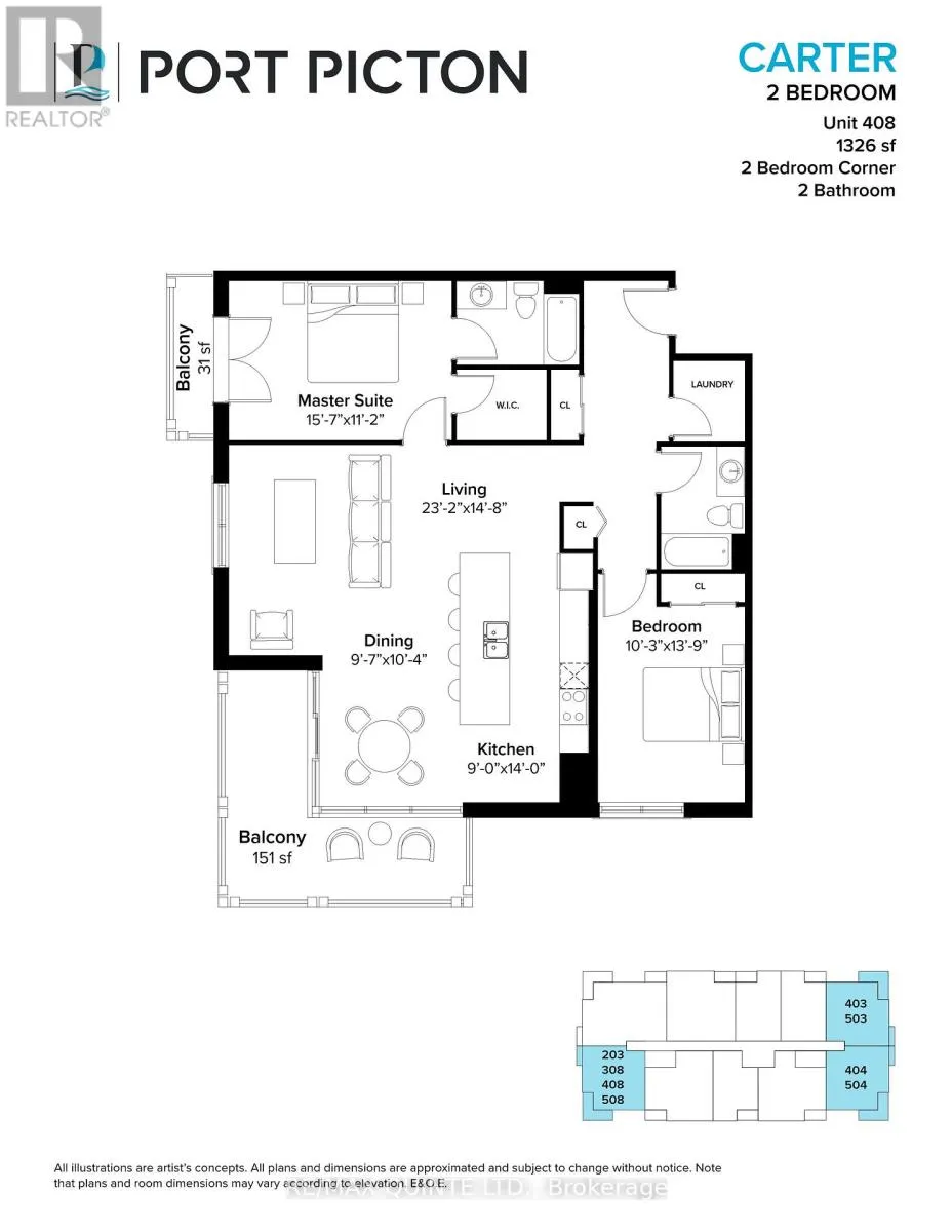 Cross Streets: Loyalist Parkway to Cleave Ave on left. ** Directions: Bridge Street to Cleave Avenue. Step into the ease of sophisticated condominium living in this exclusive harbourfront community. The Carter Building features 36 thoughtfully designed condo suites, each with a private balcony or terrace, secure underground parking, and convenient storage lockers. Suite 404 (1326 sq.ft.) offers 2 spacious bedrooms, 2 bathrooms, and a bright open-concept kitchen, dining, and living area that seamlessly flows onto your private balcony. The suite also includes a separate in-suite laundry/storage room and expansive windows throughout, ensuring an abundance of natural light. High-end finishes include engineered hardwood floors, sleek quartz countertops, and beautifully tiled showers and tubs. Just a short walk away, the Claramount Club will offer an array of amenities, including a fine dining restaurant and pub, fitness center, indoor lap pool, bakery and tennis court. Embrace the serene lifestyle of Port Picton, with the convenience of maintenance-free living. Condo/Common Element Fees $642.75/mth. (id:27476)