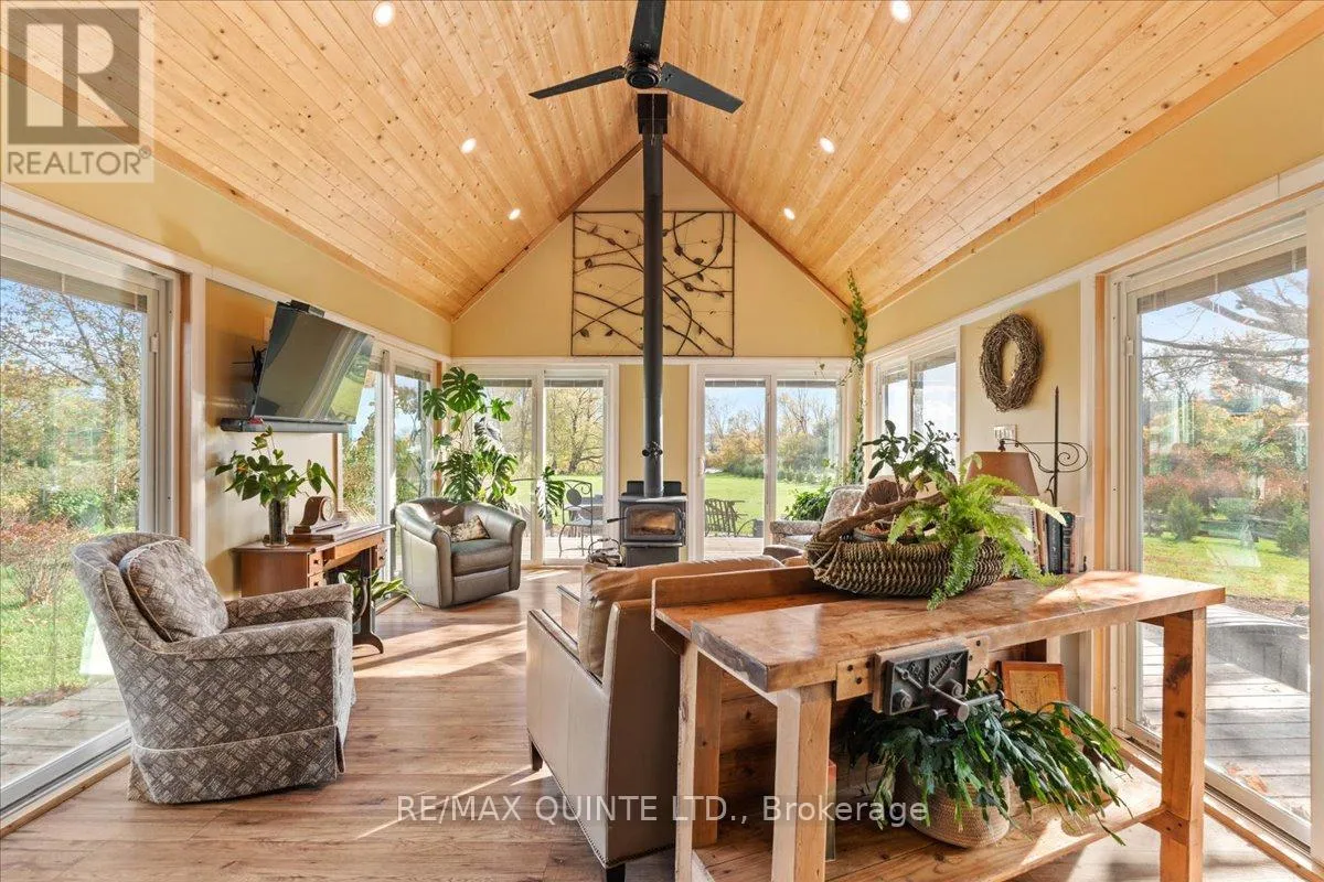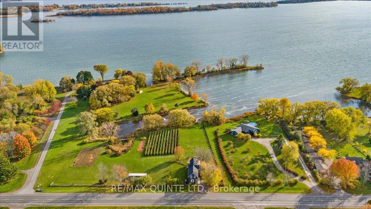 Cross Streets: Loyalist Parkway and Conley. ** Directions: east of Wellington on Loyalist Parkway...follow to 15775 on left side of road...Across from the Eddie Hotel and Farm. Charming Century Home with West Lake Waterfront offering Prime Location Between Wellington and Bloomfield - A Unique County Retreat. Beautifully maintained Century Home, Circa 1927, situated on the quiet shores of West Lake. This property offers a coveted south-facing view and promises peace & privacy. Enjoy direct access to West Lake, ideal for fishing, boating, kayaking, or simply relaxing by the water's edge. Nearly 3 acres of rolling landscape, featuring a thriving commercial grade raspberry patch and a mixture of mature trees. Ample space on the east side of the lot provides a rare opportunity to build a second dwelling. This inviting 2-storey home is bursting with character and comfort. Step inside to discover 1,250 square feet of main-level living space, complemented by thoughtful design and classic details. A bright sunroom with six sliding glass doors, vaulted ceilings, a cozy fireplace, and walkouts to deck spaces make this a favourite spot to gather year-round. Centrally located kitchen and dining areas are perfect for family meals and entertaining guests. A main floor bedroom, 3 piece bath, another living room or work area and convenient laundry room are also located on the main floor. The upper-level primary suite features a tranquil loft, complete with an ensuite bath. Situated close to all the best Prince Edward County has to offer, including renowned wineries, farm-to-table dining, art galleries, and charming village shops. Enjoy easy access to both Wellington and Bloomfield, yet relish the privacy and serenity of lakeside living. Hop in the boat and head over to the sand dunes at Sandbanks Provincial Park! (id:27476)