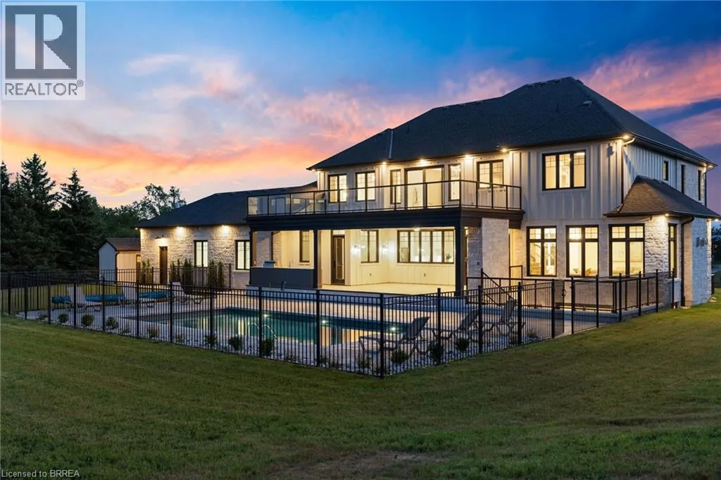 Governors Road W Presenting a once in a lifetime property. Welcome home to the iconic Falkland Springs Estate at 30 Brant County Highway 2, Brant. A generational retreat on over 10 acres of scenic countryside. Custom built in 2024, this elegant showpiece is perched atop a breathtaking landscapeâa legacy property offering unmatched privacy and grandeur. Equipped with outbuildings and ponds, start the tour through a gated entry that leads up a winding and fenced road. Commanding a staggering 7472 sq ft en masse, with nearly 2000 sq ft in the oversized 4 car garage and 7100 sq ft of which is masterfully crafted finished living space. The home radiates timeless sophistication. Find 6 bedrooms and 6 bathrooms including a separately accessed and full in law suite and full kitchen. Enter the home into a bright and inviting foyer. To the left, a richly appointed office with custom built-ins and a gas fireplace sets a refined tone. On the right, an elegant dining room showcases intricate ceiling details, ideal for formal gatherings. The heart of the home is the open-concept kitchen and living room. Coffered ceilings and a cozy gas fireplace create warmth, with sight-lines of private resort-style backyardâcomplete with an outdoor kitchen, covered patio, gas fireplace, and heated saltwater pool. The chefs kitchen outfitted with high end, built-in appliances. It seamlessly blends functionality with luxury with an abundance of custom cabinetry and ample counter space. Upstairs enjoy a coffee bar leading into the primary suite with walk through closet, a stunning en suite and a balcony overlooking the pool and mature trees. The bright basement is home to the secondary suite but is still versatile and has room for the whole family! Enjoy an additional rec room, a sauna with plenty of seating and a dedicated theatre room. This home has it all! For the hobbyist the larger of the outbuildings was once a hatchery is 5387 sq ft. For the discerning buyer; donât wait, begin your legacy today. (id:27476)