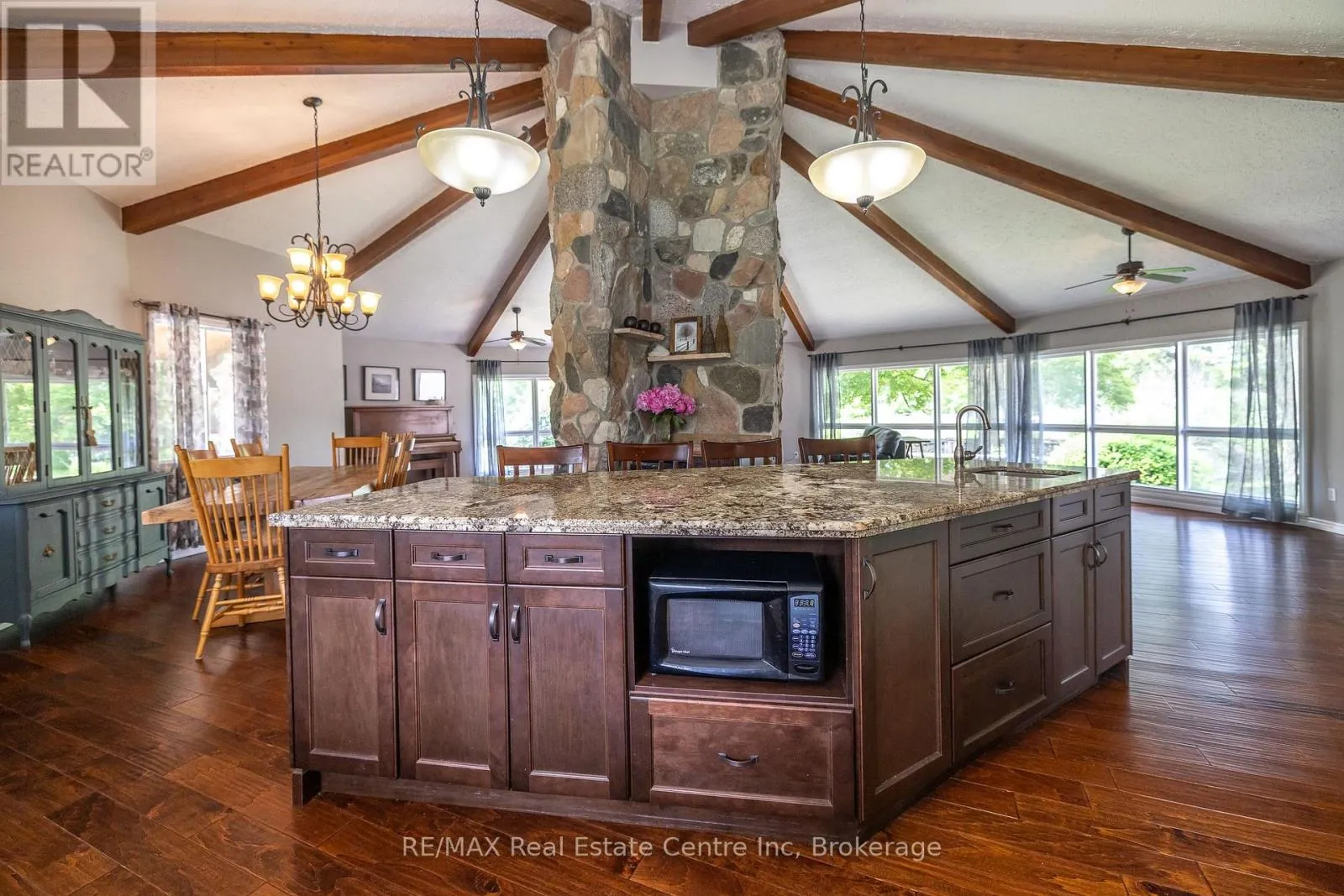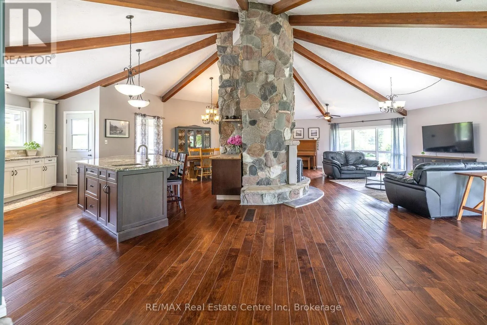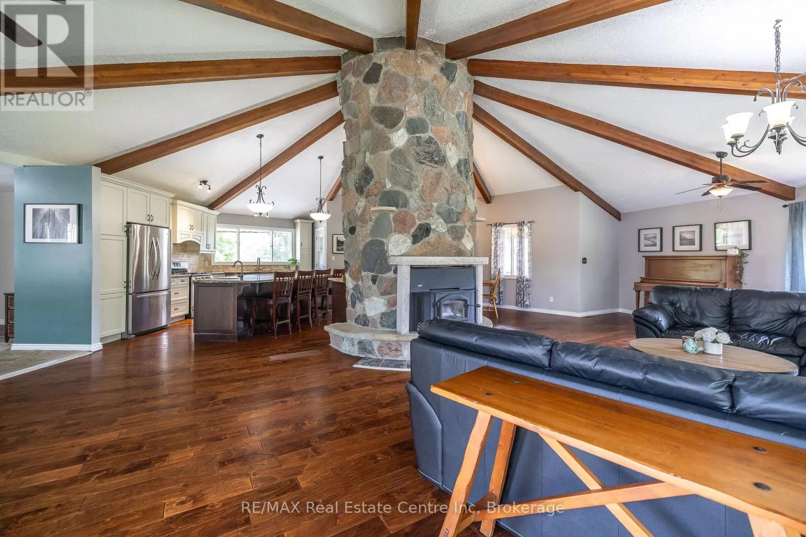 Brock Rd and Old Brock Rd Discover the perfect blend of comfort, space, and functionality in this stunning 5-bedroom, 3.5-bathroom country home, ideally located just minutes from Highway 401. Set on a beautiful, private lot, this property offers the peace of rural living with unbeatable convenience for commuters. Step inside to a bright, open-concept layout designed for both relaxation and entertaining. At the heart of the home, a stunning central fireplace anchors the main living area, creating a cozy focal point that flows seamlessly into the kitchen and dining spaces. Large windows bring in natural light and frame picturesque views of the surrounding countryside. Each of the five bedrooms is generously sized, with the primary suite boasting a private ensuite, walk-in closet and large balcony looking over your backyard oasis backing onto Mill Pond. The in-ground pool and cabana are ideal for summer entertaining, relaxing, or making family memories. A separate lofted garage workshop offers ample room for hobbies, storage, or a home business set up perfect for tradespeople, car enthusiasts, or anyone in need of extra space. This property delivers the best of country living with quick access to schools, shopping, and major routes. (id:27476)