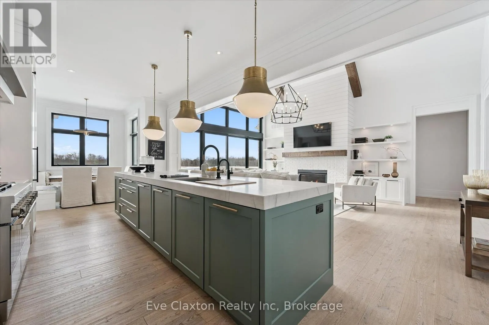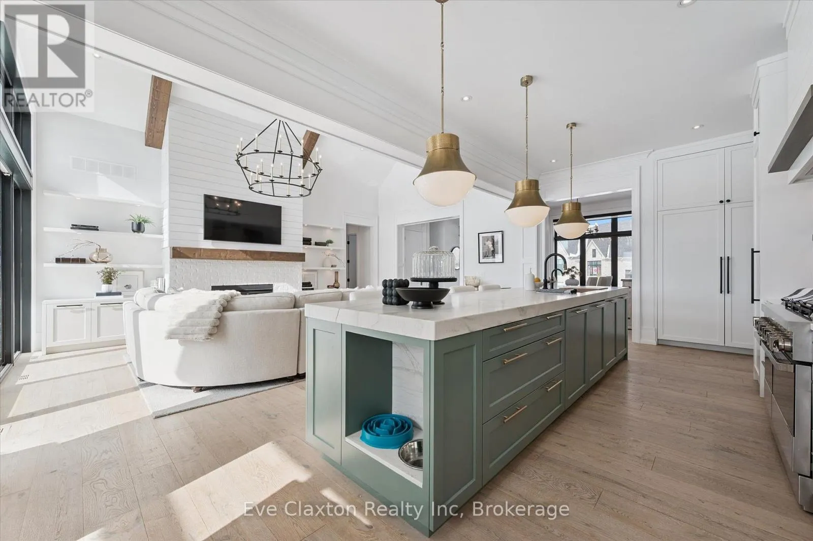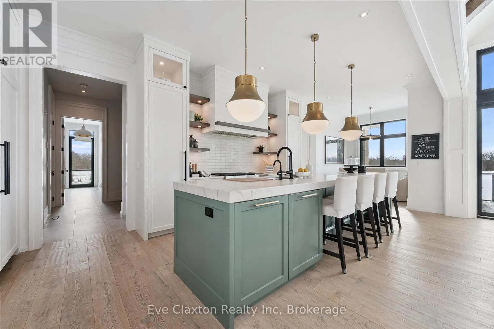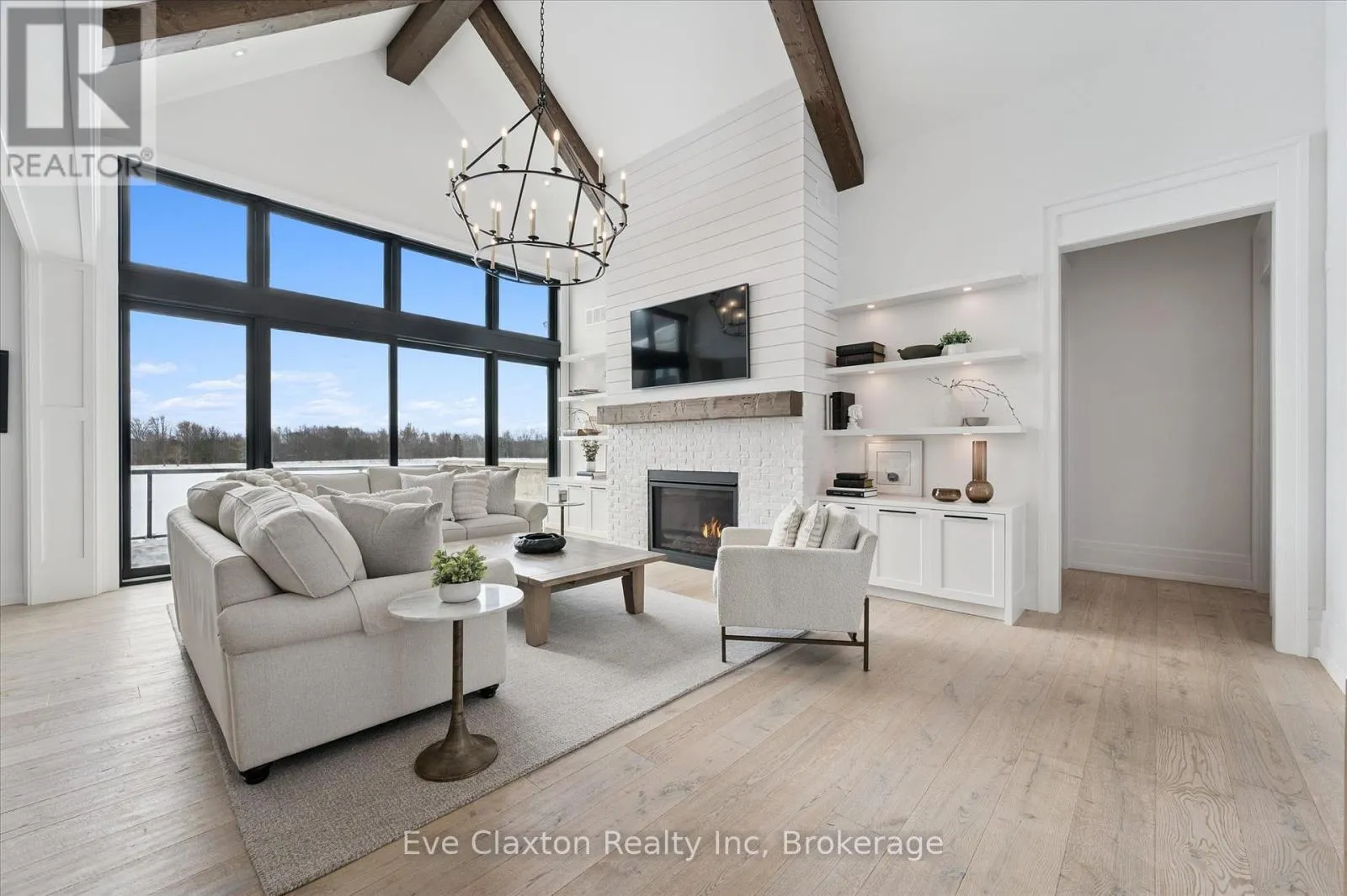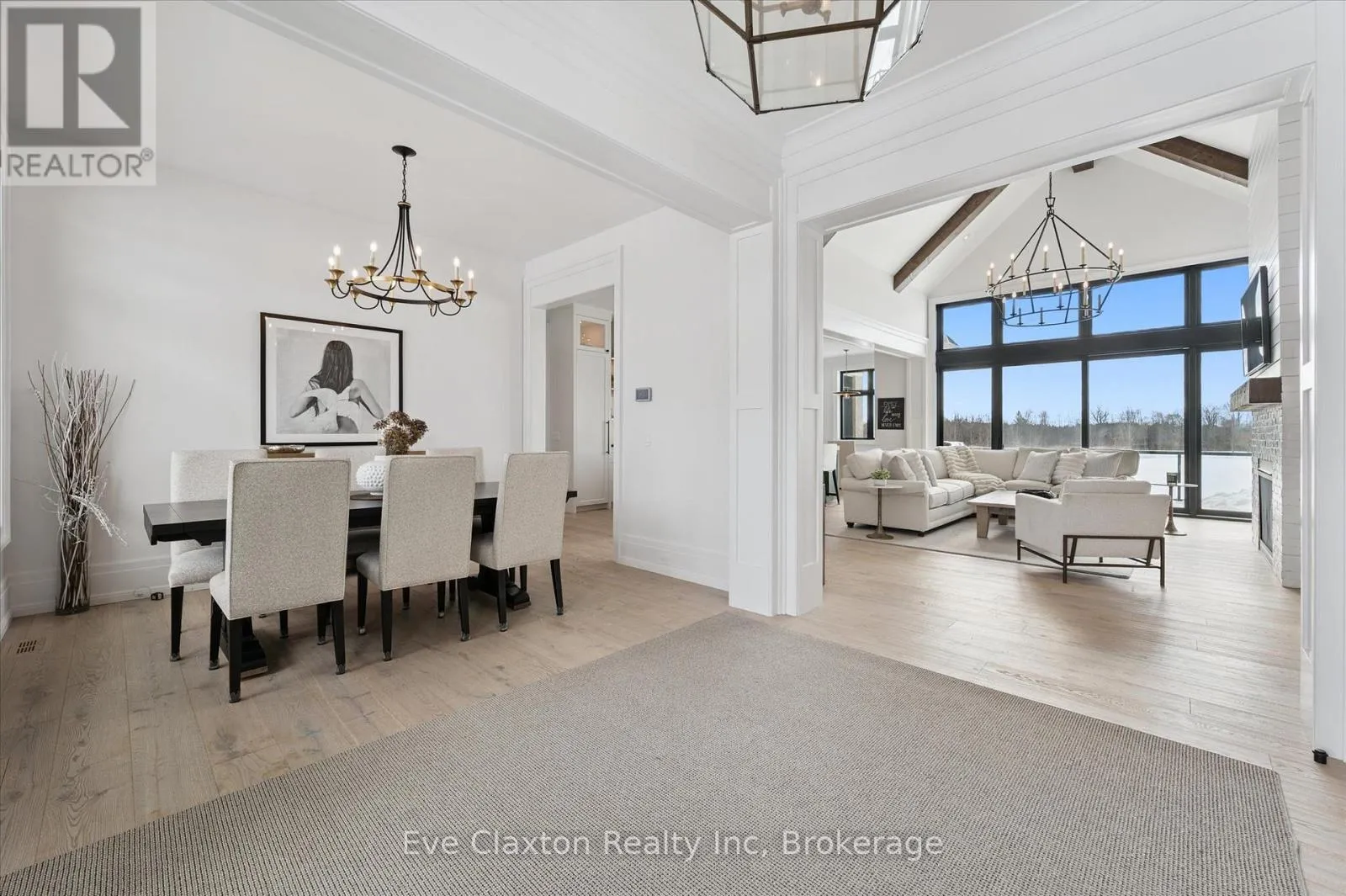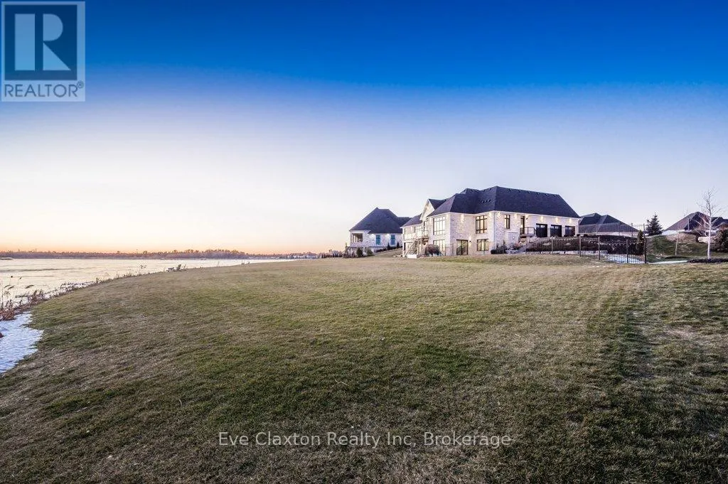 Cross Streets: Wellington 34 / Heritage Lake Dr. ** Directions: Exit 295 off 401, Right on Wellington 34 , Right into Heritage Lake Estates. Experience true waterfront living-without leaving the city. Nestled in the exclusive gated community of Heritage Lake Estates, this stunning modern farmhouse bungalow offers a rare blend of privacy, space, and lakeside serenity.Wake up to peaceful water views, enjoy sun-filled open-concept living, and entertain effortlessly beneath soaring cathedral ceilings accented by warm wood beams. Every detail has been thoughtfully curated to create a home that feels both elegant and inviting, with high-end finishes, designer lighting, premium appliances, and luxurious heated flooring adding comfort year-round.With over 5,670 sq. ft. of living space, there's room for every chapter of life-hosting family gatherings in the formal dining room, working from home in two private offices, or unwinding in the expansive walk-out lower level featuring a generous recreation area and games space. The separate one-bedroom suite offers ideal accommodations for extended family, guests, or income potential-each space framed by beautiful lake views.Step outside to your private outdoor retreat, set on an oversized -acre pie-shaped lot with nearly 1 acre of exclusive use. Spend summer days by the inground pool, relax on covered patios or fishing off the dock and enjoy a fully landscaped property designed for effortless outdoor living. An oversized three-car garage and ample driveway parking make hosting friends and family a breeze.Homes like this rarely come to market-where refined luxury meets relaxed lakeside living. This is more than a home; it's a lifestyle (id:27476)
