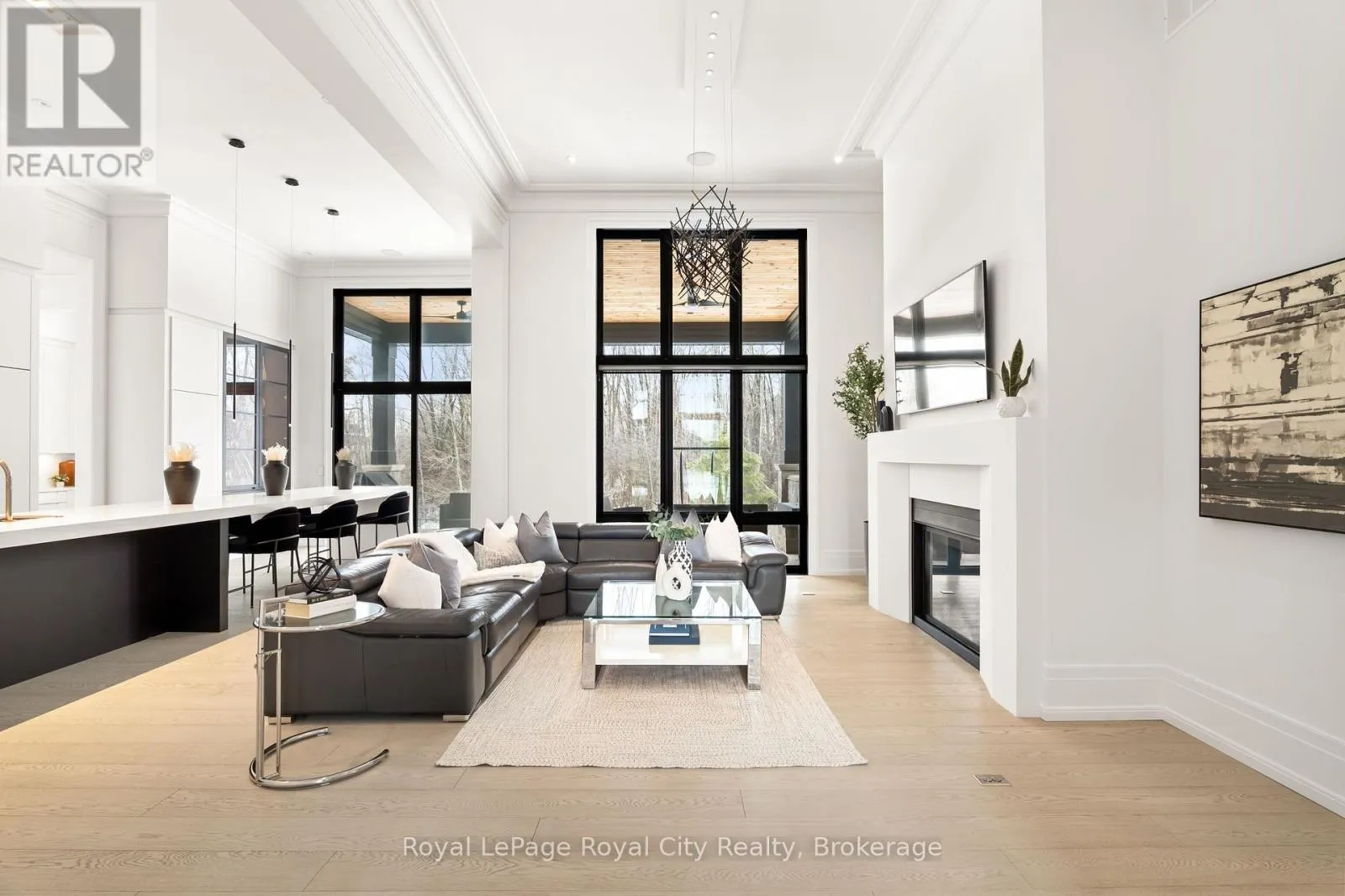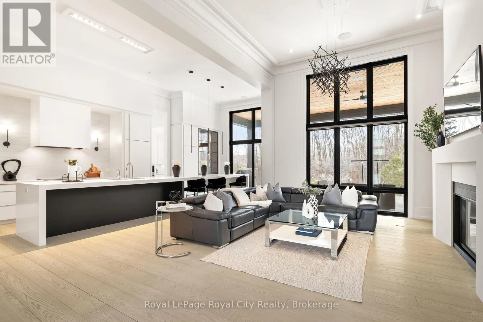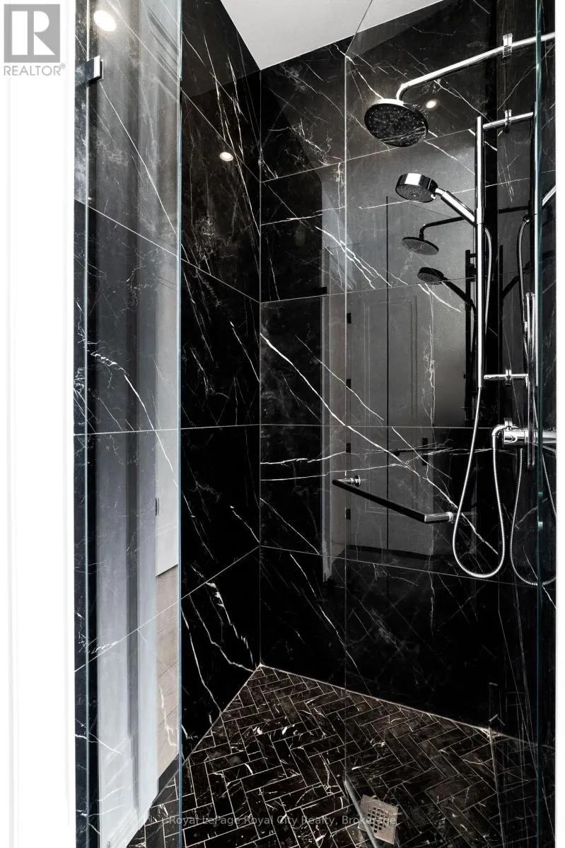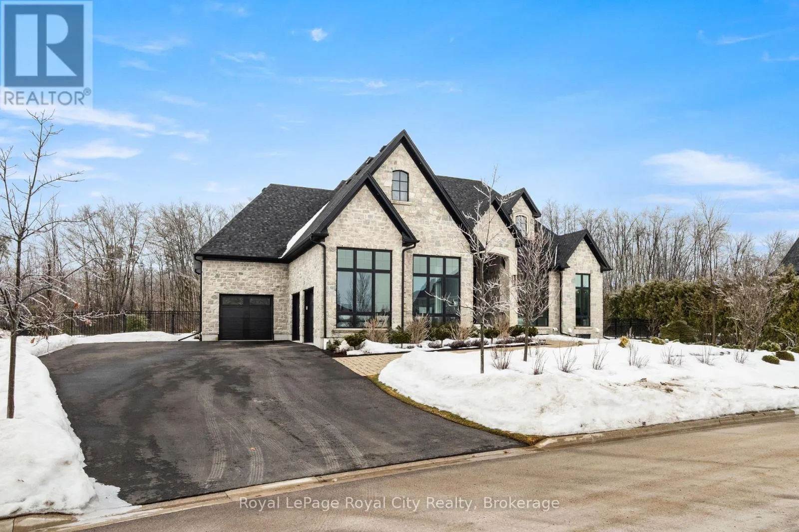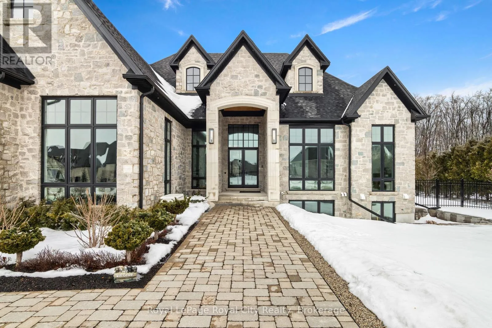 Cross Streets: Wellington Rd 34. ** Directions: Turn off Wellington Rd 34 into the Heritage Lake Estates, and follow Heritage Lake Drive into the community until you reach 153 Heritage Lake Drive. Welcome to life inside Heritage Lake Estates - a private, gated enclave in Puslinch known for its mature surroundings and beautiful custom homes. Set on a premium half-acre pie-shaped lot backing onto mature treelines, this custom stone bungalow offers privacy without compromise. With 2,252 square feet on the main floor and soaring 14-foot ceilings, the principal living space is defined by symmetry, scale, and natural light. A custom fireplace anchors the living room, while upgraded crown moulding and floor-to-ceiling windows create a refined yet inviting atmosphere.The kitchen and dining area are gallery-inspired in design, centred around a striking 21-foot stone waterfall island with seating for eight. Integrated cabinetry conceals premium WOLF appliances for a seamless aesthetic. Heated floors, custom lighting, and electric blinds reflect the many thoughtful upgrades woven throughout the home. Step outside to a covered back patio complete with built-in heaters and an impressive 350 sq ft gas fire feature, overlooking the fenced yard and tranquil forest backdrop - ideal for elevated, year-round outdoor living.The primary suite is a private retreat, offering 12ft ceilings, floor to ceiling windows, a generous walk-in closet and spa-inspired five-piece ensuite with Jet Spa shower system. Across from this, the well-appointed laundry room and additional main-floor bedroom, featuring with its own ensuite bath and walk-in closet, complete the main level. The fully finished lower level adds two bedrooms, each accompanied by an ensuite bathroom, a spacious recreation room with custom fireplace, dedicated office space, and a home gym - perfectly suited for growing families or multi-generational living. A functional mudroom with built-in cabinetry offers direct access to the heated three-car garage and walk-down access to the basement. 153 Heritage Lake Drive invites you to embrace a quiet kind of luxury, framed by the serenity of Puslinch Lake. (id:27476)