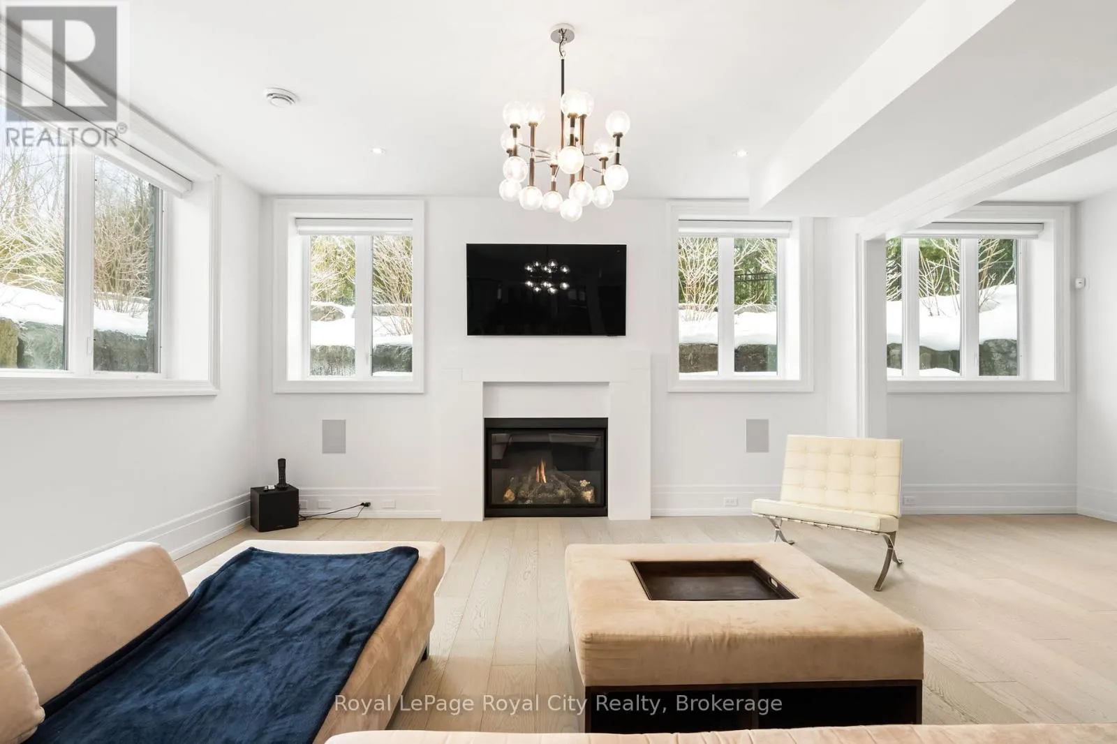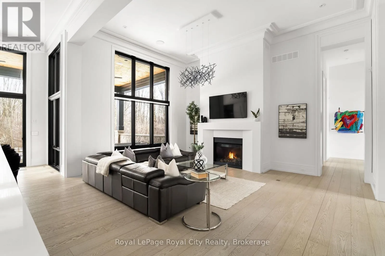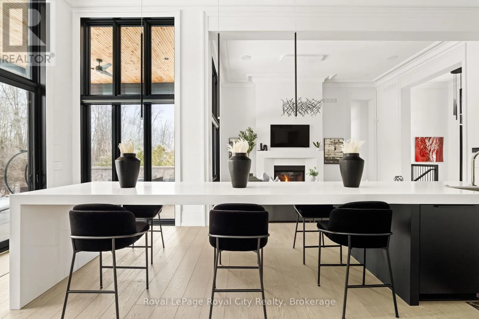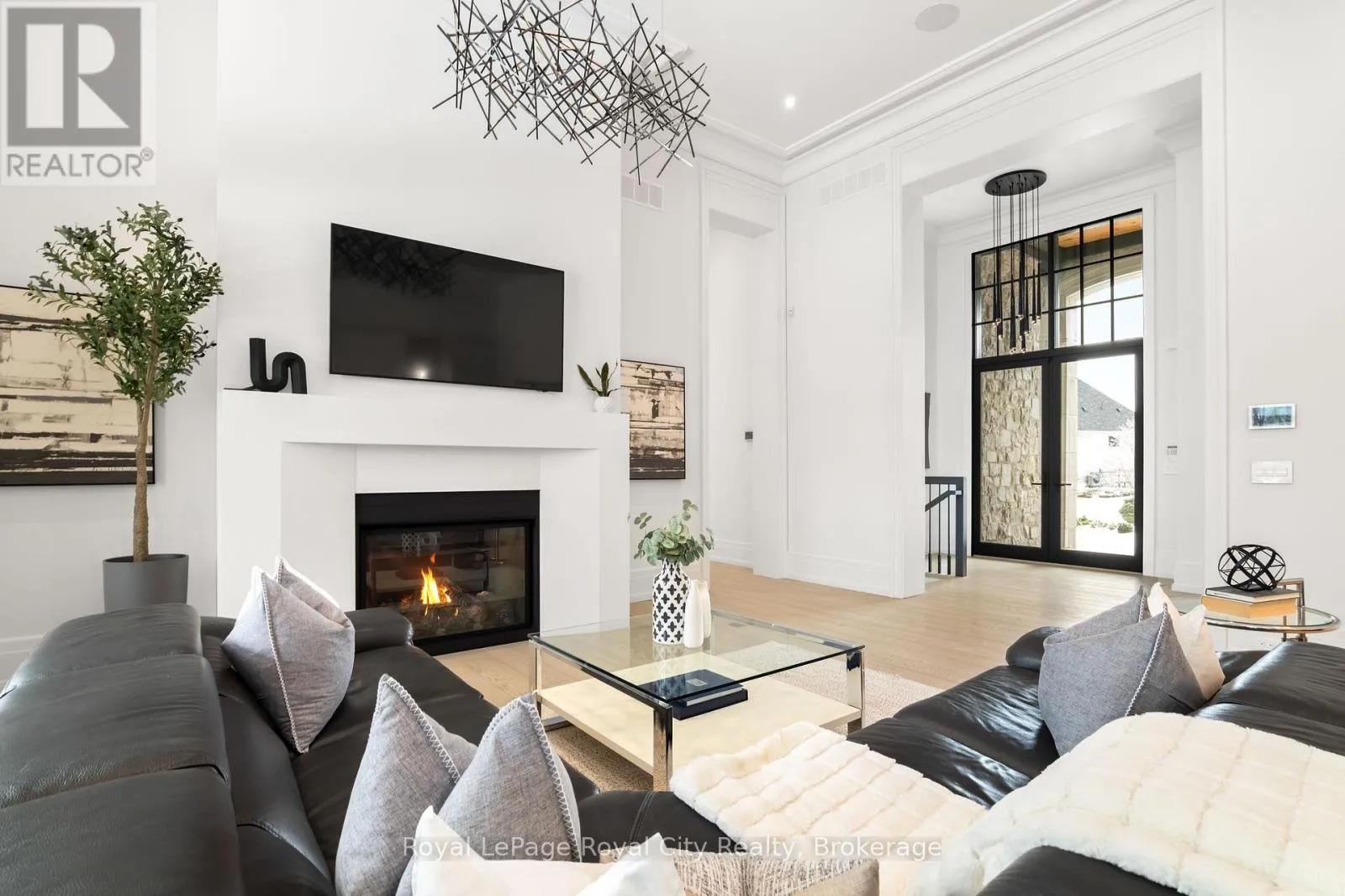 Cross Streets: Wellington Rd 34. ** Directions: Turn off Wellington Rd 34 into the Heritage Lake Estates, and follow Heritage Lake Drive into the community until you reach 153 Heritage Lake Drive. Welcome to life inside Heritage Lake Estates - a private, gated enclave in Puslinch known for its mature surroundings and beautiful custom homes. Set on a premium half-acre pie-shaped lot backing onto mature treelines, this custom stone bungalow offers privacy without compromise. With 2,252 square feet on the main floor and soaring 14-foot ceilings, the principal living space is defined by symmetry, scale, and natural light. A custom fireplace anchors the living room, while upgraded crown moulding and floor-to-ceiling windows create a refined yet inviting atmosphere.The kitchen and dining area are gallery-inspired in design, centred around a striking 21-foot stone waterfall island with seating for eight. Integrated cabinetry conceals premium WOLF appliances for a seamless aesthetic. Heated floors, custom lighting, and electric blinds reflect the many thoughtful upgrades woven throughout the home. Step outside to a covered back patio complete with built-in heaters and an impressive 350 sq ft gas fire feature, overlooking the fenced yard and tranquil forest backdrop - ideal for elevated, year-round outdoor living.The primary suite is a private retreat, offering 12ft ceilings, floor to ceiling windows, a generous walk-in closet and spa-inspired five-piece ensuite with Jet Spa shower system. Across from this, the well-appointed laundry room and additional main-floor bedroom, featuring with its own ensuite bath and walk-in closet, complete the main level. The fully finished lower level adds two bedrooms, each accompanied by an ensuite bathroom, a spacious recreation room with custom fireplace, dedicated office space, and a home gym - perfectly suited for growing families or multi-generational living. A functional mudroom with built-in cabinetry offers direct access to the heated three-car garage and walk-down access to the basement. 153 Heritage Lake Drive invites you to embrace a quiet kind of luxury, framed by the serenity of Puslinch Lake. (id:27476)