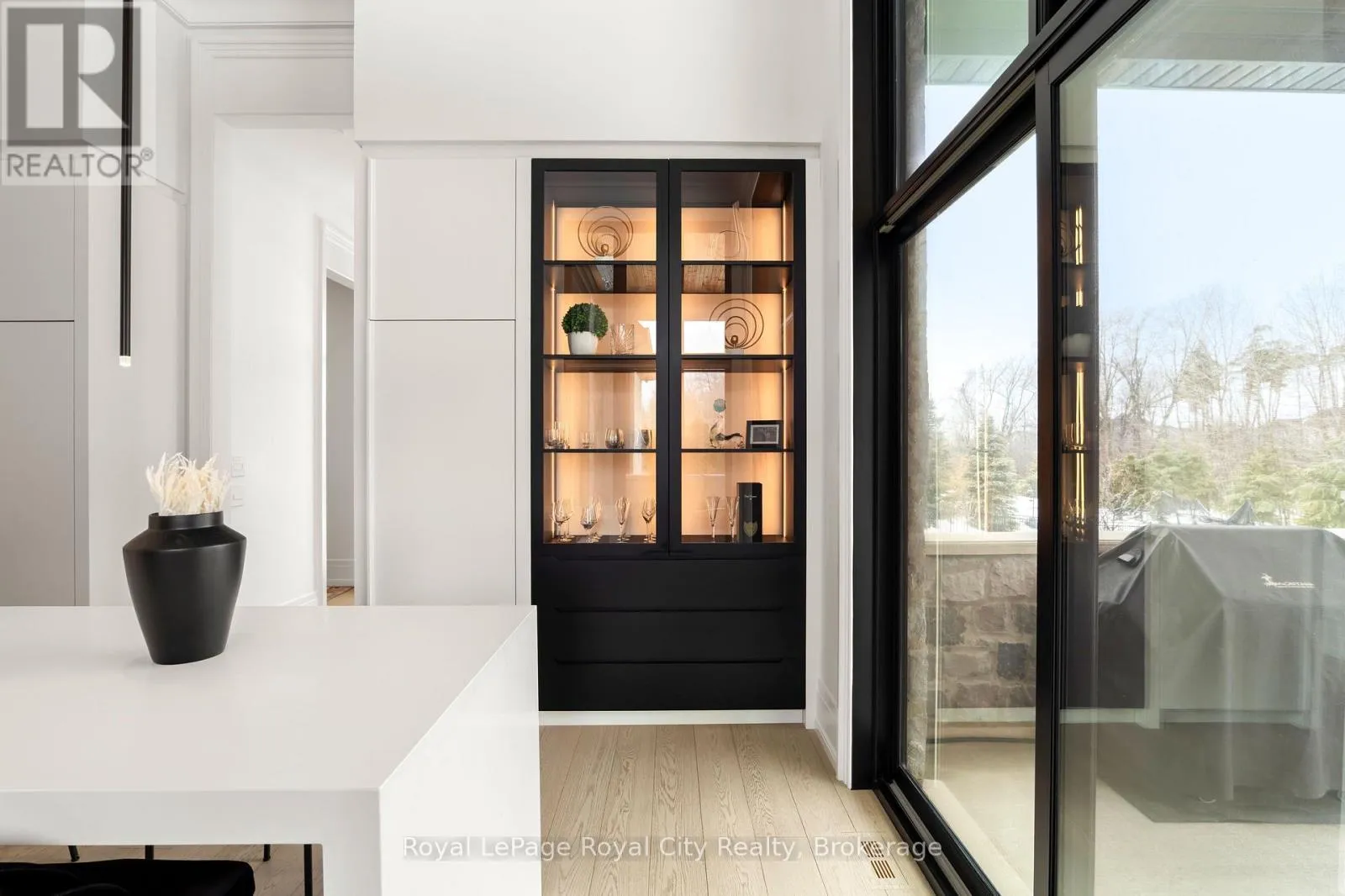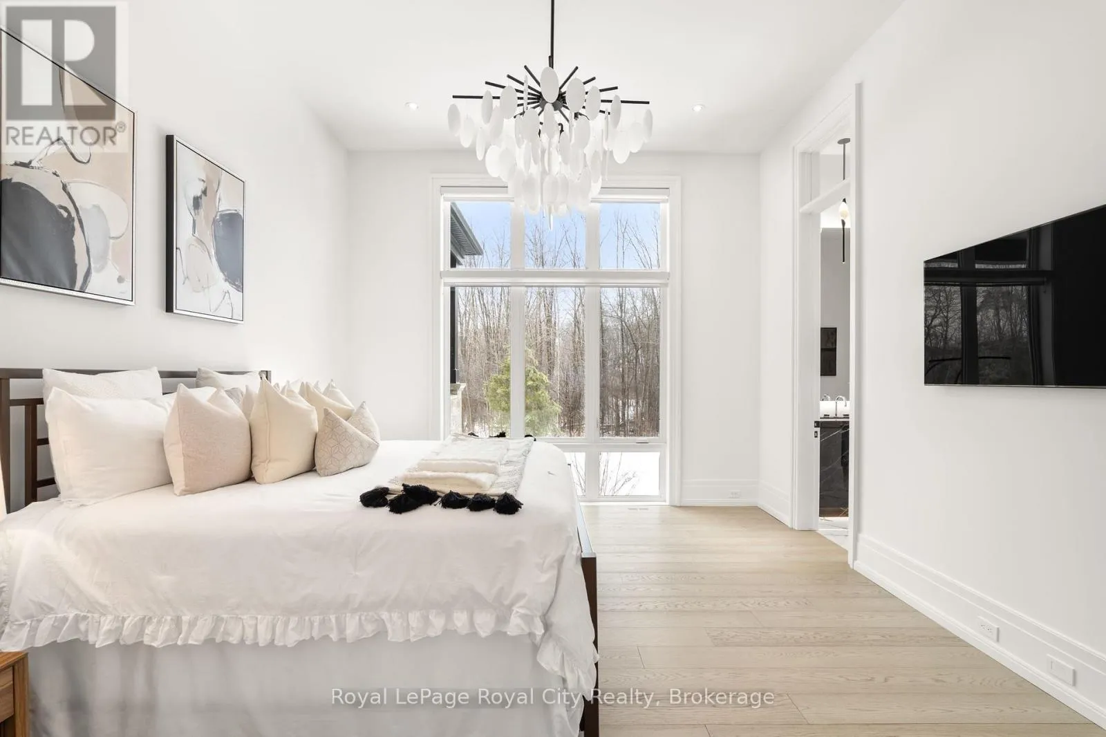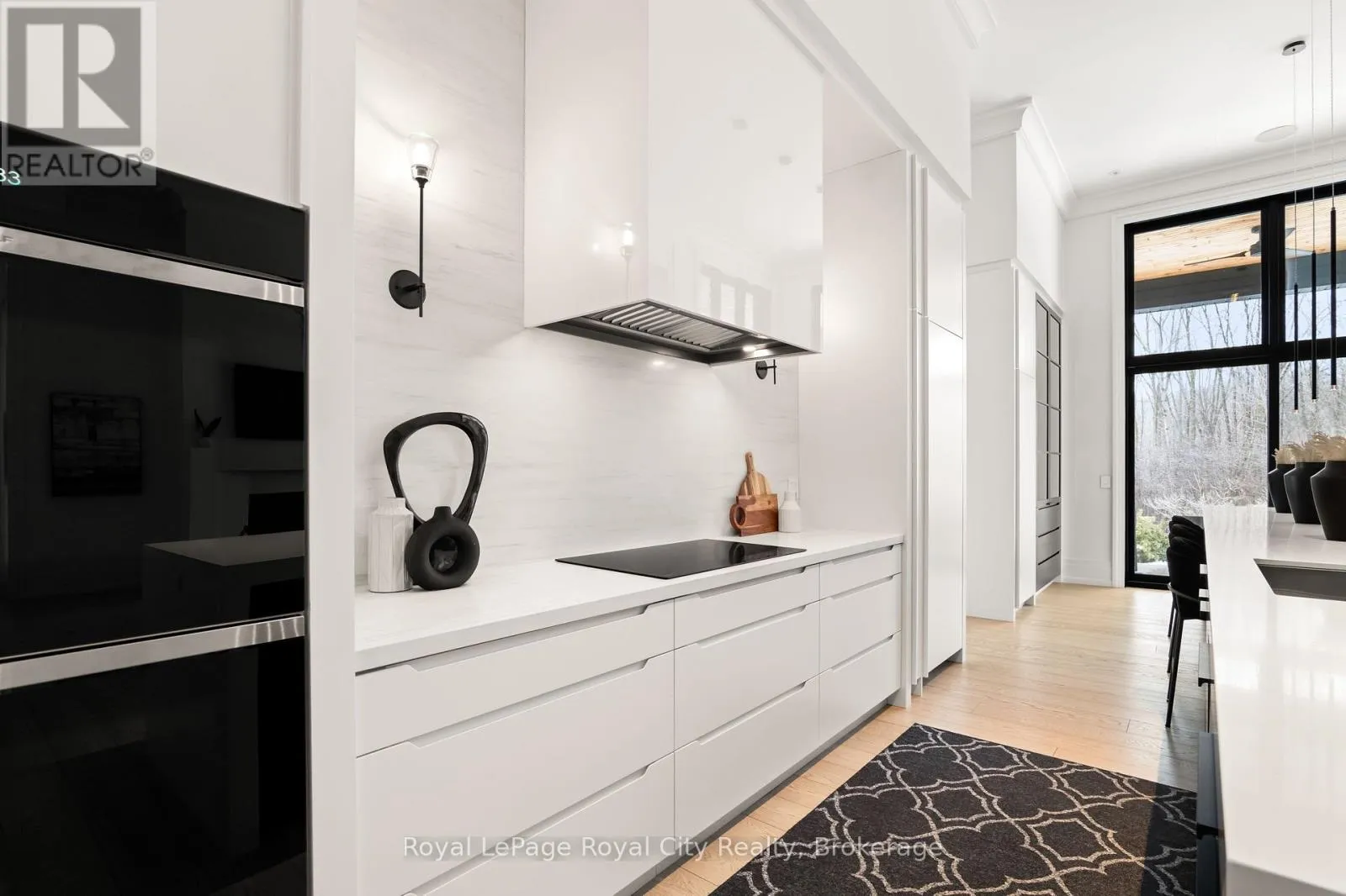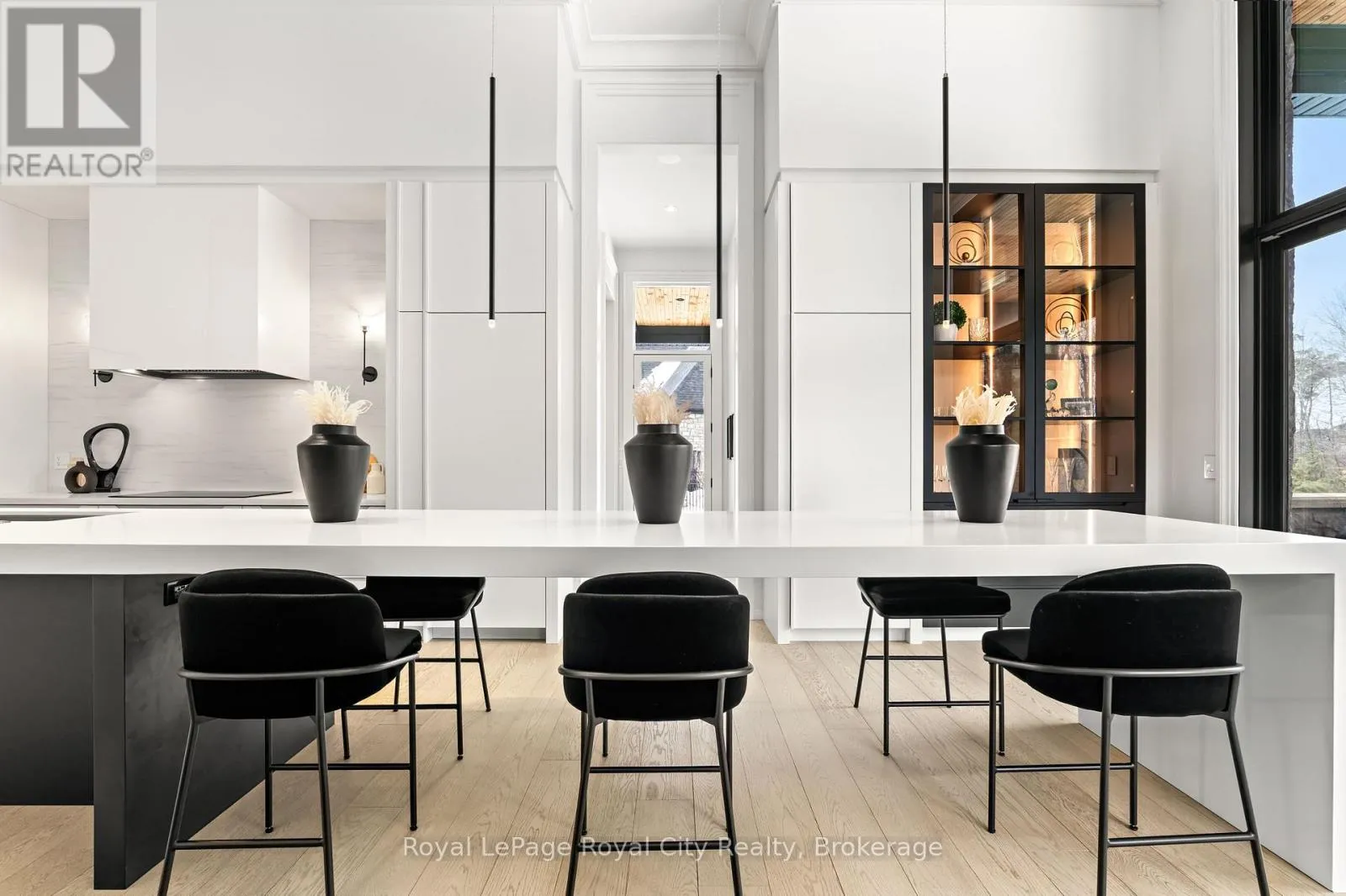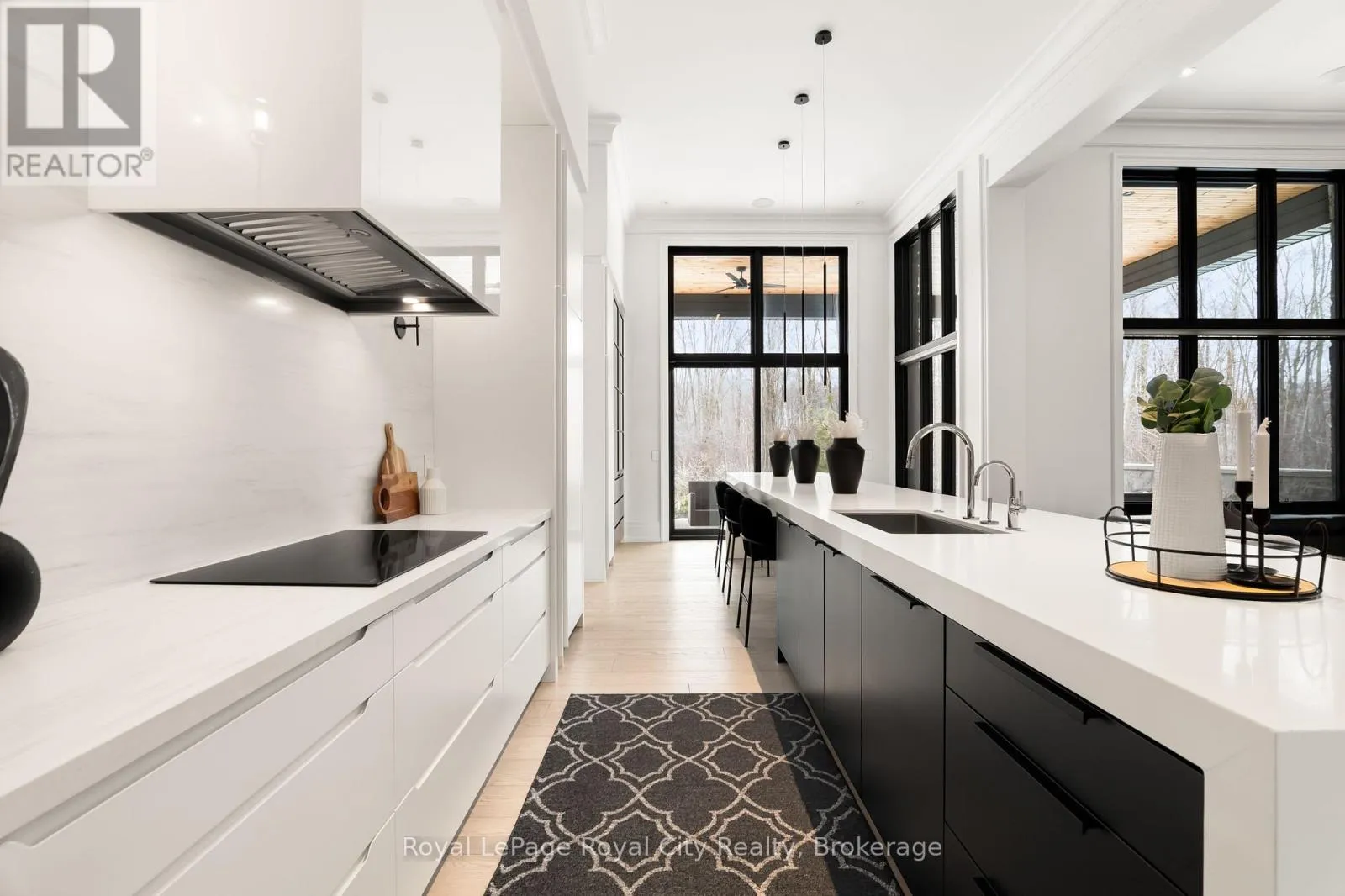 Cross Streets: Wellington Rd 34. ** Directions: Turn off Wellington Rd 34 into the Heritage Lake Estates, and follow Heritage Lake Drive into the community until you reach 153 Heritage Lake Drive. Welcome to life inside Heritage Lake Estates - a private, gated enclave in Puslinch known for its mature surroundings and beautiful custom homes. Set on a premium half-acre pie-shaped lot backing onto mature treelines, this custom stone bungalow offers privacy without compromise. With 2,252 square feet on the main floor and soaring 14-foot ceilings, the principal living space is defined by symmetry, scale, and natural light. A custom fireplace anchors the living room, while upgraded crown moulding and floor-to-ceiling windows create a refined yet inviting atmosphere.The kitchen and dining area are gallery-inspired in design, centred around a striking 21-foot stone waterfall island with seating for eight. Integrated cabinetry conceals premium WOLF appliances for a seamless aesthetic. Heated floors, custom lighting, and electric blinds reflect the many thoughtful upgrades woven throughout the home. Step outside to a covered back patio complete with built-in heaters and an impressive 350 sq ft gas fire feature, overlooking the fenced yard and tranquil forest backdrop - ideal for elevated, year-round outdoor living.The primary suite is a private retreat, offering 12ft ceilings, floor to ceiling windows, a generous walk-in closet and spa-inspired five-piece ensuite with Jet Spa shower system. Across from this, the well-appointed laundry room and additional main-floor bedroom, featuring with its own ensuite bath and walk-in closet, complete the main level. The fully finished lower level adds two bedrooms, each accompanied by an ensuite bathroom, a spacious recreation room with custom fireplace, dedicated office space, and a home gym - perfectly suited for growing families or multi-generational living. A functional mudroom with built-in cabinetry offers direct access to the heated three-car garage and walk-down access to the basement. 153 Heritage Lake Drive invites you to embrace a quiet kind of luxury, framed by the serenity of Puslinch Lake. (id:27476)