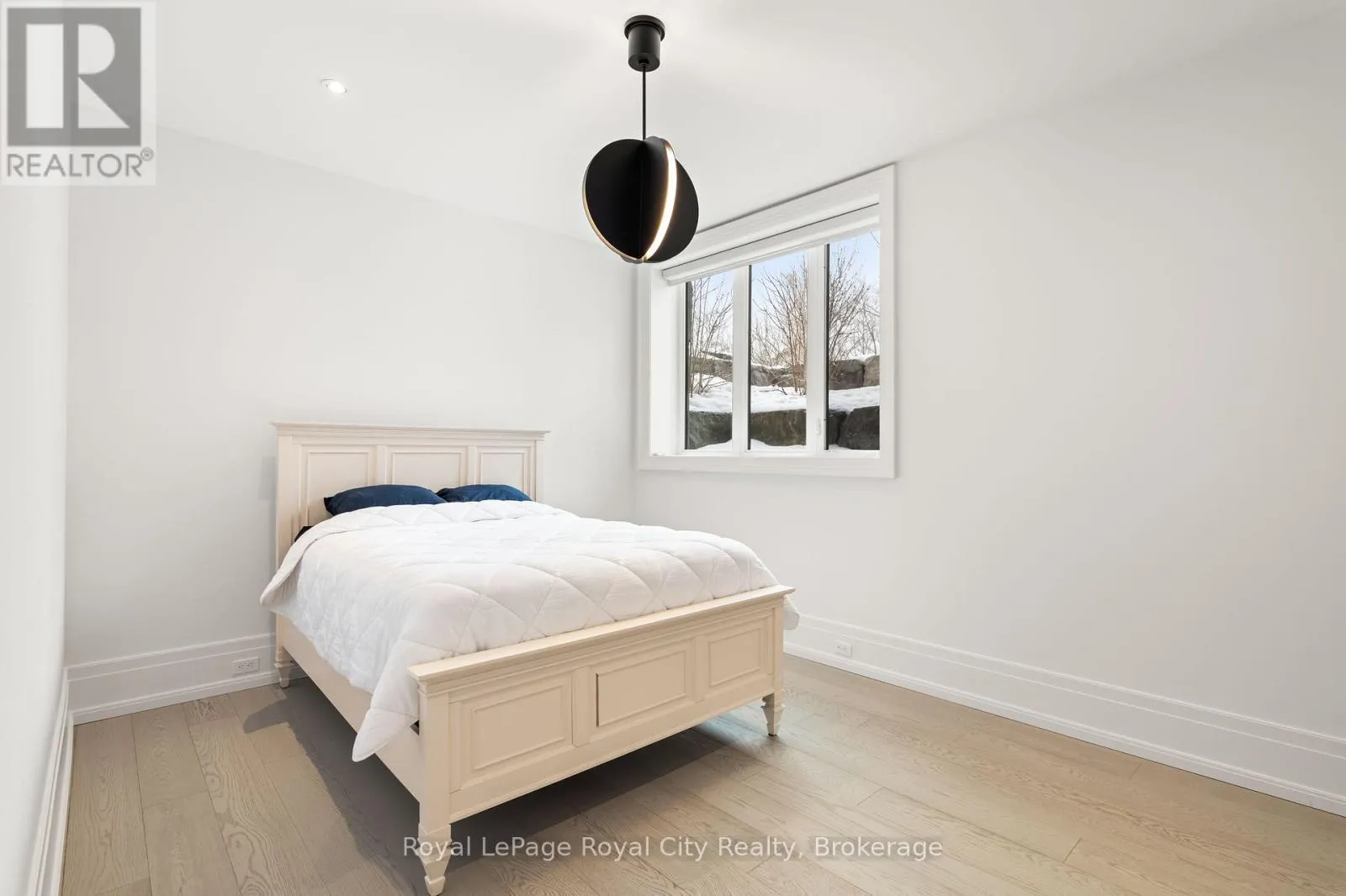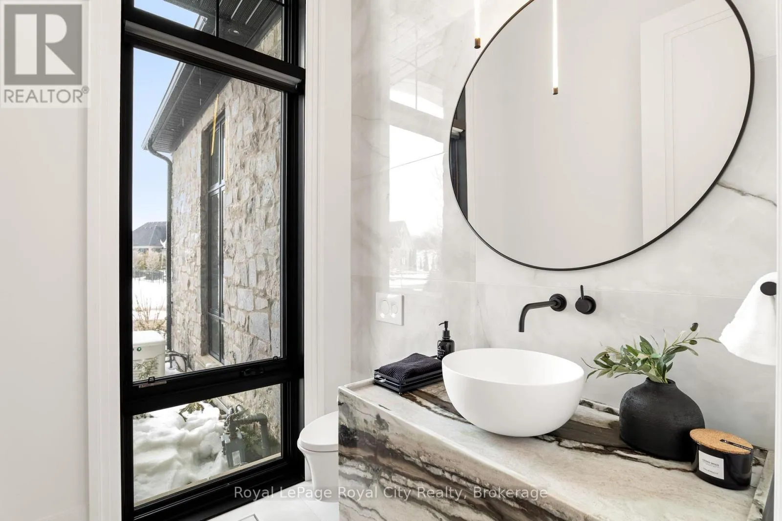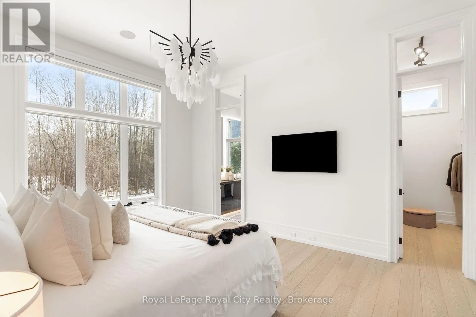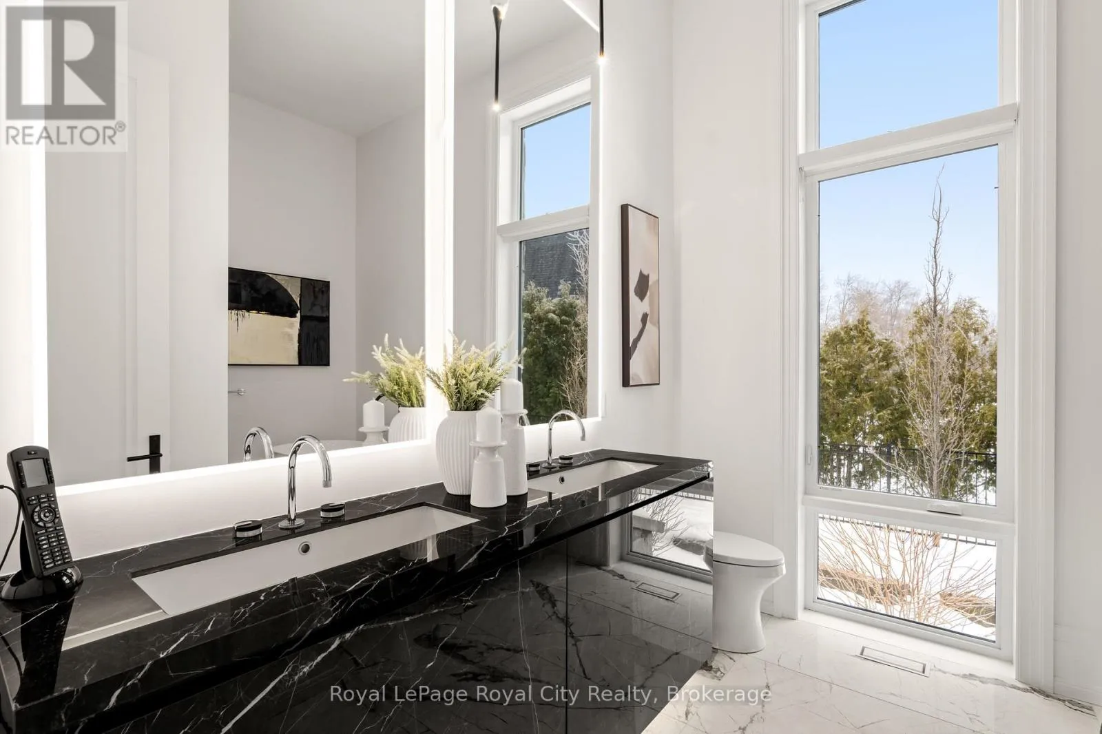 Cross Streets: Wellington Rd 34. ** Directions: Turn off Wellington Rd 34 into the Heritage Lake Estates, and follow Heritage Lake Drive into the community until you reach 153 Heritage Lake Drive. Welcome to life inside Heritage Lake Estates - a private, gated enclave in Puslinch known for its mature surroundings and beautiful custom homes. Set on a premium half-acre pie-shaped lot backing onto mature treelines, this custom stone bungalow offers privacy without compromise. With 2,252 square feet on the main floor and soaring 14-foot ceilings, the principal living space is defined by symmetry, scale, and natural light. A custom fireplace anchors the living room, while upgraded crown moulding and floor-to-ceiling windows create a refined yet inviting atmosphere.The kitchen and dining area are gallery-inspired in design, centred around a striking 21-foot stone waterfall island with seating for eight. Integrated cabinetry conceals premium WOLF appliances for a seamless aesthetic. Heated floors, custom lighting, and electric blinds reflect the many thoughtful upgrades woven throughout the home. Step outside to a covered back patio complete with built-in heaters and an impressive 350 sq ft gas fire feature, overlooking the fenced yard and tranquil forest backdrop - ideal for elevated, year-round outdoor living.The primary suite is a private retreat, offering 12ft ceilings, floor to ceiling windows, a generous walk-in closet and spa-inspired five-piece ensuite with Jet Spa shower system. Across from this, the well-appointed laundry room and additional main-floor bedroom, featuring with its own ensuite bath and walk-in closet, complete the main level. The fully finished lower level adds two bedrooms, each accompanied by an ensuite bathroom, a spacious recreation room with custom fireplace, dedicated office space, and a home gym - perfectly suited for growing families or multi-generational living. A functional mudroom with built-in cabinetry offers direct access to the heated three-car garage and walk-down access to the basement. 153 Heritage Lake Drive invites you to embrace a quiet kind of luxury, framed by the serenity of Puslinch Lake. (id:27476)