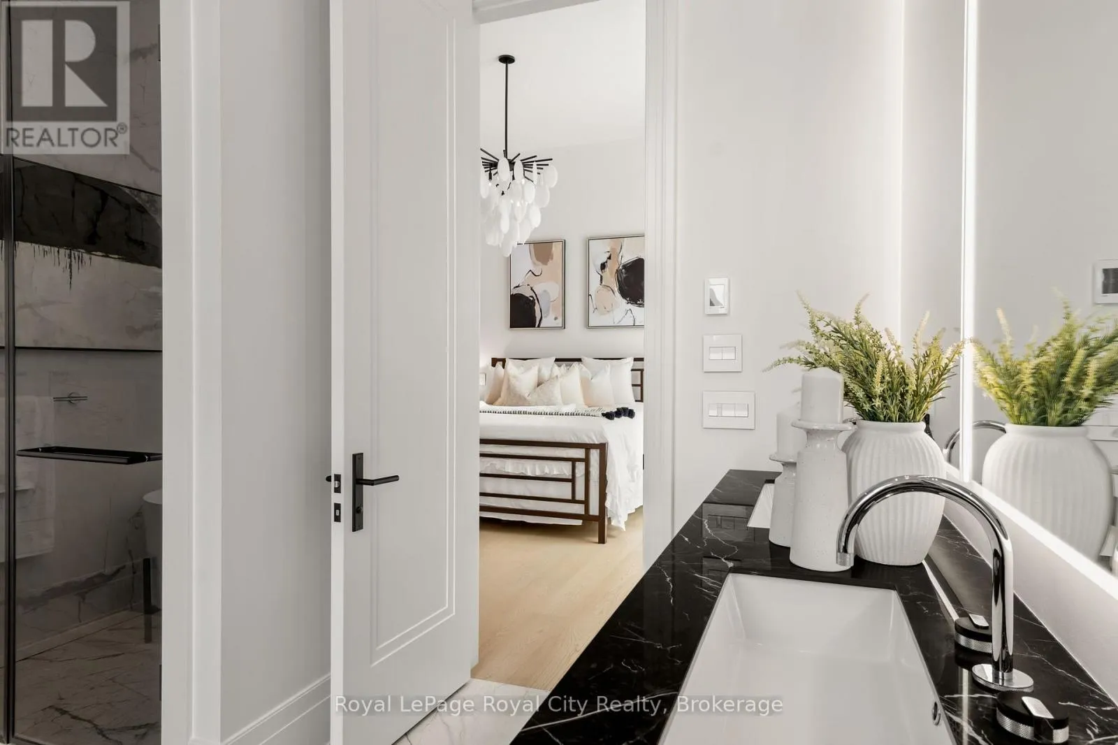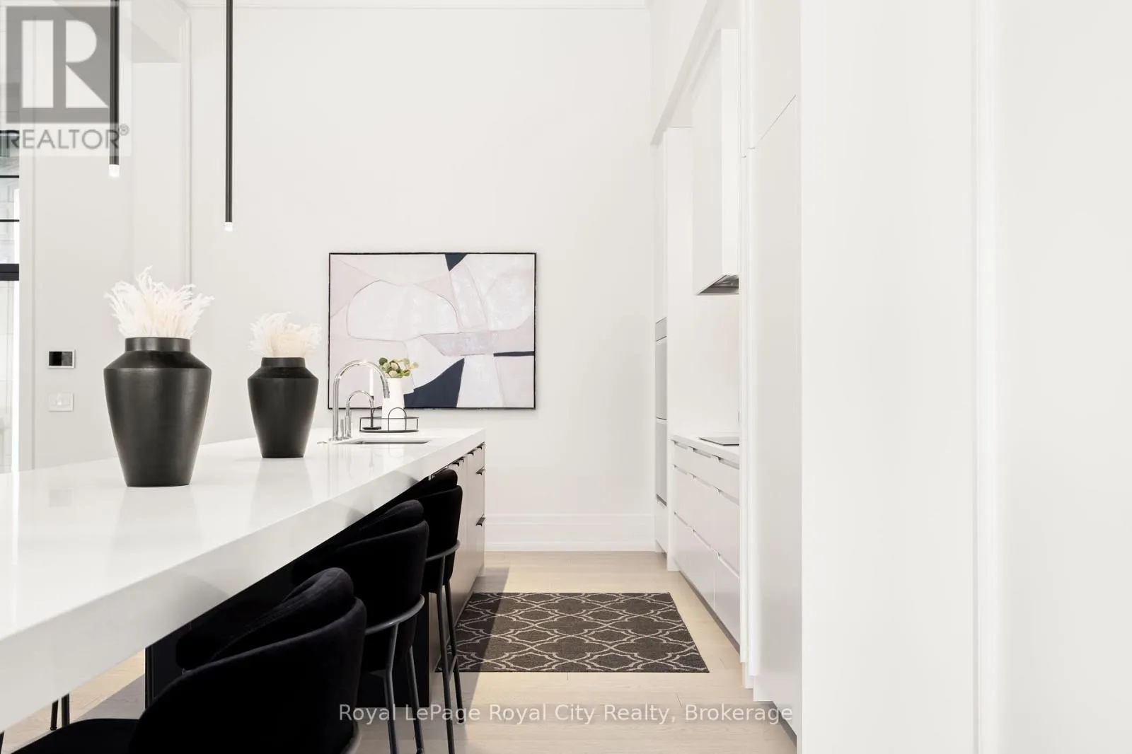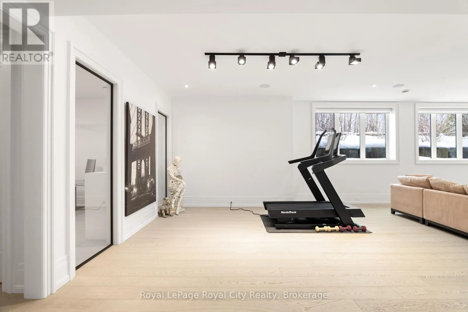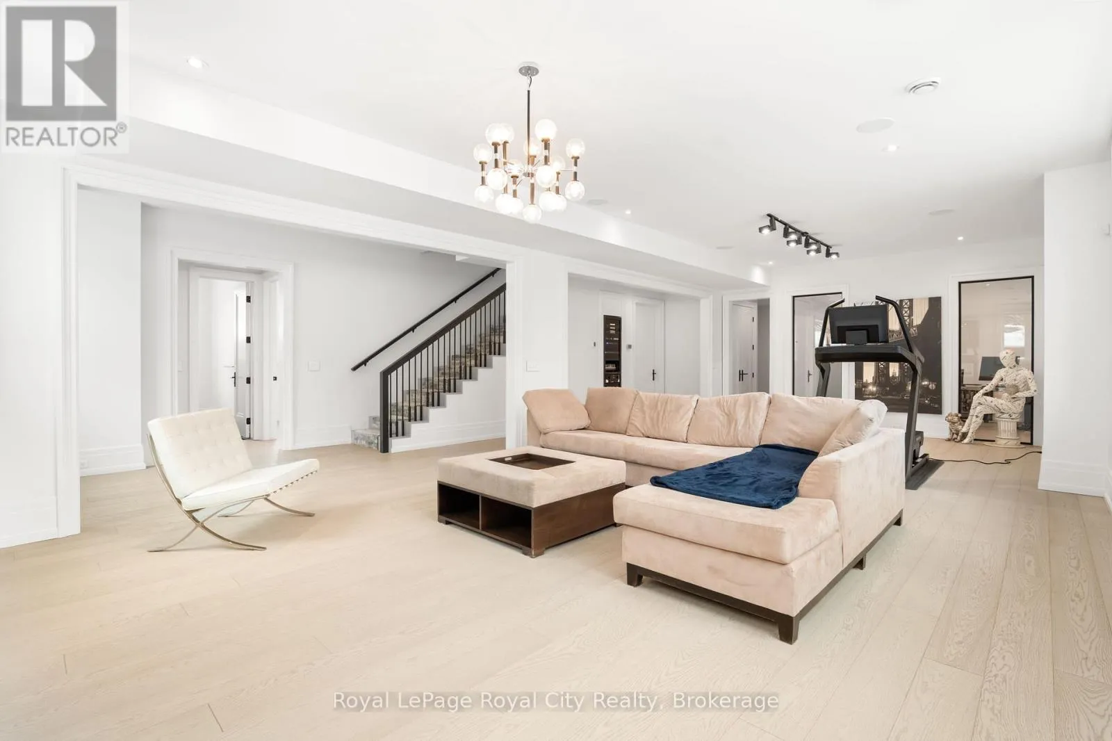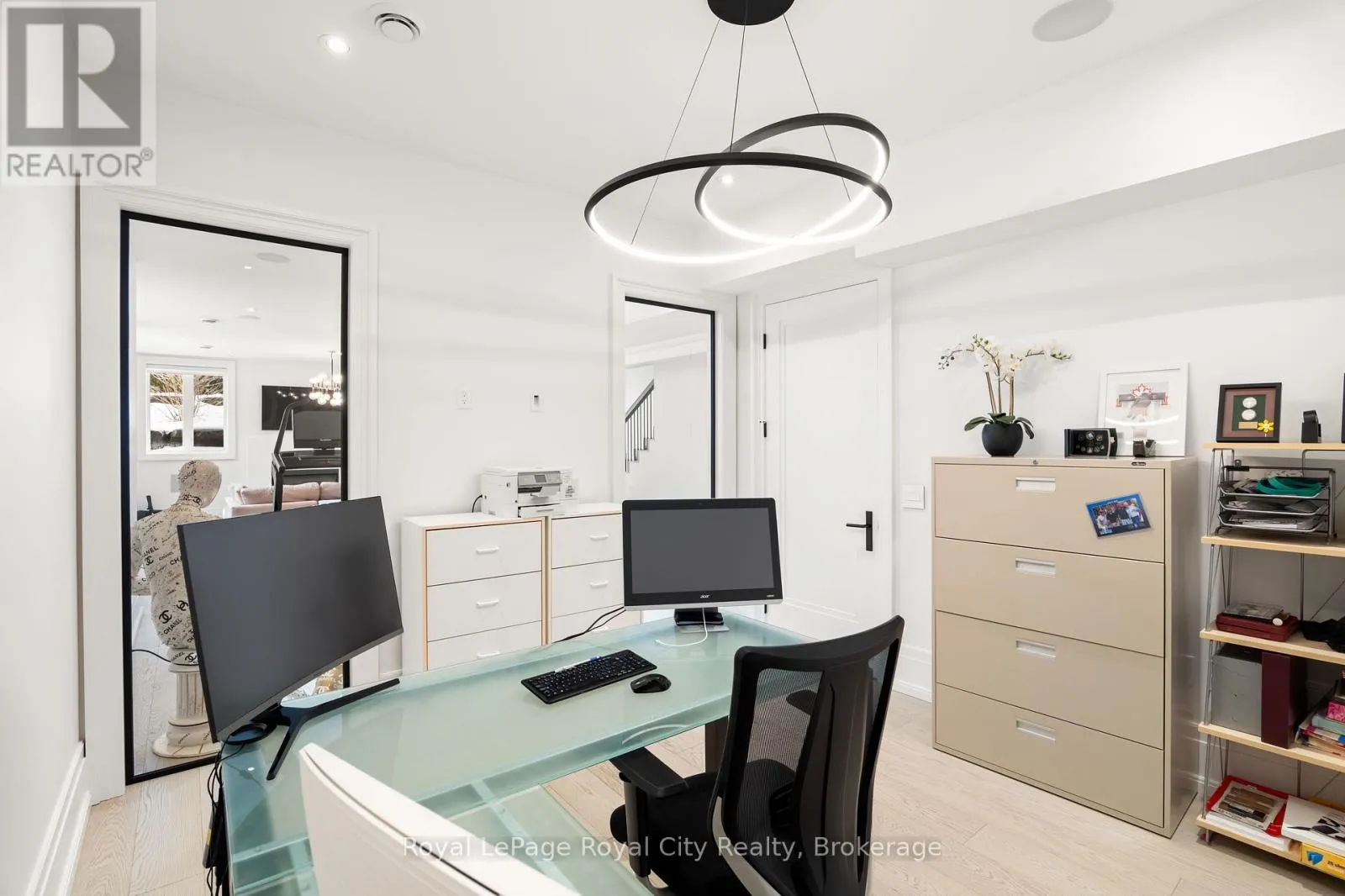 Cross Streets: Wellington Rd 34. ** Directions: Turn off Wellington Rd 34 into the Heritage Lake Estates, and follow Heritage Lake Drive into the community until you reach 153 Heritage Lake Drive. Welcome to life inside Heritage Lake Estates - a private, gated enclave in Puslinch known for its mature surroundings and beautiful custom homes. Set on a premium half-acre pie-shaped lot backing onto mature treelines, this custom stone bungalow offers privacy without compromise. With 2,252 square feet on the main floor and soaring 14-foot ceilings, the principal living space is defined by symmetry, scale, and natural light. A custom fireplace anchors the living room, while upgraded crown moulding and floor-to-ceiling windows create a refined yet inviting atmosphere.The kitchen and dining area are gallery-inspired in design, centred around a striking 21-foot stone waterfall island with seating for eight. Integrated cabinetry conceals premium WOLF appliances for a seamless aesthetic. Heated floors, custom lighting, and electric blinds reflect the many thoughtful upgrades woven throughout the home. Step outside to a covered back patio complete with built-in heaters and an impressive 350 sq ft gas fire feature, overlooking the fenced yard and tranquil forest backdrop - ideal for elevated, year-round outdoor living.The primary suite is a private retreat, offering 12ft ceilings, floor to ceiling windows, a generous walk-in closet and spa-inspired five-piece ensuite with Jet Spa shower system. Across from this, the well-appointed laundry room and additional main-floor bedroom, featuring with its own ensuite bath and walk-in closet, complete the main level. The fully finished lower level adds two bedrooms, each accompanied by an ensuite bathroom, a spacious recreation room with custom fireplace, dedicated office space, and a home gym - perfectly suited for growing families or multi-generational living. A functional mudroom with built-in cabinetry offers direct access to the heated three-car garage and walk-down access to the basement. 153 Heritage Lake Drive invites you to embrace a quiet kind of luxury, framed by the serenity of Puslinch Lake. (id:27476)
