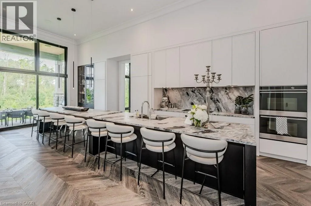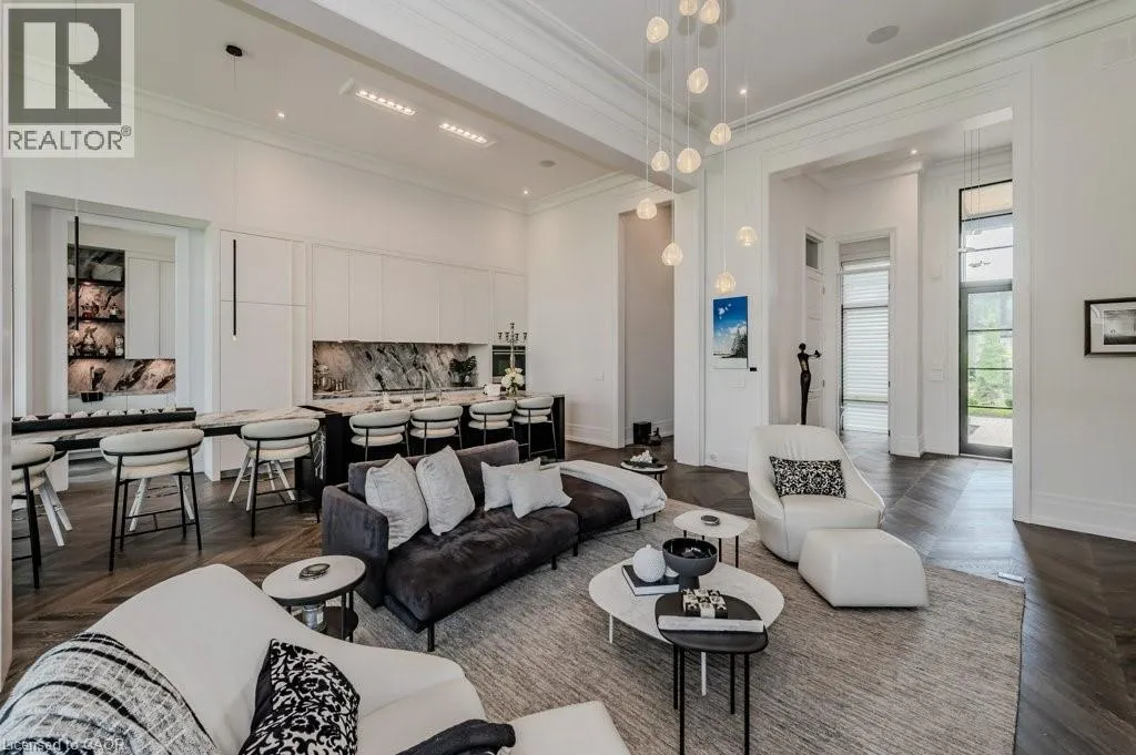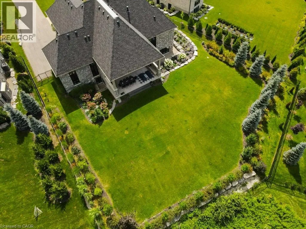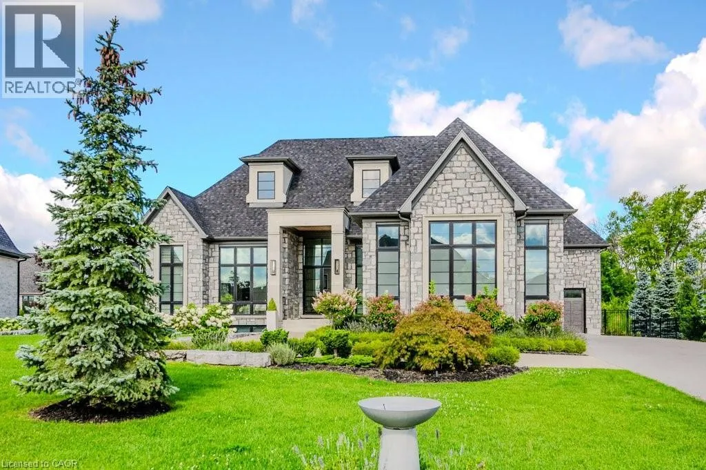 401 TO EXIT 295 - Right on Wellington Rd. 34 - Right on Heritage Lake Dr. A rare offering of timeless elegance and uncompromising craftsmanship, this extraordinary residence blends luxury living with serene lakeside beauty. Nestled on a half-acre estate within the exclusive gated community of Heritage Lake Estates, this Net Zero Ready home offers privacy, tranquility, and refined design in one of the regionâs most picturesque settings. From the moment you arrive, the striking natural stone façade sets the tone for the sophistication found throughout the home. Inside, over 4,000 square feet of thoughtfully designed living space unfolds with effortless style, featuring 4 bedrooms and 4.5 beautifully appointed bathrooms. The heart of the home is defined by dramatic 14-foot ceilings and expansive floor-to-ceiling windows, creating a breathtaking sense of openness while bathing the interiors in natural light and capturing spectacular sunset views. Every detail has been carefully curated. Elegant chevron engineered hardwood flooring, plaster crown mouldings, and 9-foot solid doors with transoms add architectural character, while the custom fireplace mantel anchors the living space with warmth and sophistication. Designed for both everyday living and entertaining, the gourmet kitchen showcases an extraordinary 22-foot island, walk-in pantry, and stunning stone slab countertops and backsplashâa true centerpiece for gatherings. Spa-inspired bathrooms elevate daily living with heated marble floors, custom vanities, and subtle under-cabinet lighting. Comfort and innovation continue throughout the home with radiant in-floor heating in both the lower level and garage, delivering exceptional year-round comfort. Outdoors, the fully fenced backyard views mature trees, offering a peaceful and private natural settingâperfect for relaxing or simply enjoying the quiet beauty of the surrounding landscape. A home where luxury, craftsmanship, and lakeside serenity come together effortlesslyâthis is a residence designed not only to impress, but experienced. (id:27476)