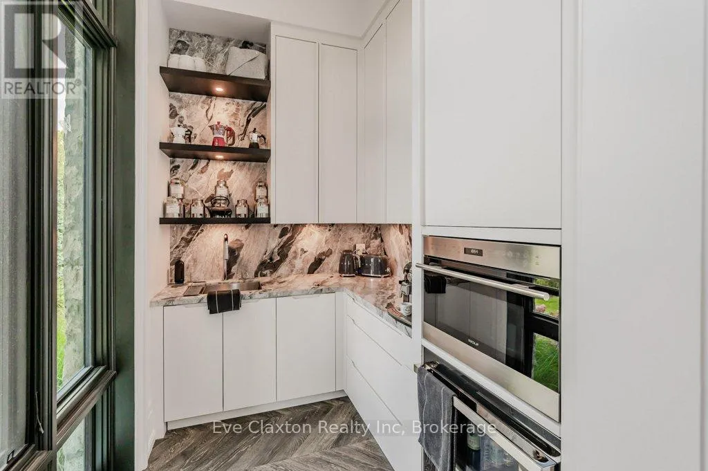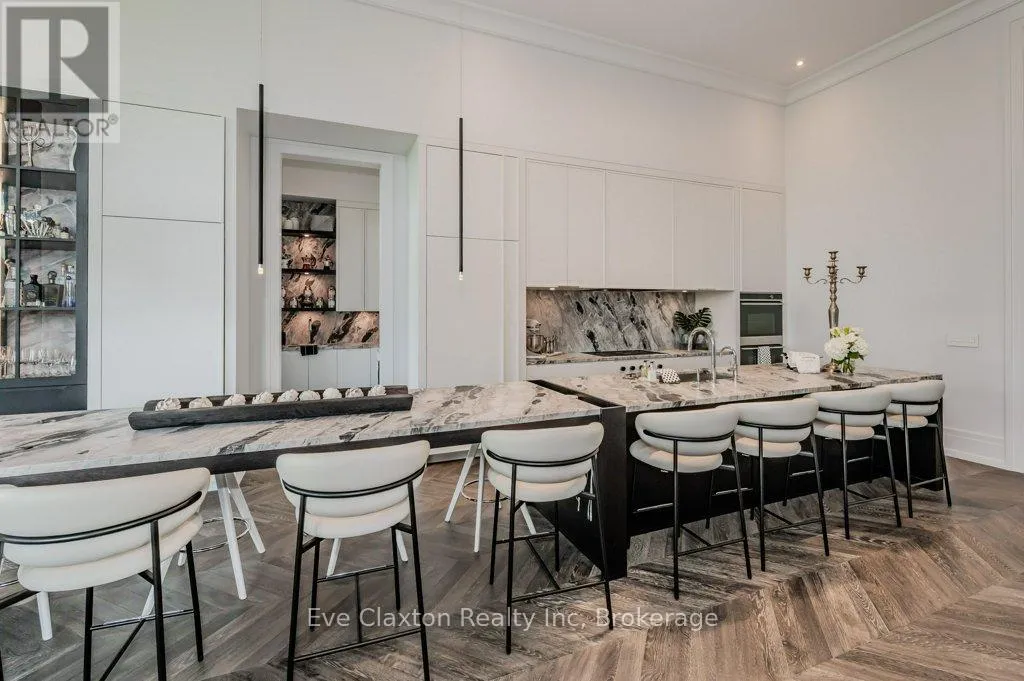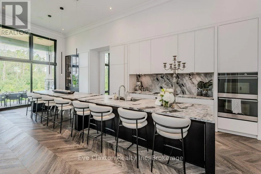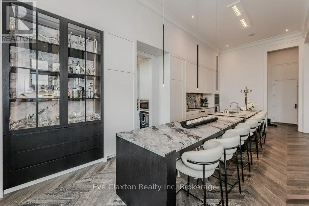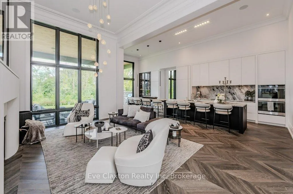 Cross Streets: 401 TO EXIT 295 - Right on Wellington Rd. 34 - Right on Heritage Lake Dr. ** Directions: 401 TO EXIT 295 - Right on Wellington Rd. 34 - Right on Heritage Lake Dr. A rare offering of timeless elegance and uncompromising craftsmanship, this extraordinary residence blends luxury living with serene lakeside beauty. Nestled on a half-acre estate within the exclusive gated community of Heritage Lake Estates, this Net Zero Ready home offers privacy, tranquility, and refined design in one of the region's most picturesque settings.From the moment you arrive, the striking natural stone façade sets the tone for the sophistication found throughout the home. Inside, over 4,000 square feet of thoughtfully designed living space unfolds with effortless style, featuring 4 bedrooms and 4.5 beautifully appointed bathrooms.The heart of the home is defined by dramatic 14-foot ceilings and expansive floor-to-ceiling windows, creating a breathtaking sense of openness while bathing the interiors in natural light and capturing spectacular sunset views.Every detail has been carefully curated. Elegant chevron engineered hardwood flooring, plaster crown mouldings, and 9-foot solid doors with transoms add architectural character, while the custom fireplace mantel anchors the living space with warmth and sophistication.Designed for both everyday living and entertaining, the gourmet kitchen showcases an extraordinary 22-foot island, walk-in pantry, and stunning stone slab countertops and backsplash-a true centerpiece for gatherings.Spa-inspired bathrooms elevate daily living with heated marble floors, custom vanities, and subtle under-cabinet lighting. Comfort and innovation continue throughout the home with radiant in-floor heating in both the lower level and garage, delivering exceptional year-round comfort.Outdoors, the fully fenced backyard views mature trees, offering a peaceful and private natural setting-perfect for relaxing or simply enjoying the quiet beauty of the surrounding landscape.A home where luxury, craftsmanship, and lakeside serenity come together effortlessly-this is a residence designed not only to impress, but to be experienced (id:27476)