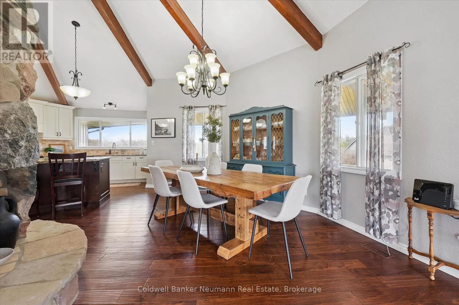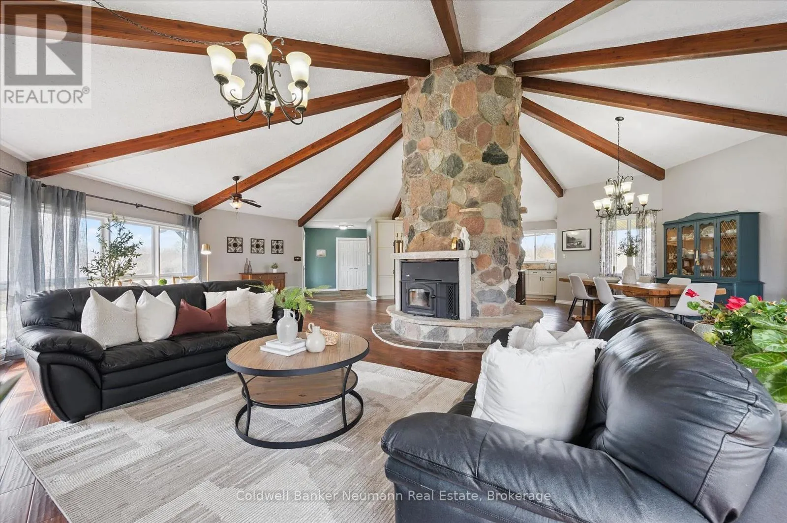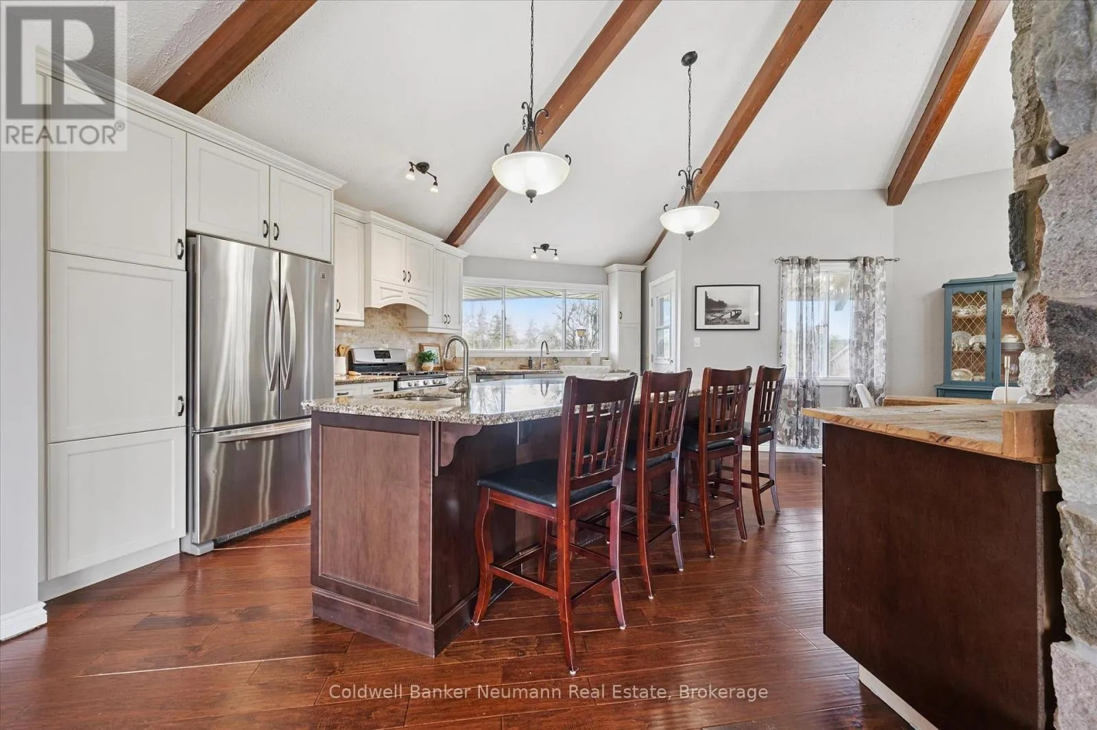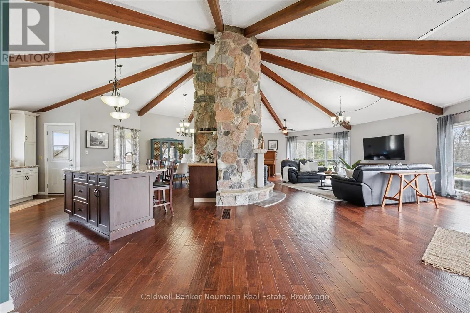 Cross Streets: Brock Rd. S. & Old Brock Rd. ** Directions: Brock Rd. Old Brock Rd. Mill Pond Views. Ski Chalet Soul. Two Acres in Aberfoyle - Some homes have a feeling the moment you walk in. This one - with over 4300 finished square feet - has it. At the centre of the main living space, a striking floor-to-ceiling cylindrical fireplace anchors soaring vaulted ceilings with exposed beams - a space that feels just as right on a snowy February night as it does on a summer evening with the doors open. From the kitchen patio or the primary bedroom's private deck, the view is the same: Mill Pond, calm and uninterrupted. This is your everyday backdrop. With five bedrooms, four bathrooms, and a fully finished basement, there's room to truly live - whether hosting, working from home, or simply spreading out the way a two-acre property allows. The primary suite features a soaker tub and separate shower, while the lower level adds two more bedrooms, a full bath with a soaker tub and separate shower, and a spacious rec room with ample storage. Outside, the detached garage and shop deliver real utility - space for vehicles, equipment, and a proper workshop - with a loft above ready to be a studio, retreat, or additional storage. Enjoy peace of mind with updated big ticket items: furnace 2020, AC 2021, new well 2021, new septic 2021, tankless water heater 2021. Set near the end of a quiet dead-end street, you're moments from top-rated schools, South Guelph amenities, and quick access to the 401. Country living, without compromise. (id:27476)