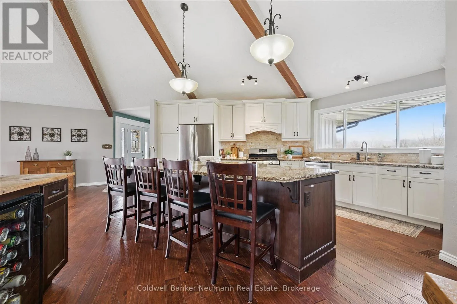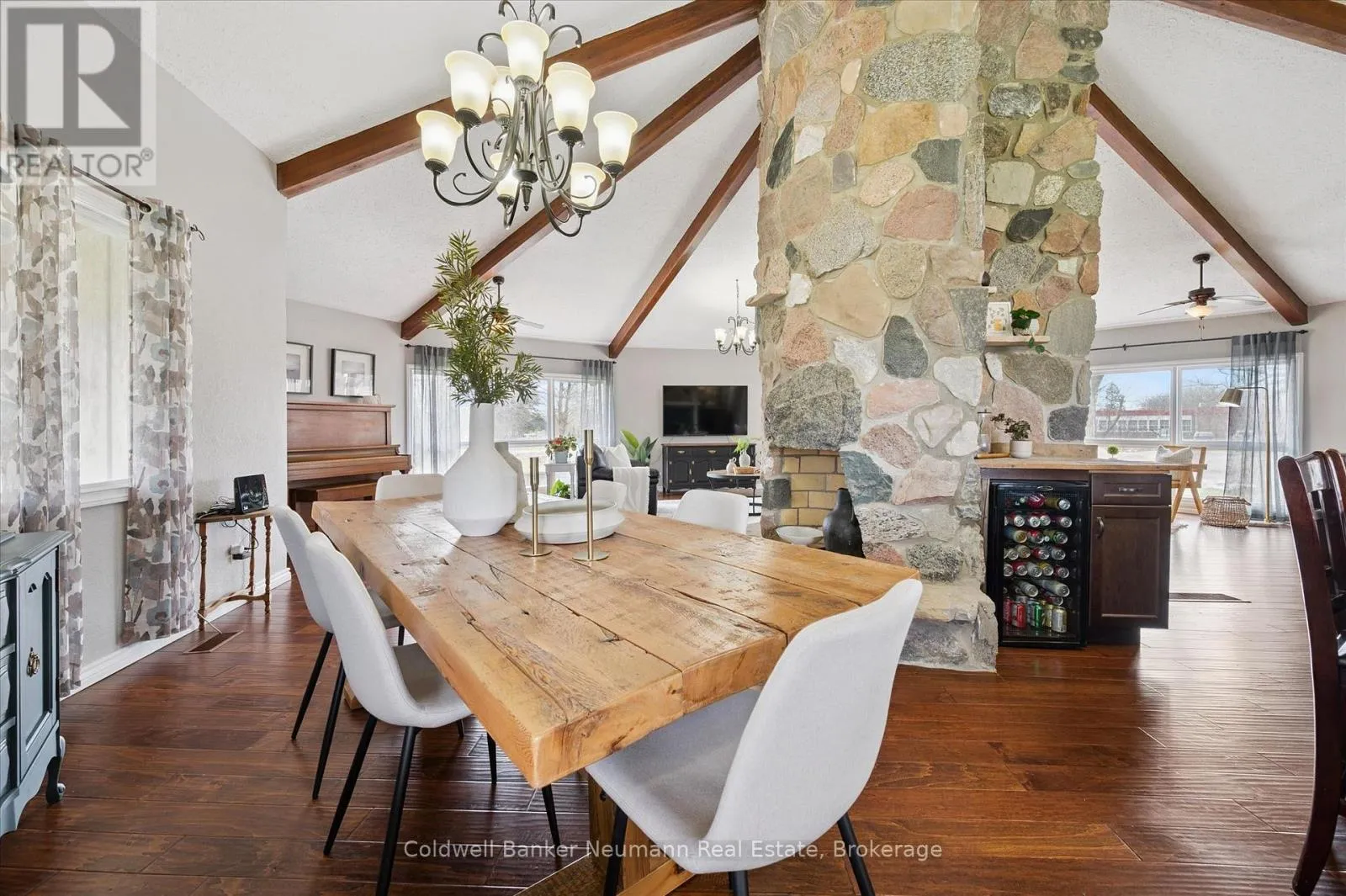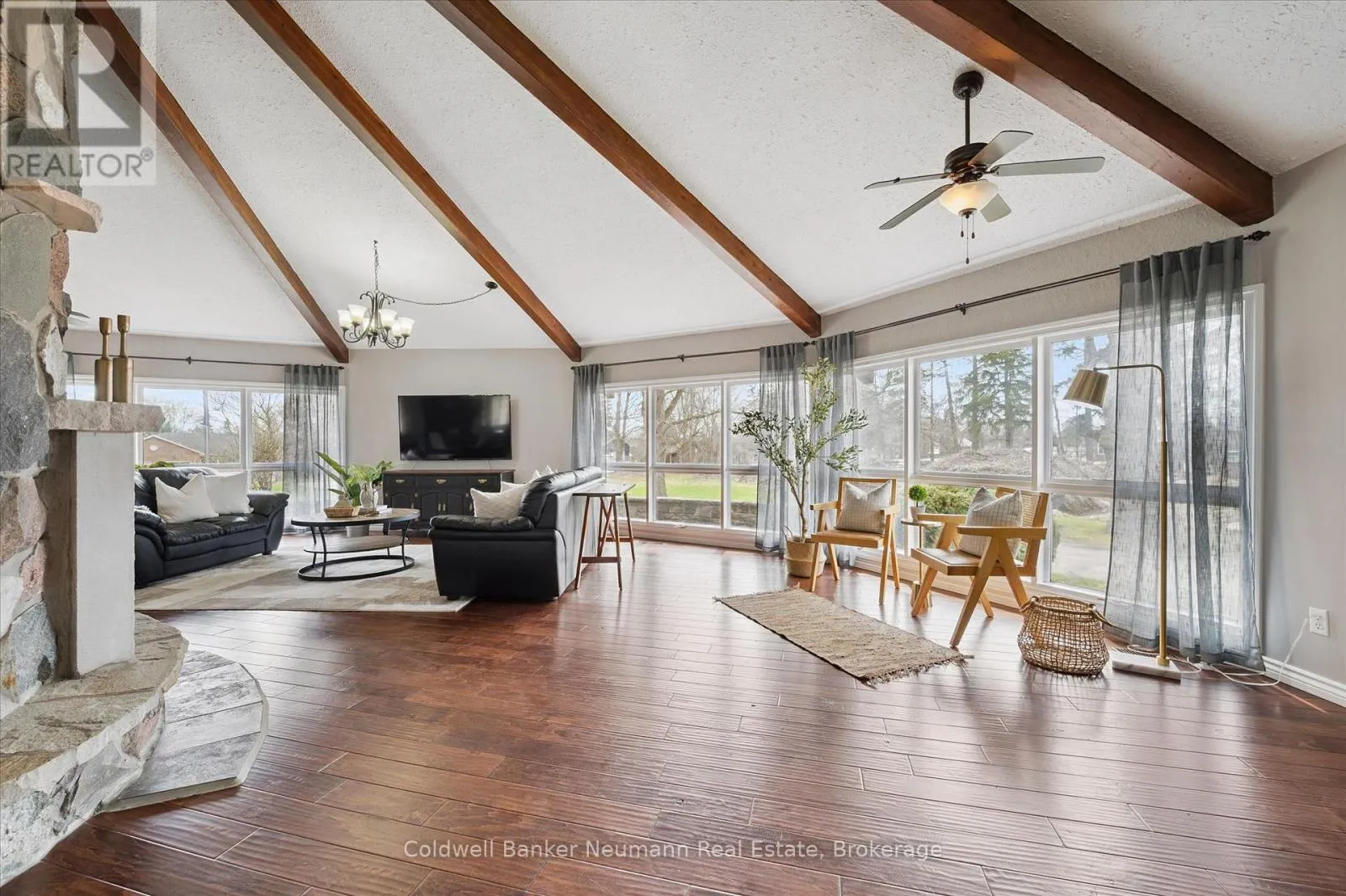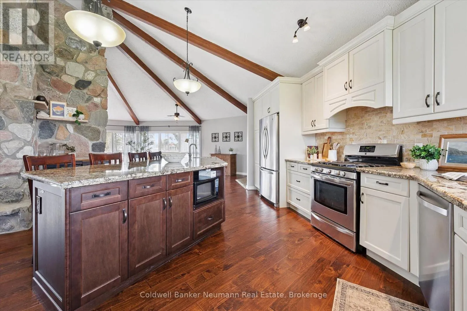 Cross Streets: Brock Rd. S. & Old Brock Rd. ** Directions: Brock Rd. Old Brock Rd. Mill Pond Views. Ski Chalet Soul. Two Acres in Aberfoyle - Some homes have a feeling the moment you walk in. This one - with over 4300 finished square feet - has it. At the centre of the main living space, a striking floor-to-ceiling cylindrical fireplace anchors soaring vaulted ceilings with exposed beams - a space that feels just as right on a snowy February night as it does on a summer evening with the doors open. From the kitchen patio or the primary bedroom's private deck, the view is the same: Mill Pond, calm and uninterrupted. This is your everyday backdrop. With five bedrooms, four bathrooms, and a fully finished basement, there's room to truly live - whether hosting, working from home, or simply spreading out the way a two-acre property allows. The primary suite features a soaker tub and separate shower, while the lower level adds two more bedrooms, a full bath with a soaker tub and separate shower, and a spacious rec room with ample storage. Outside, the detached garage and shop deliver real utility - space for vehicles, equipment, and a proper workshop - with a loft above ready to be a studio, retreat, or additional storage. Enjoy peace of mind with updated big ticket items: furnace 2020, AC 2021, new well 2021, new septic 2021, tankless water heater 2021. Set near the end of a quiet dead-end street, you're moments from top-rated schools, South Guelph amenities, and quick access to the 401. Country living, without compromise. (id:27476)
