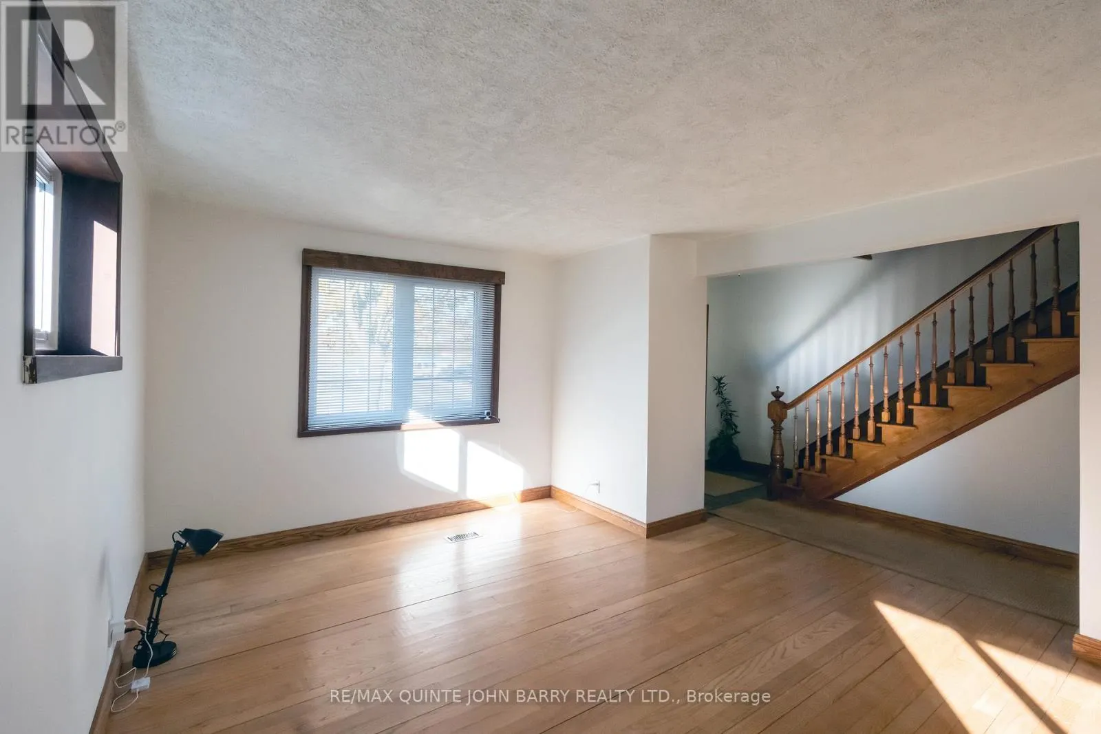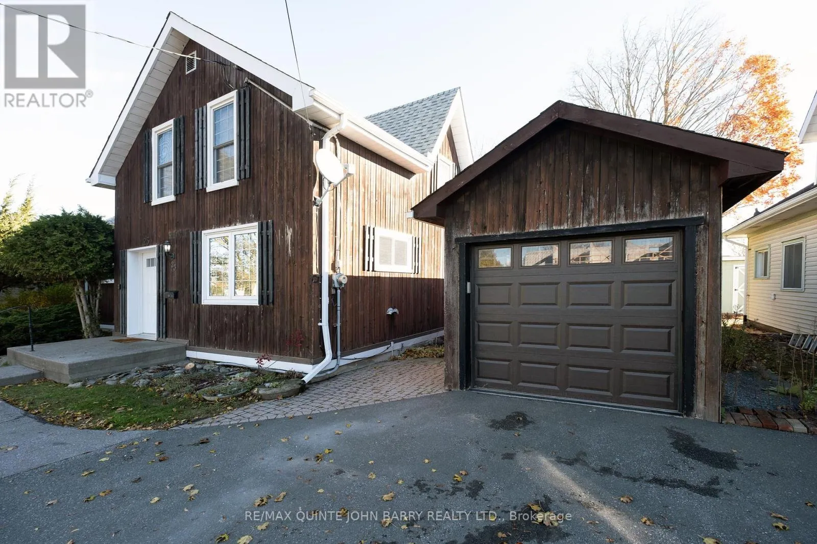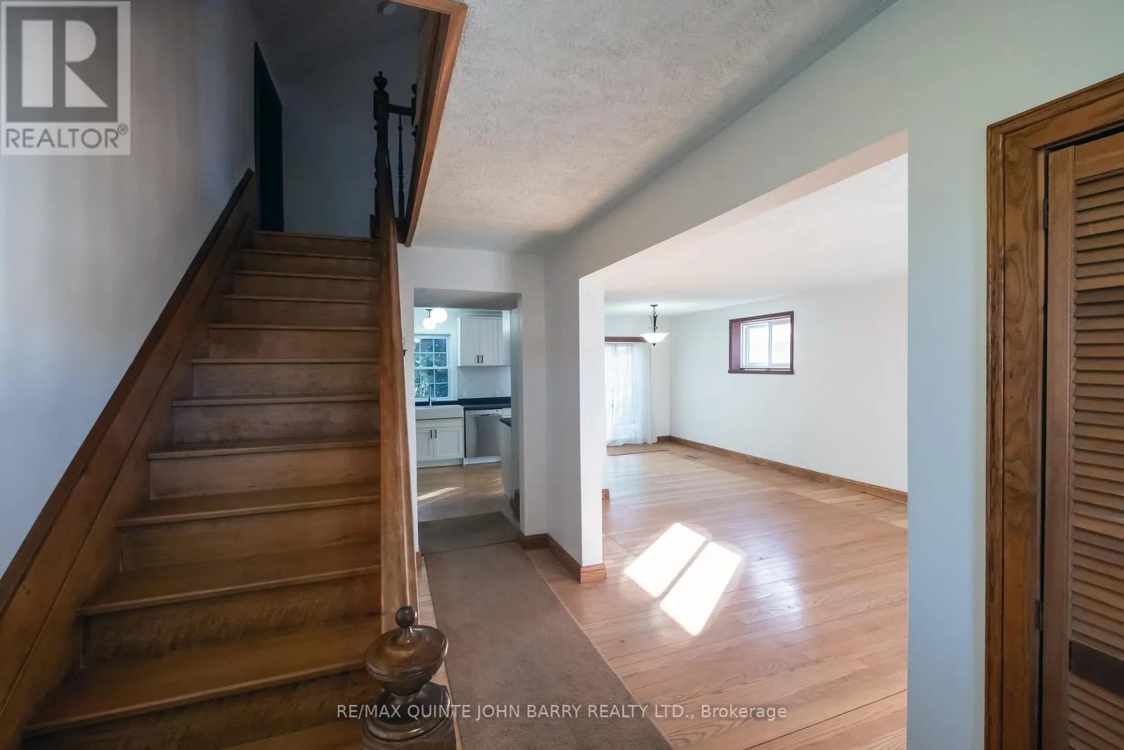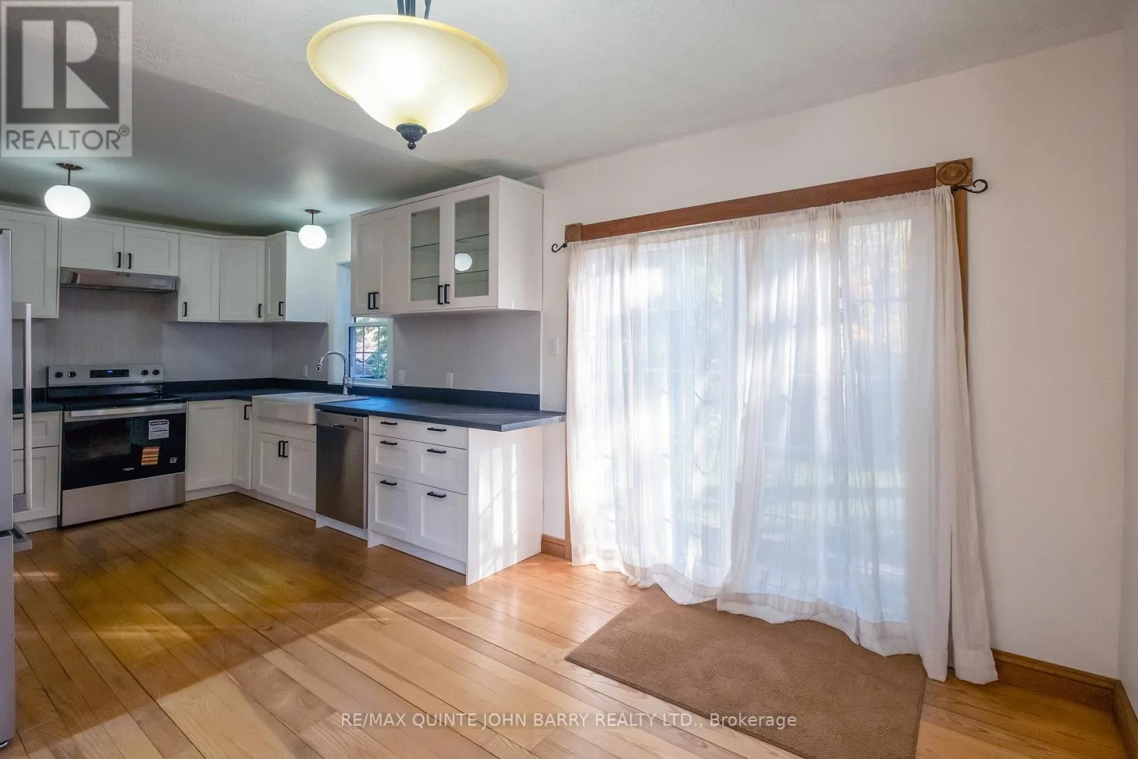 Cross Streets: DUNDAS ST EAST. ** Directions: DUNDAS ST EAST TO SOUTH STREET. Welcome to this beautifully updated 2-storey home in the heart of Quinte West! This spacious property offers 4+1 bedrooms and two 3-piece bathrooms-perfect for growing families. The bright, open-concept layout features hardwood floors throughout the main living areas and a generous living room that flows seamlessly into the dining area and the newly renovated kitchen, complete with modern finishes and plenty of workspace. A solid cherry staircase leads to three spacious bedrooms, including a primary with built-in shelving for added storage and style. The fourth smaller upstairs bedroom is well suited for a nursery or office. The main floor includes a fifth bedroom, laundry for everyday convenience while the bonus room provides extra space for relaxing or hosting guests. The updated bathrooms and freshly painted interior give the home a crisp, move-in-ready feel. Outside, enjoy a private lot with a circular driveway offering parking for up to six vehicles and a detached one-car garage. Centrally located and full of charm, this home blends comfort, functionality, and room to grow-all within minutes of local amenities, schools, churches, and parks. (id:27476)