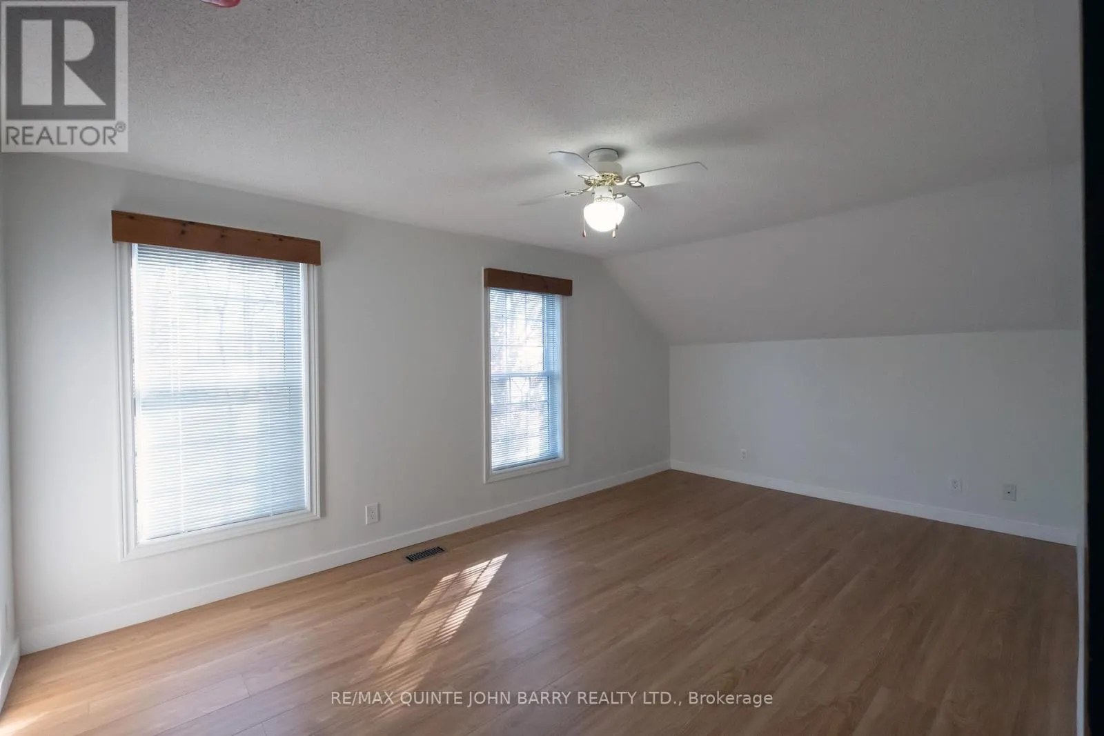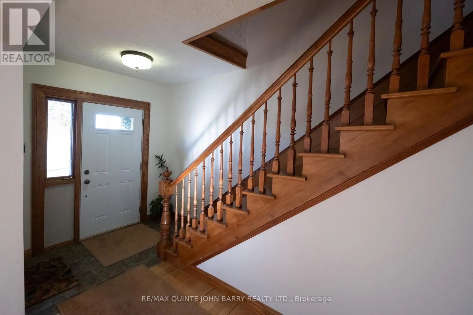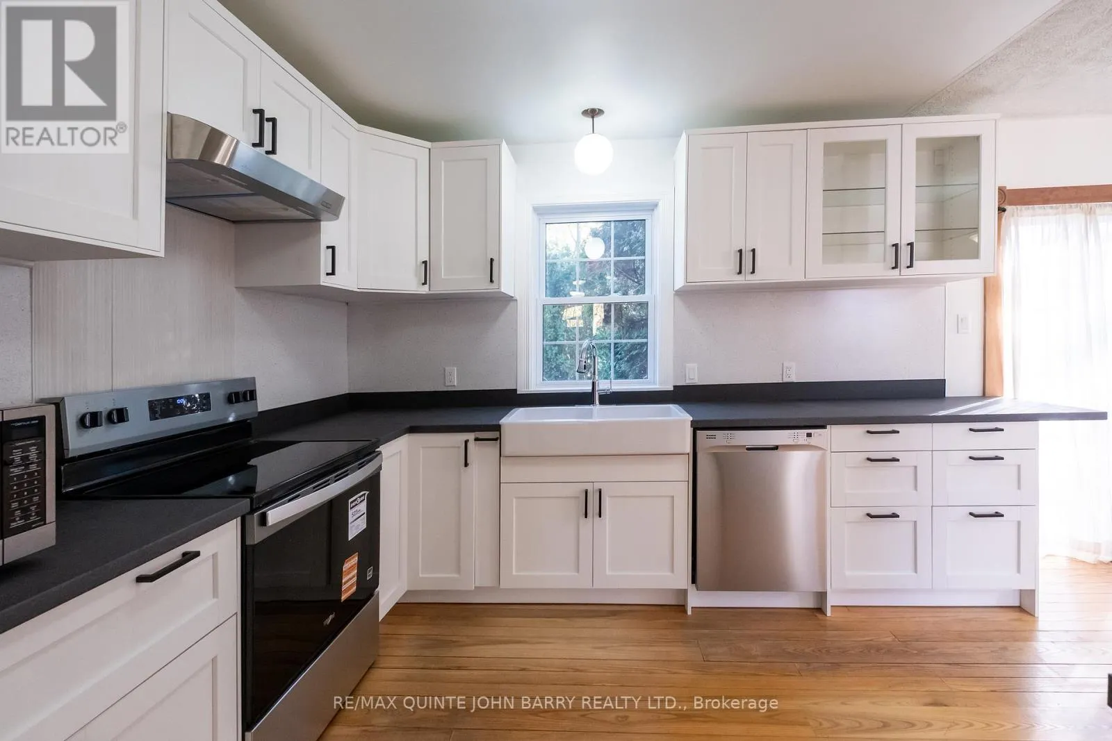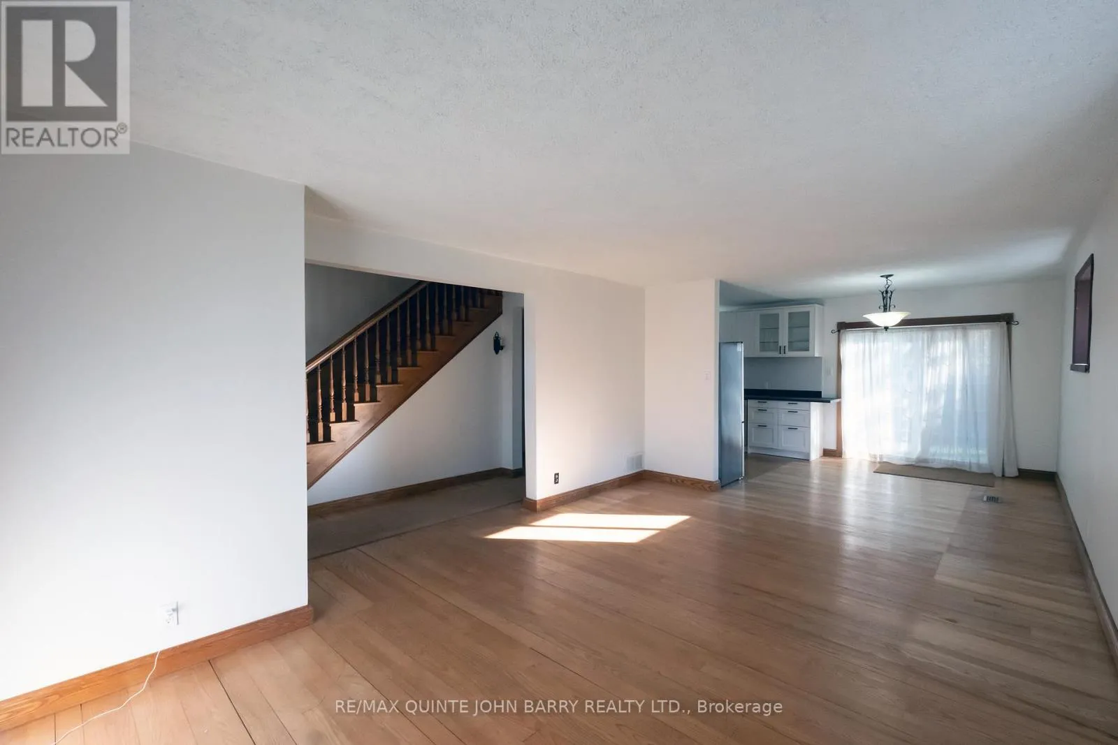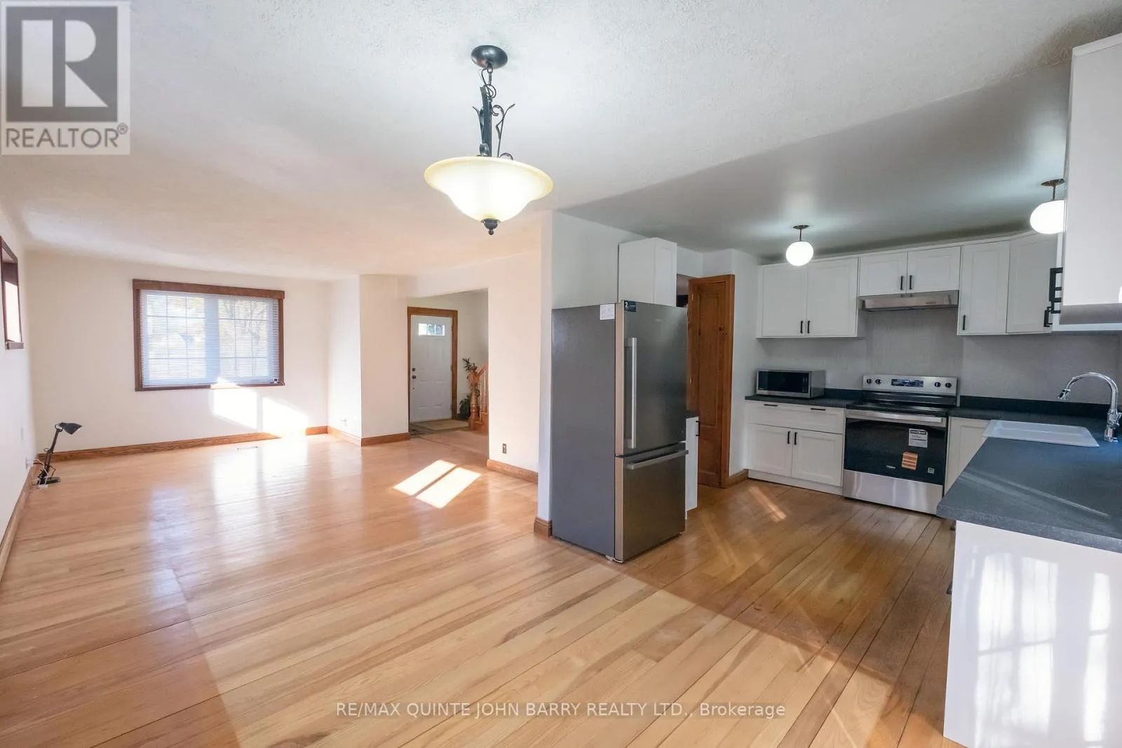 Cross Streets: DUNDAS ST EAST. ** Directions: DUNDAS ST EAST TO SOUTH STREET. Welcome to this beautifully updated 2-storey home in the heart of Quinte West! This spacious property offers 4+1 bedrooms and two 3-piece bathrooms-perfect for growing families. The bright, open-concept layout features hardwood floors throughout the main living areas and a generous living room that flows seamlessly into the dining area and the newly renovated kitchen, complete with modern finishes and plenty of workspace. A solid cherry staircase leads to three spacious bedrooms, including a primary with built-in shelving for added storage and style. The fourth smaller upstairs bedroom is well suited for a nursery or office. The main floor includes a fifth bedroom, laundry for everyday convenience while the bonus room provides extra space for relaxing or hosting guests. The updated bathrooms and freshly painted interior give the home a crisp, move-in-ready feel. Outside, enjoy a private lot with a circular driveway offering parking for up to six vehicles and a detached one-car garage. Centrally located and full of charm, this home blends comfort, functionality, and room to grow-all within minutes of local amenities, schools, churches, and parks. (id:27476)