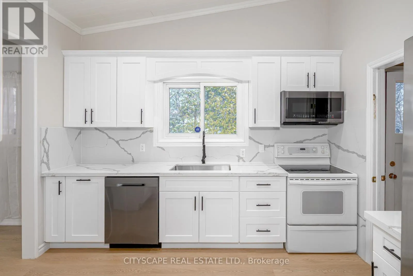 Hwy 2/ Orchardview / Edgeview Welcome to 32 Edgeview Drive, where timeless charm meets modern luxury. This beautifully updated brick side-split is a refined place to call home, thoughtfully redesigned with today's buyer in mind. Step inside to discover a bright, open-concept living space featuring high ceilings, custom wainscoting, and pot lights throughout, all complemented by fresh designer paint and new vinyl luxury flooring that flows seamlessly through the home. The living and dining areas are perfect for both everyday living and stylish entertaining. At the heart of the home is a brand-new custom chefs luxury kitchen, showcasing bespoke cabinetry, a custom quartz backsplash, premium quartz countertops, and a stainless steel refrigerator-a true showpiece for any home chef. This home offers three well-appointed bedrooms and a fully fenced backyard, ideal for families, pets, or outdoor entertaining. The lower-level rec room, complete with a cozy gas fireplace, provides the perfect retreat for movie nights, entertaining guests, or relaxing during cold winter evenings. A separate entrance to the basement adds incredible versatility, offering the potential to create an in-law suite or a one-bedroom income suite. Situated in a highly desirable neighborhood, this home is just minutes from downtown, shopping, parks, and schools, combining convenience with community charm. (id:27476)