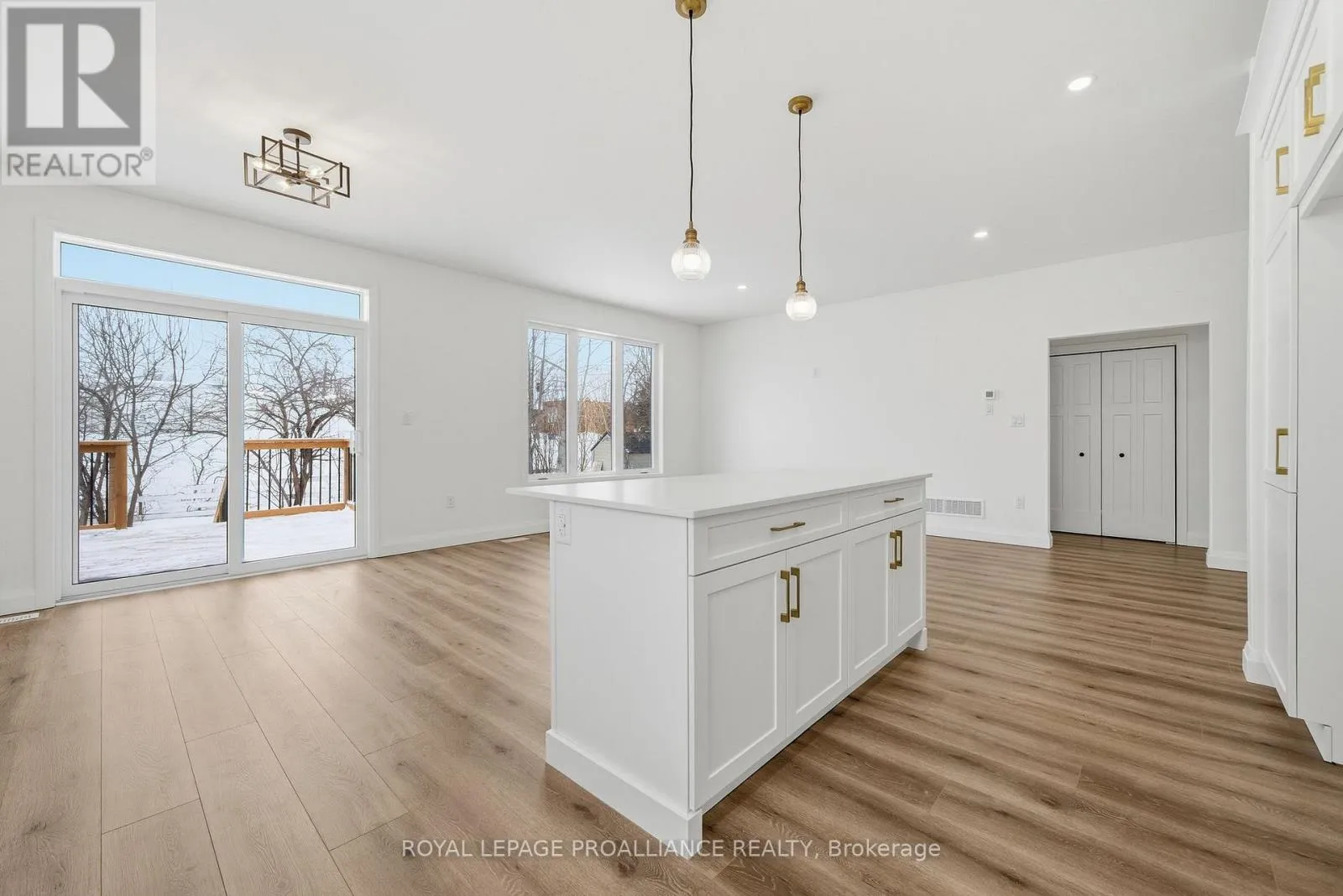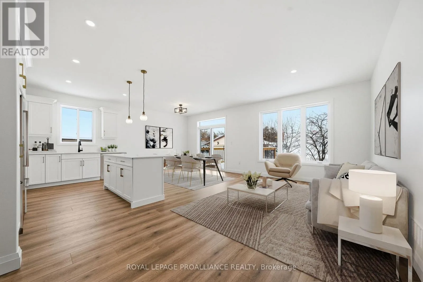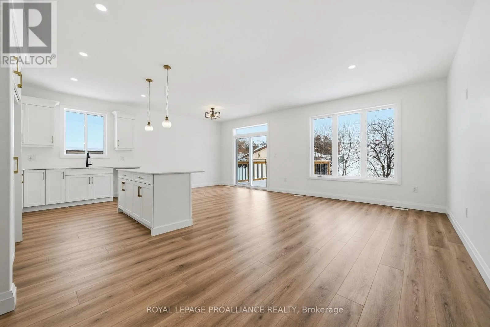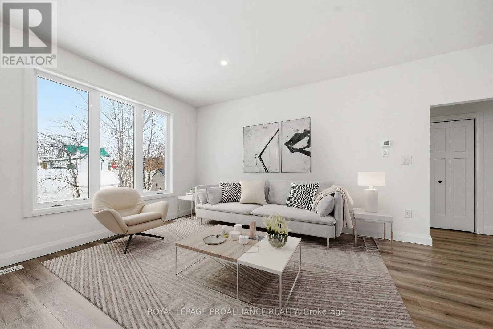 Cross Streets: Flindall & Bay. ** Directions: Flindall St to Bay St. Situated in the heart of Trenton within great walking distance to restaurants, shopping & Centennial Park offering children's play structure, baseball & soccer fields, open green space to roam & paved waterfront walking trails along the beautiful Bay of Quinte. FarDun Group presents this tastefully finished brand new home with Tarion Warranty, available for immediate occupancy if desired. Convenient double drive to the front covered porch into the spacious foyer with 15 ft ceiling or enter via the attached 261 sq ft garage. Oak staircase & railing invites you to this bright open plan. Timeless finishing selections here with 9 ft ceilings & neutral durable laminate flooring throughout. Classic shaker style kitchen cabinets in natural white with popular dekton countertops, deep granite undermount sink & detached entertaining island overlooking the sun filled dining & pot lit living area through the double sliding doors with transom feature & triple elongated windows. The large primary bedroom is positioned to the rear with generously sized walk-in closet. This main level also provides a second bedroom, full bath & large linen closet. Additional square feet available in the full unspoiled basement with bathroom rough in & three large windows allowing flexibility for your future layout. Need a finished basement now? The builder is open to discussing! Bonus, this beauty comes with a 12x12 deck & stairs to the already established yard. 152 Bay Street combines the perfect blend of easy new build living & modern design. You're invited to view the many perks this home has to offer at the OPEN HOUSE, Saturday February 14th 12-1:30pm. (id:27476)