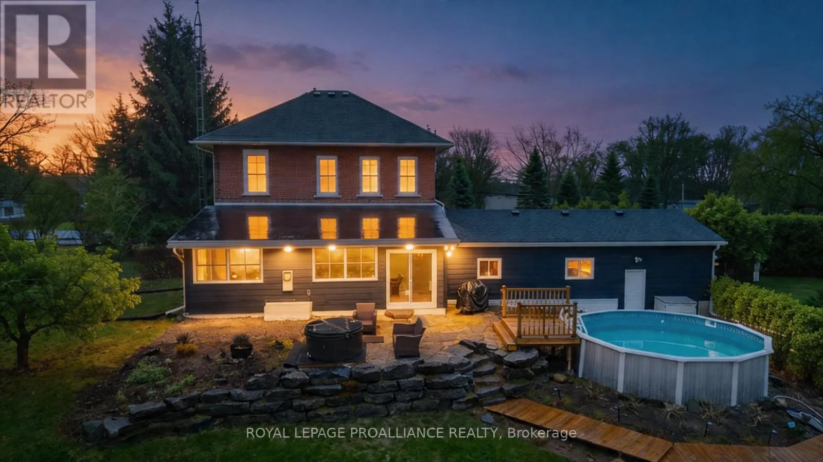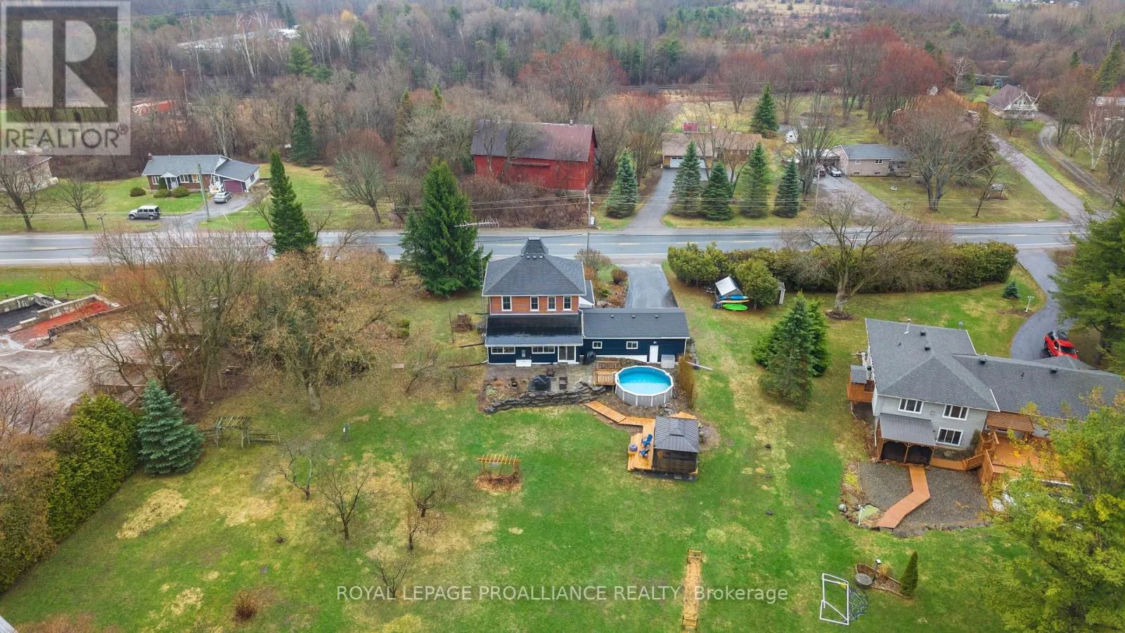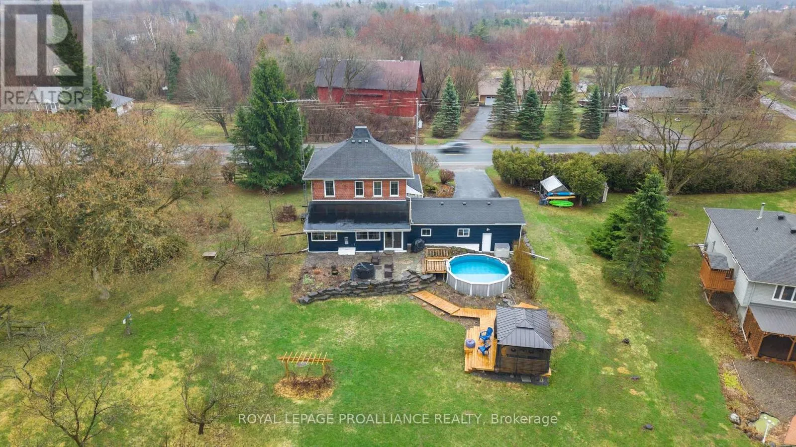 Cross Streets: Stoney Point Road. ** Directions: Follow County Rd 2 E out of Brighton. If you've been searching for a lovingly maintained century home filled with character, charm, and space, this is the one. From the moment you arrive, you're welcomed by beautifully landscaped gardens leading to a picturesque covered porch, an inviting introduction to what awaits inside. Step through the front door and experience timeless details that have been thoughtfully preserved. The main floor offers a spacious living room and dining room, both positioned at the front of the home, showcasing its natural character and warmth. This level also features a well-appointed kitchen, convenient 2-piece bath, and a main floor bedroom. At the rear of the home, you'll fall in love with the stunning family room, complete with an abundance of windows, a cozy fireplace, and custom shelving, an ideal space to relax and unwind. Step outside to your own private retreat. Set on approximately 3 acres, the backyard is truly a dream, featuring a large deck, above-ground pool, gazebo area, tranquil water feature, lush gardens, a vegetable garden, and even a charming barn currently home to two pigs. A peaceful stream meanders through the property, adding to the serene, country-like setting. Upstairs, you'll find three generously sized bedrooms and a full 3-piece bathroom, providing plenty of space for the whole family. The basement offers a laundry area and a unique touch with a one-of-a-kind bathroom featuring natural exterior stone incorporated into the walls, providing an unforgettable design element. This property is a rare blend of historic charm, modern comfort, and outdoor beauty-ready to welcome its next proud owner. (id:27476)
