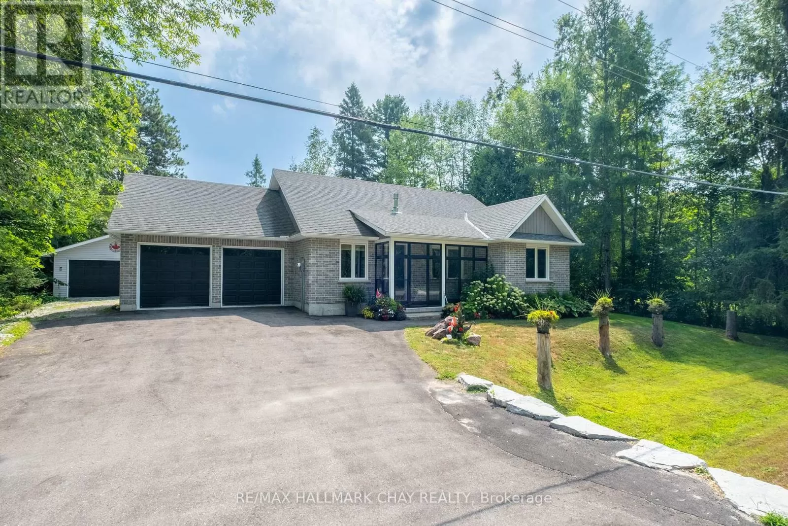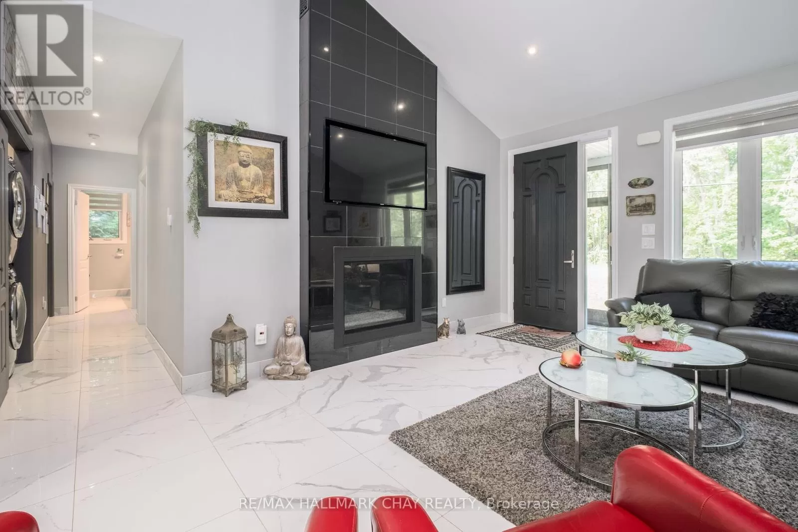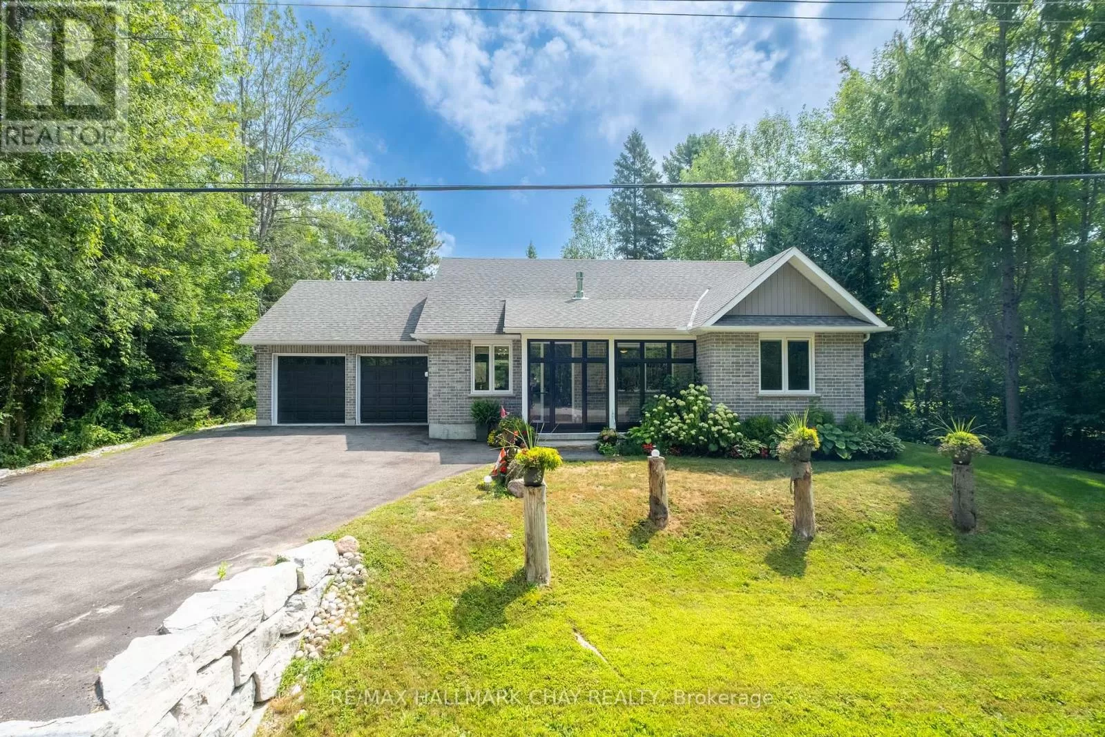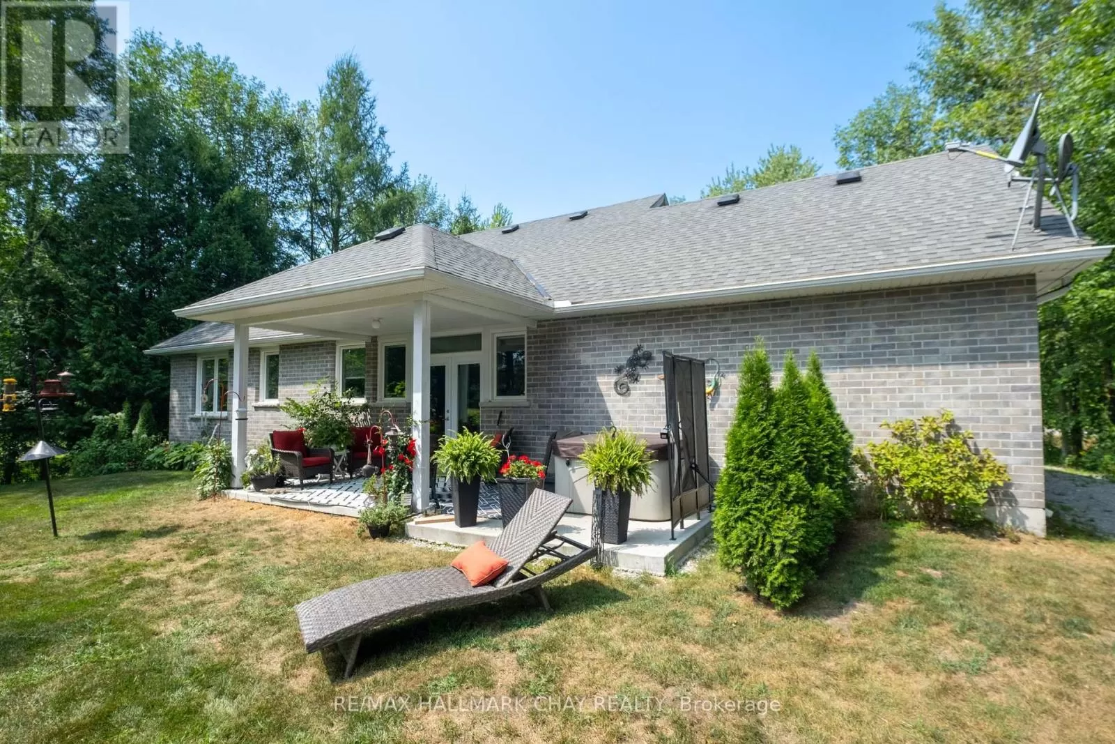 Cross Streets: 169/Switch Road. ** Directions: 169 to Switch Road and Davy Drive. Located on the serene Black River in Ramara Township, this beautiful brick bungalow, built in 2018, offers the perfect blend of comfort, style, and waterfront living. Step into the spacious, screened-in front porch a welcoming space to enjoy the peaceful surroundings. Inside, the open-concept layout features vaulted ceilings and a bright, airy living space that includes a large living room with a double-sided gas fireplace, a dining area, and a modern kitchen with quartz countertops, stainless steel appliances, and an induction stove.The kitchen and dining room feature expansive windows and a French door walkout to a covered patio with scenic river views ideal for entertaining or relaxing outdoors.The waterside primary suite includes a walk-in closet and a 4-piece ensuite. Two additional bedrooms offer comfortable accommodations, with one enjoying the warmth of the shared double-sided fireplace. Heated large-format ceramic tile flooring runs throughout, providing cozy year-round comfort. A 3-piece main bathroom features a spacious walk-in shower. Unwind in the private outdoor hot tub after a day on the river. This property also includes a two-car attached garage with inside entry, plus a newer, oversized detached garage perfect for a workshop, storing another vehicle, or housing all your recreational toys. Enjoy direct river access for canoeing, kayaking, paddle boating, or boating from your own backyard. All this just minutes from Casino Rama, Washago, and Orillia. (id:27476)