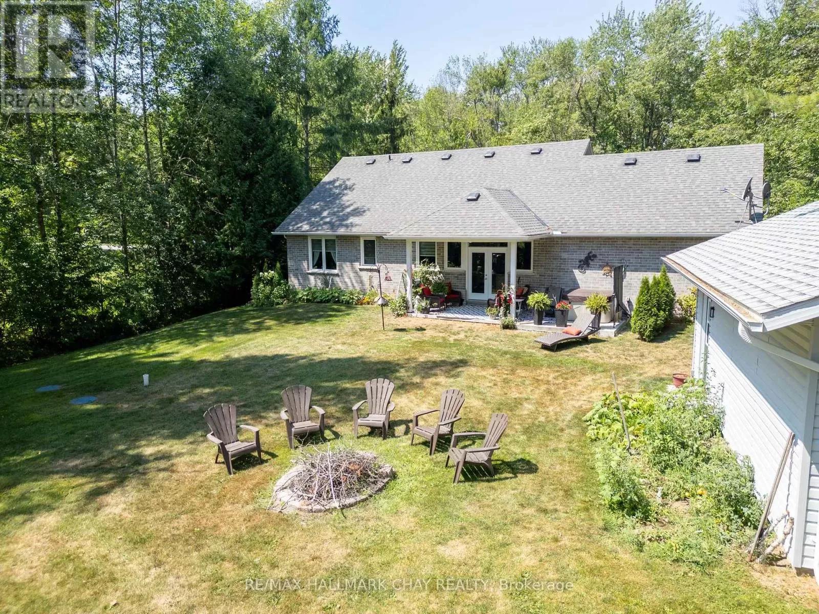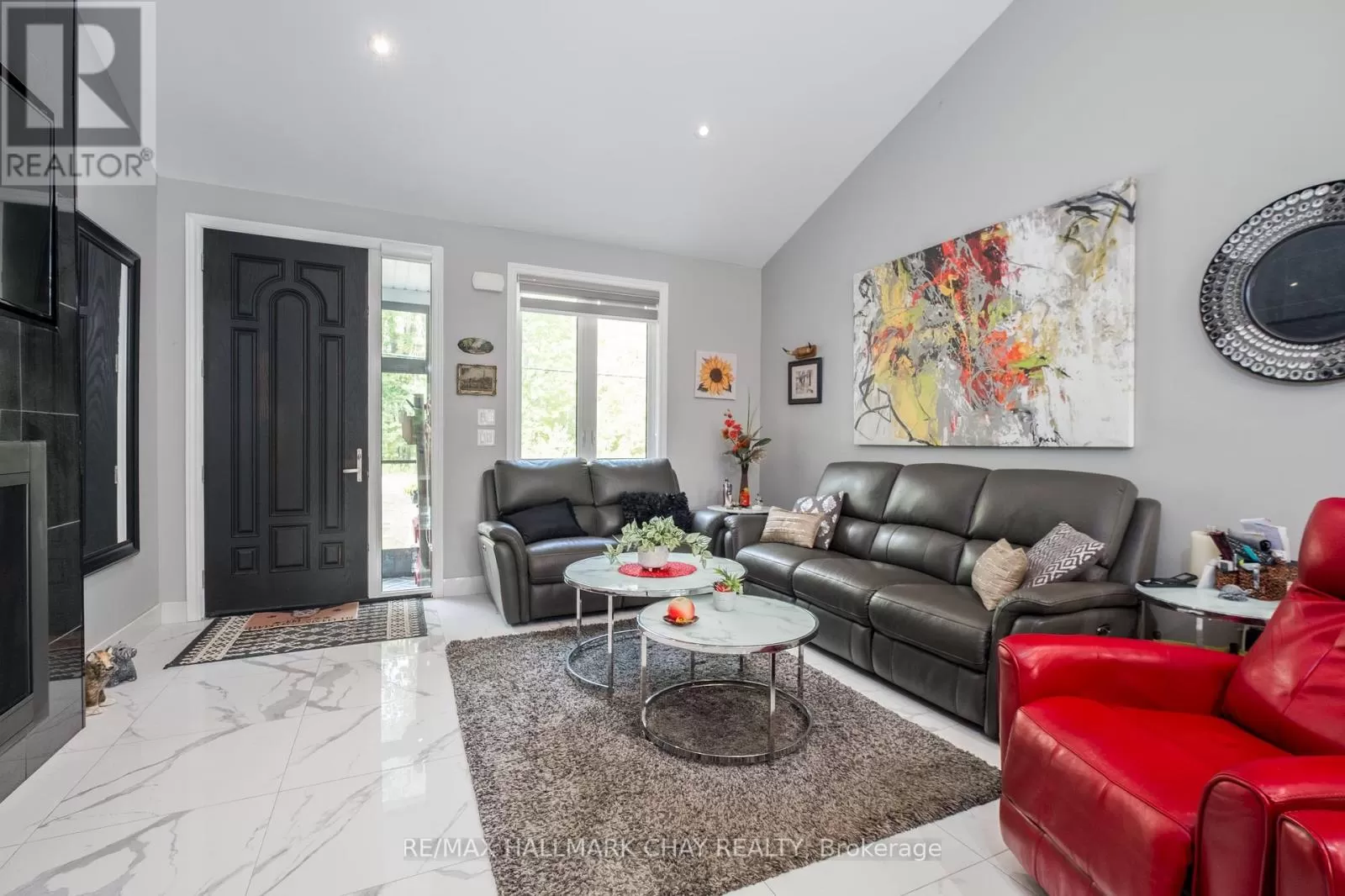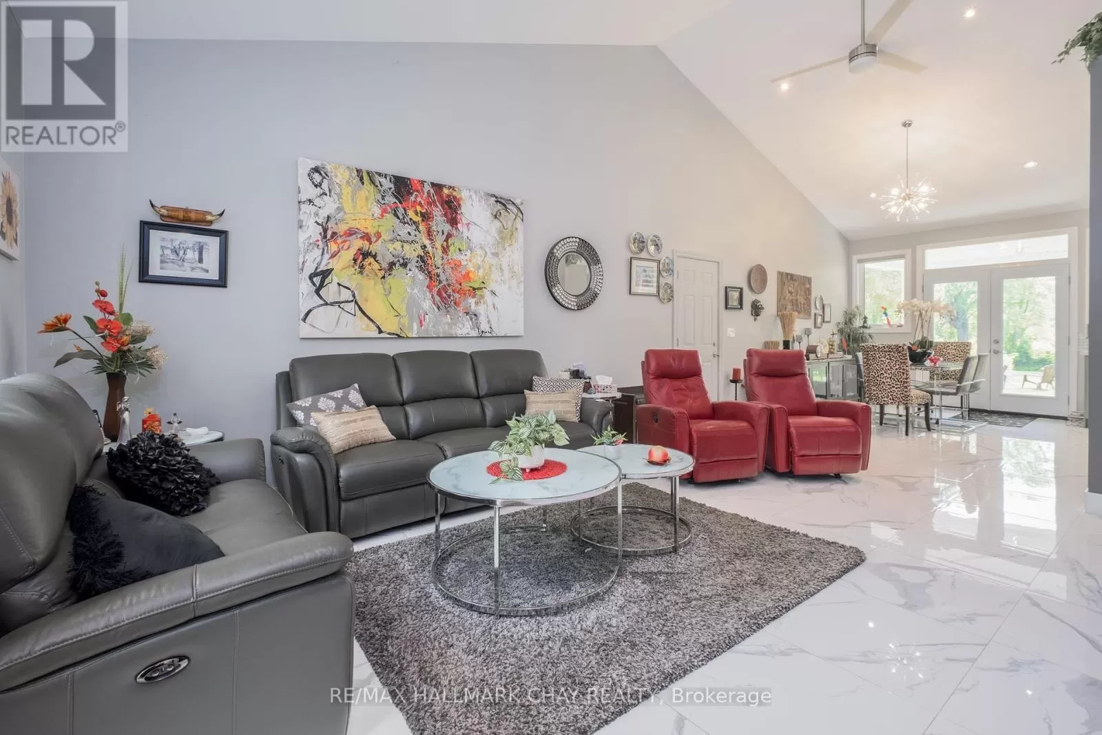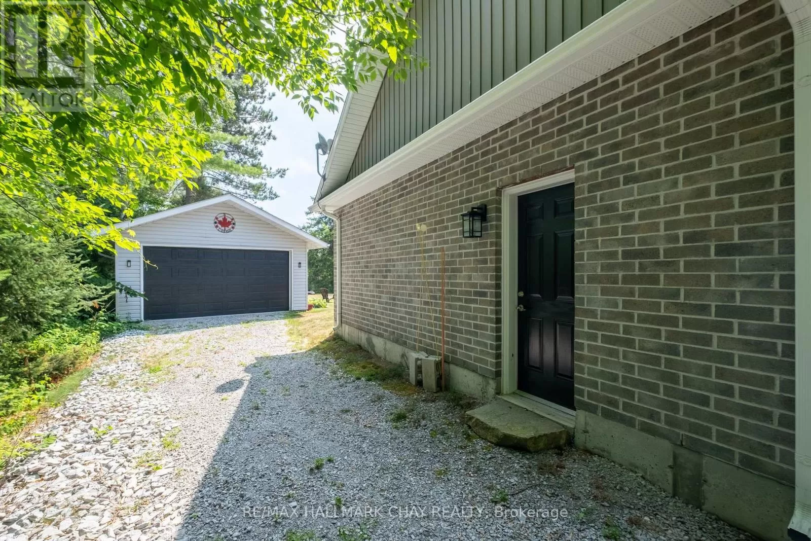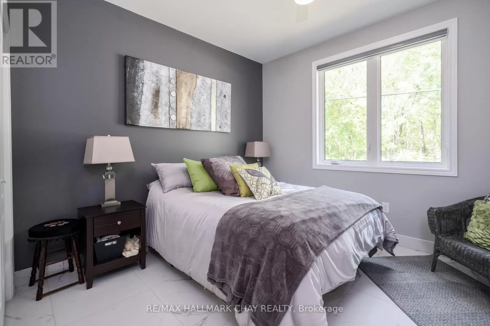 Cross Streets: 169/Switch Road. ** Directions: 169 to Switch Road and Davy Drive. Located on the serene Black River in Ramara Township, this beautiful brick bungalow, built in 2018, offers the perfect blend of comfort, style, and waterfront living. Step into the spacious, screened-in front porch a welcoming space to enjoy the peaceful surroundings. Inside, the open-concept layout features vaulted ceilings and a bright, airy living space that includes a large living room with a double-sided gas fireplace, a dining area, and a modern kitchen with quartz countertops, stainless steel appliances, and an induction stove.The kitchen and dining room feature expansive windows and a French door walkout to a covered patio with scenic river views ideal for entertaining or relaxing outdoors.The waterside primary suite includes a walk-in closet and a 4-piece ensuite. Two additional bedrooms offer comfortable accommodations, with one enjoying the warmth of the shared double-sided fireplace. Heated large-format ceramic tile flooring runs throughout, providing cozy year-round comfort. A 3-piece main bathroom features a spacious walk-in shower. Unwind in the private outdoor hot tub after a day on the river. This property also includes a two-car attached garage with inside entry, plus a newer, oversized detached garage perfect for a workshop, storing another vehicle, or housing all your recreational toys. Enjoy direct river access for canoeing, kayaking, paddle boating, or boating from your own backyard. All this just minutes from Casino Rama, Washago, and Orillia. (id:27476)