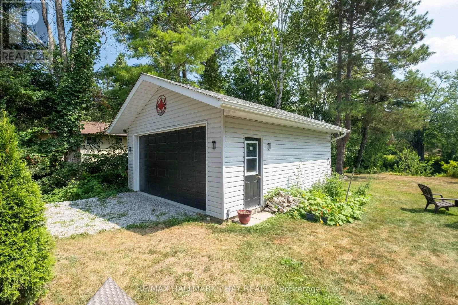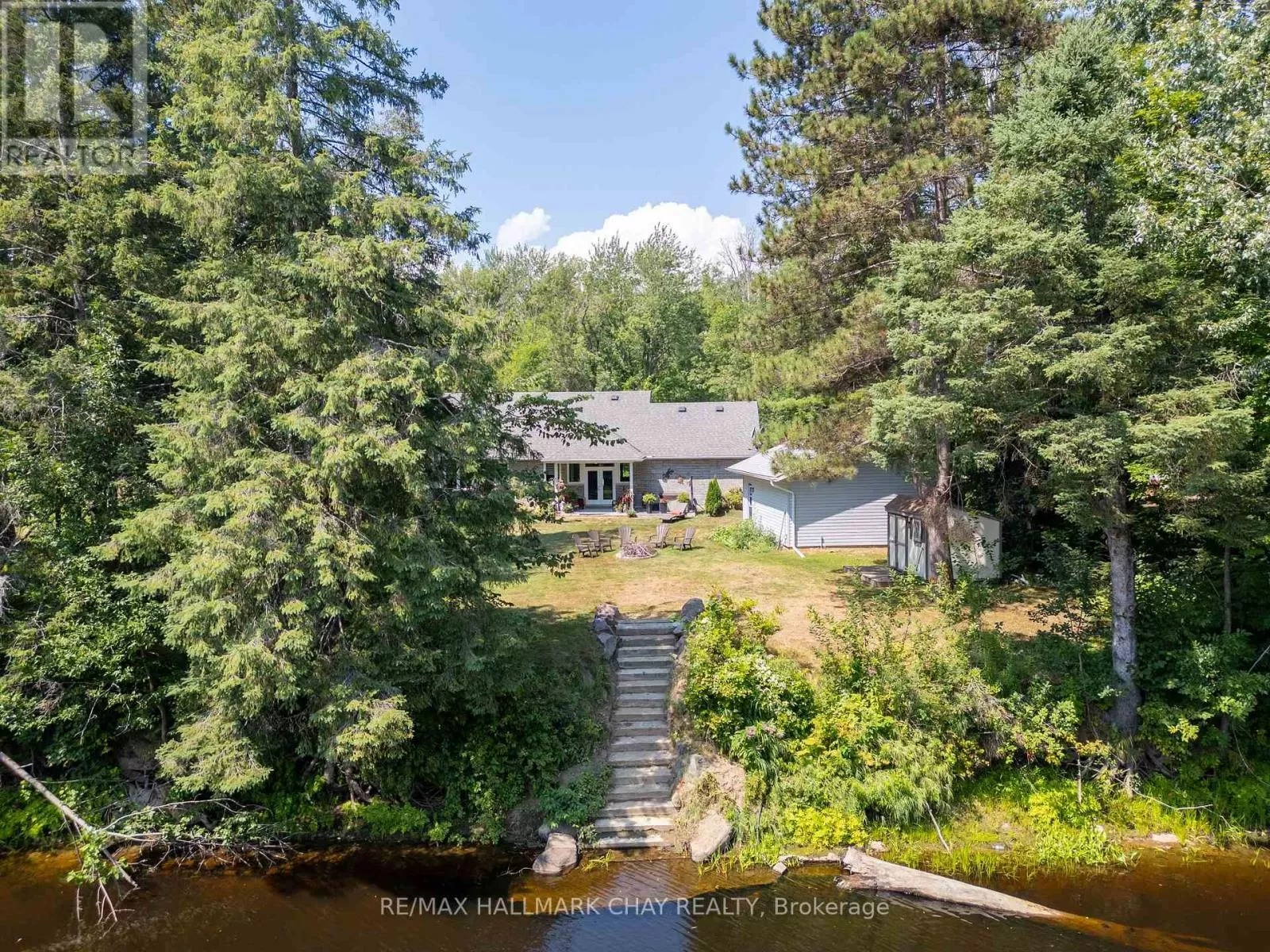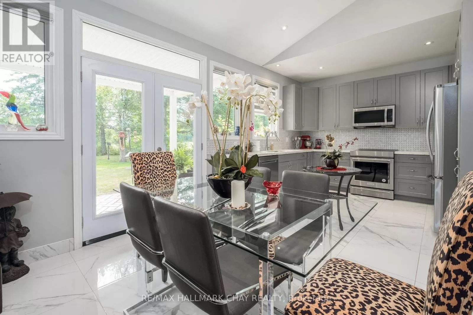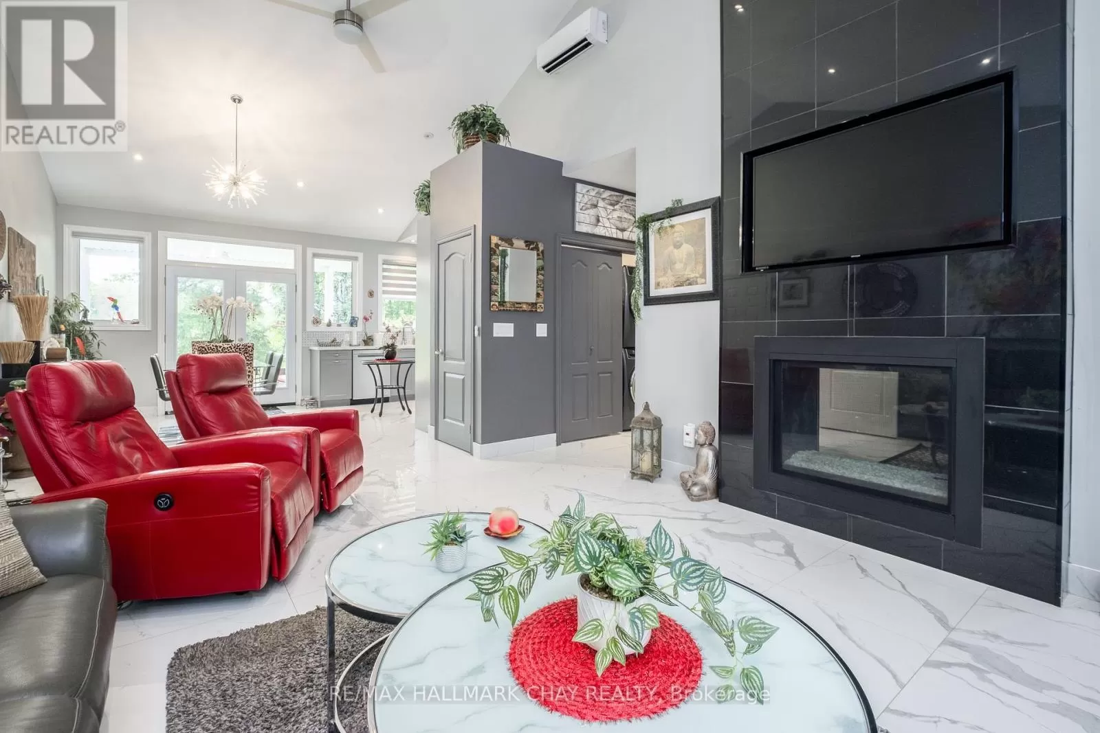 Cross Streets: 169/Switch Road. ** Directions: 169 to Switch Road and Davy Drive. Located on the serene Black River in Ramara Township, this beautiful brick bungalow, built in 2018, offers the perfect blend of comfort, style, and waterfront living. Step into the spacious, screened-in front porch a welcoming space to enjoy the peaceful surroundings. Inside, the open-concept layout features vaulted ceilings and a bright, airy living space that includes a large living room with a double-sided gas fireplace, a dining area, and a modern kitchen with quartz countertops, stainless steel appliances, and an induction stove.The kitchen and dining room feature expansive windows and a French door walkout to a covered patio with scenic river views ideal for entertaining or relaxing outdoors.The waterside primary suite includes a walk-in closet and a 4-piece ensuite. Two additional bedrooms offer comfortable accommodations, with one enjoying the warmth of the shared double-sided fireplace. Heated large-format ceramic tile flooring runs throughout, providing cozy year-round comfort. A 3-piece main bathroom features a spacious walk-in shower. Unwind in the private outdoor hot tub after a day on the river. This property also includes a two-car attached garage with inside entry, plus a newer, oversized detached garage perfect for a workshop, storing another vehicle, or housing all your recreational toys. Enjoy direct river access for canoeing, kayaking, paddle boating, or boating from your own backyard. All this just minutes from Casino Rama, Washago, and Orillia. (id:27476)