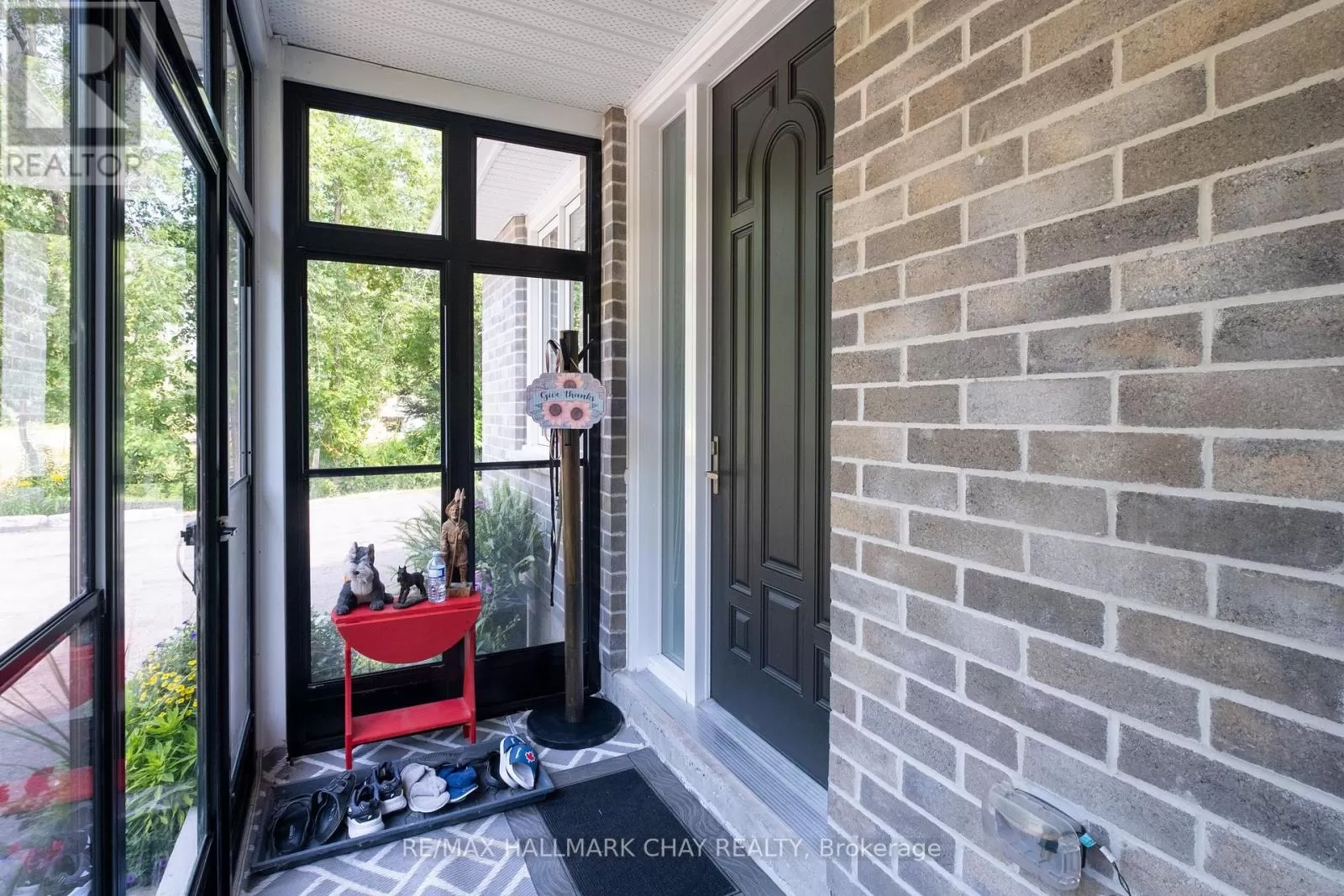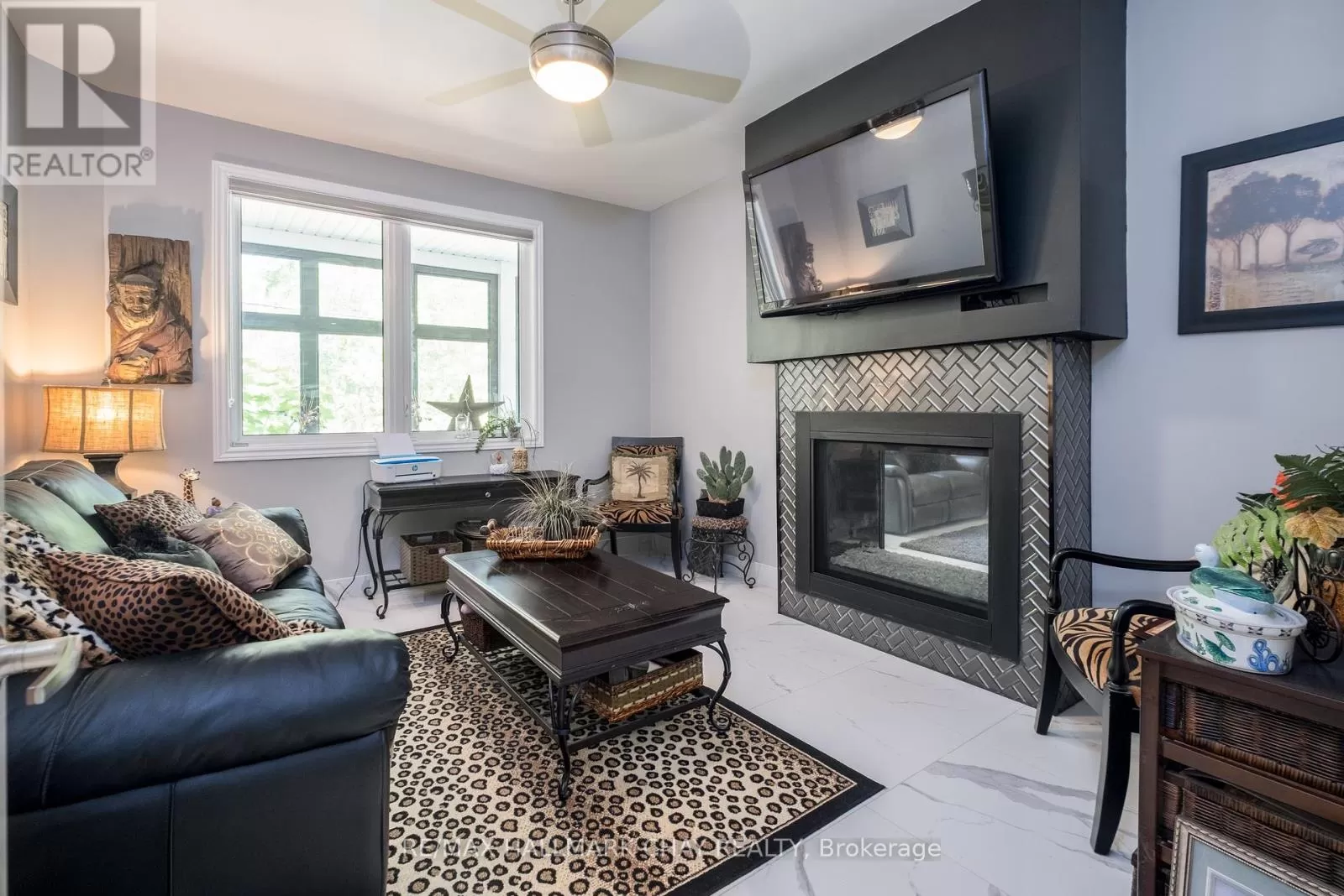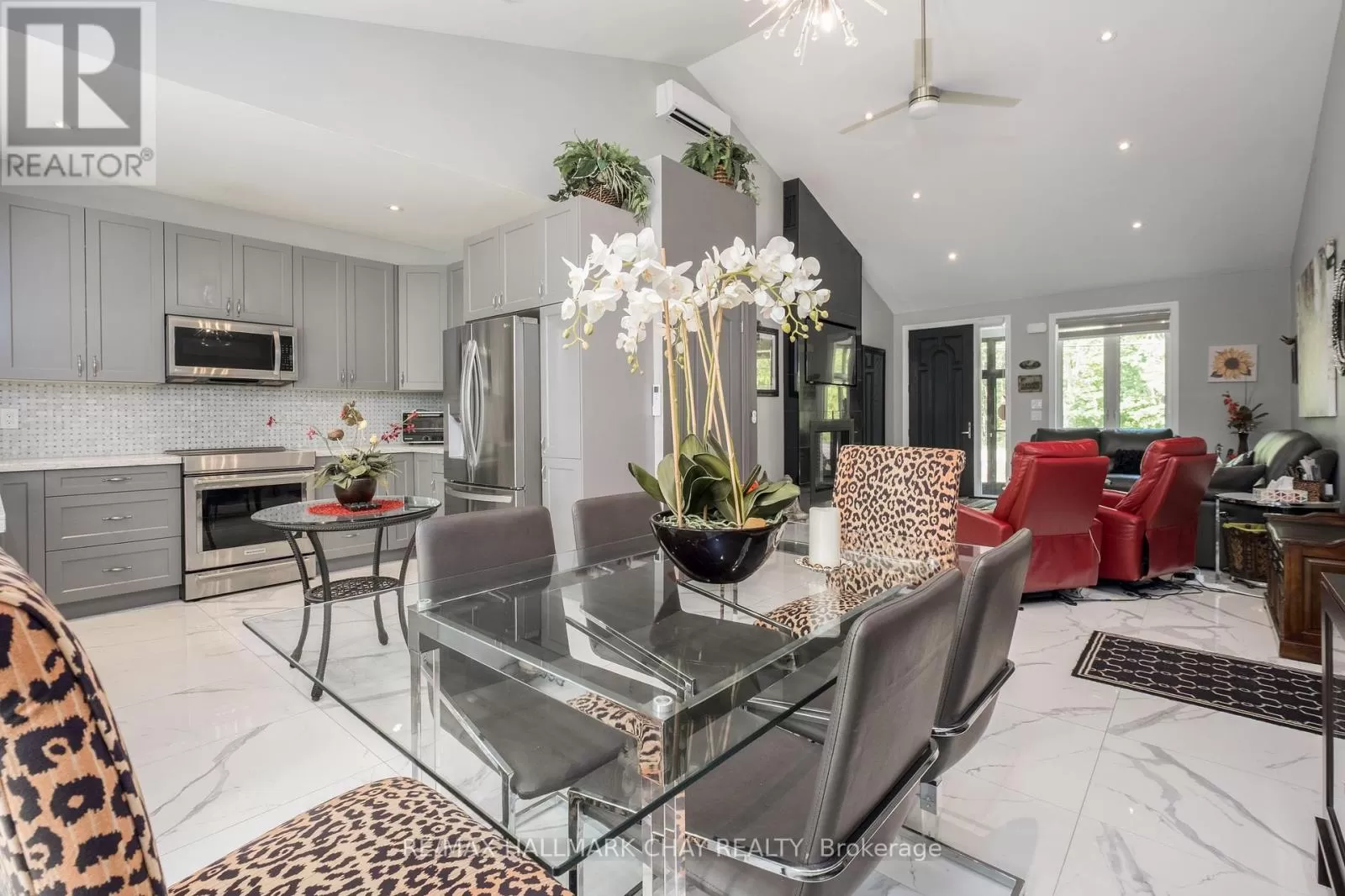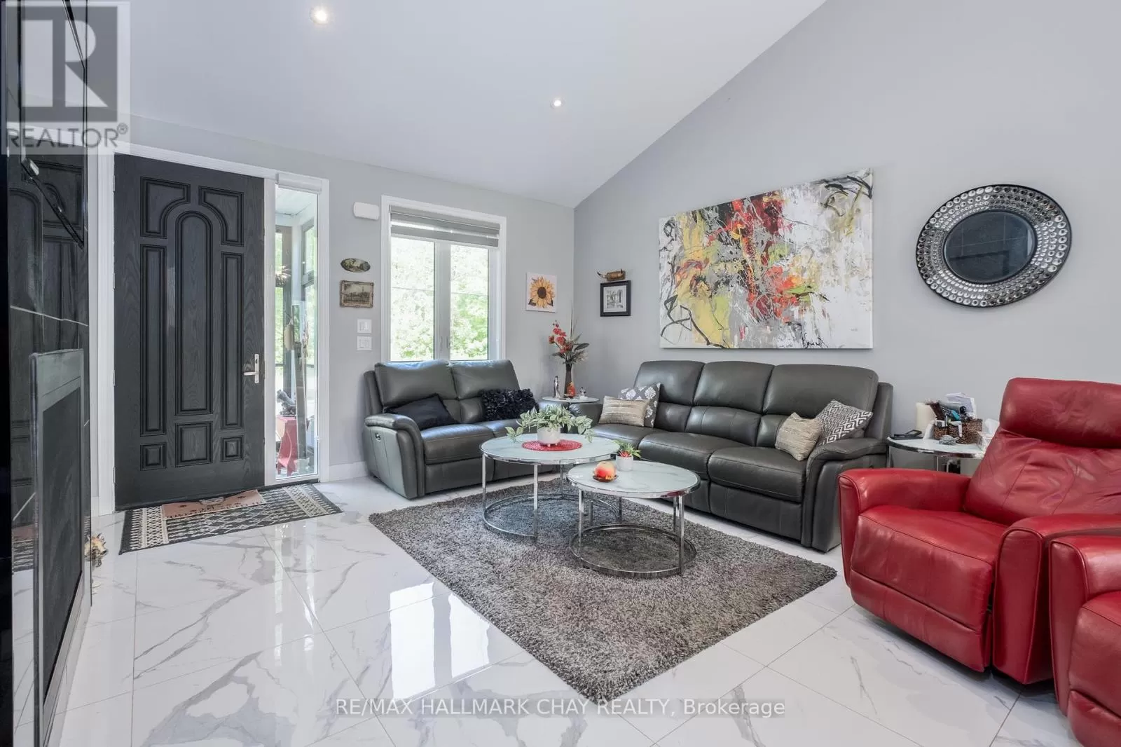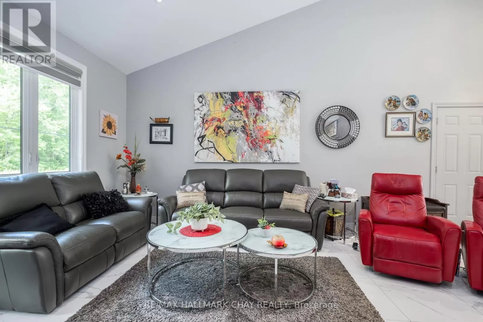 Cross Streets: 169/Switch Road. ** Directions: 169 to Switch Road and Davy Drive. Located on the serene Black River in Ramara Township, this beautiful brick bungalow, built in 2018, offers the perfect blend of comfort, style, and waterfront living. Step into the spacious, screened-in front porch a welcoming space to enjoy the peaceful surroundings. Inside, the open-concept layout features vaulted ceilings and a bright, airy living space that includes a large living room with a double-sided gas fireplace, a dining area, and a modern kitchen with quartz countertops, stainless steel appliances, and an induction stove.The kitchen and dining room feature expansive windows and a French door walkout to a covered patio with scenic river views ideal for entertaining or relaxing outdoors.The waterside primary suite includes a walk-in closet and a 4-piece ensuite. Two additional bedrooms offer comfortable accommodations, with one enjoying the warmth of the shared double-sided fireplace. Heated large-format ceramic tile flooring runs throughout, providing cozy year-round comfort. A 3-piece main bathroom features a spacious walk-in shower. Unwind in the private outdoor hot tub after a day on the river. This property also includes a two-car attached garage with inside entry, plus a newer, oversized detached garage perfect for a workshop, storing another vehicle, or housing all your recreational toys. Enjoy direct river access for canoeing, kayaking, paddle boating, or boating from your own backyard. All this just minutes from Casino Rama, Washago, and Orillia. (id:27476)