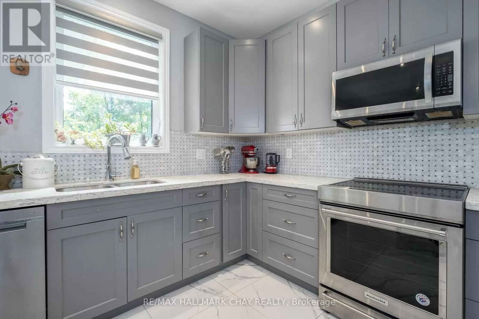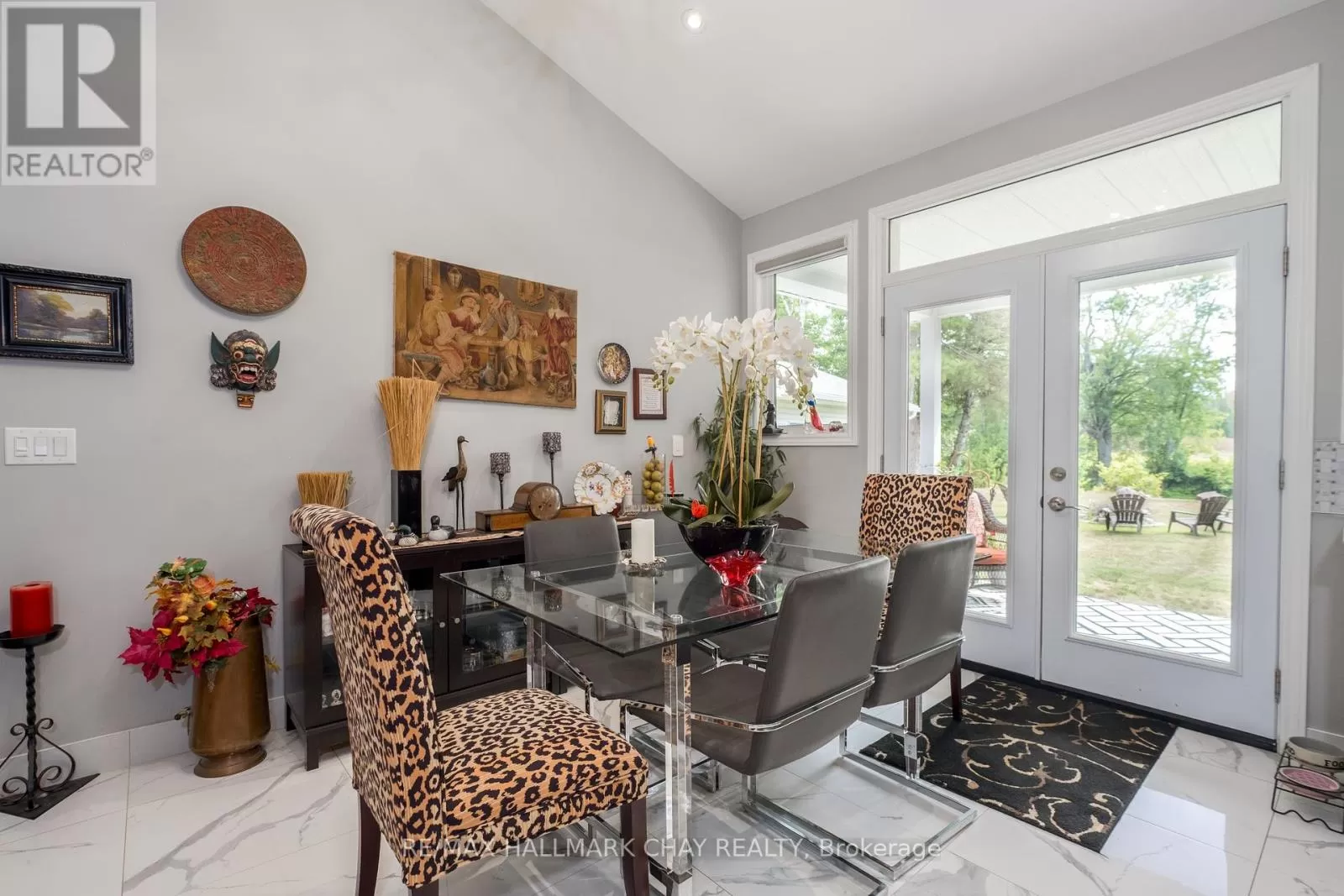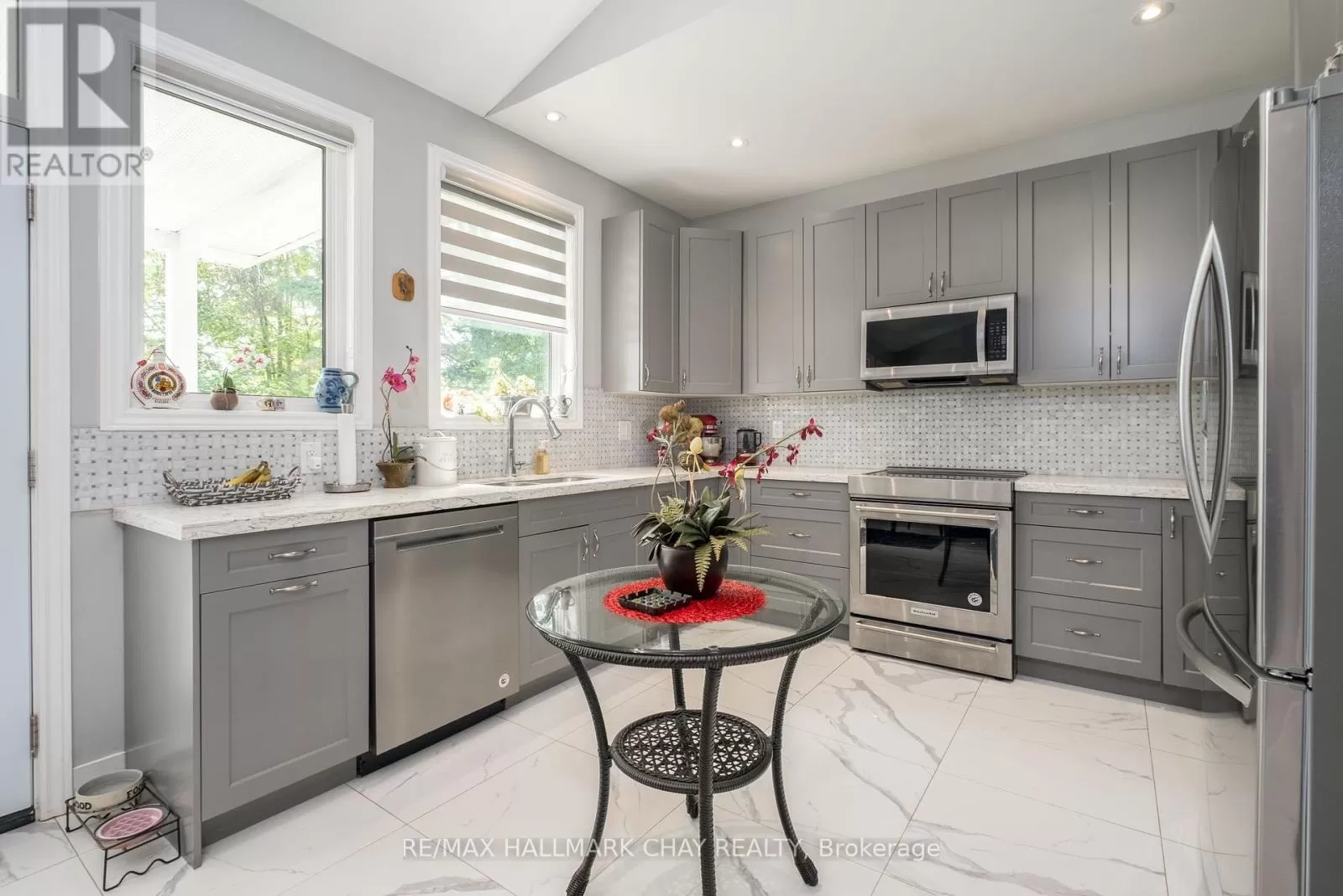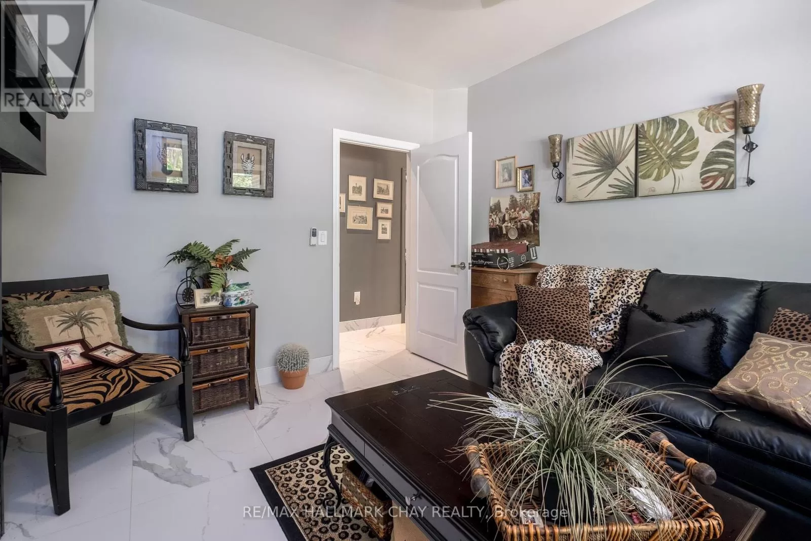 Cross Streets: 169/Switch Road. ** Directions: 169 to Switch Road and Davy Drive. Located on the serene Black River in Ramara Township, this beautiful brick bungalow, built in 2018, offers the perfect blend of comfort, style, and waterfront living. Step into the spacious, screened-in front porch a welcoming space to enjoy the peaceful surroundings. Inside, the open-concept layout features vaulted ceilings and a bright, airy living space that includes a large living room with a double-sided gas fireplace, a dining area, and a modern kitchen with quartz countertops, stainless steel appliances, and an induction stove.The kitchen and dining room feature expansive windows and a French door walkout to a covered patio with scenic river views ideal for entertaining or relaxing outdoors.The waterside primary suite includes a walk-in closet and a 4-piece ensuite. Two additional bedrooms offer comfortable accommodations, with one enjoying the warmth of the shared double-sided fireplace. Heated large-format ceramic tile flooring runs throughout, providing cozy year-round comfort. A 3-piece main bathroom features a spacious walk-in shower. Unwind in the private outdoor hot tub after a day on the river. This property also includes a two-car attached garage with inside entry, plus a newer, oversized detached garage perfect for a workshop, storing another vehicle, or housing all your recreational toys. Enjoy direct river access for canoeing, kayaking, paddle boating, or boating from your own backyard. All this just minutes from Casino Rama, Washago, and Orillia. (id:27476)
