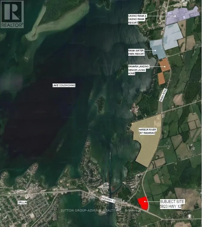 HWY 12 E TO RAMA RD. A future commercial development site as a sleek, modern hub with dynamic architecture and thoughtful landscaping. Presenting a rare and high-potential mixed-use development opportunity at 5823 Highway 12 in Ramara, Ontarioan expansive 13.156-acre parcel strategically located at the intersection of Highway 12 and Rama Road, minutes from Lake Simcoe, Casino Rama, and Orillia. The site benefits from excellent visibility and access, with future road upgrades anticipated and proximity to major regional corridors. Environmental studies indicate minimal constraints, with a small wetland buffer in the northwest corner and inclusion in the Lake Simcoe Protection Plan area. Planning work is underway, including traffic impact, stormwater management, and market analysis. With pre-consultation completed and municipal support for intensification, the site is primed for a transformative project featuring approximately 469,366 sq ft of gross floor area. One of the proposed concepts includes 58 townhome units across nine blocks, a 105-unit, seven-storey seniors residence, two single-storey commercial buildings with 10 retail units and a drive-through, and a six-storey hotel with 126 rooms. Zoned Village Residential (VR), the property permits multi-unit dwellings, care facilities, and accessory commercial uses, with septic and well systems currently allowed and municipal servicing under review. . (id:27476)