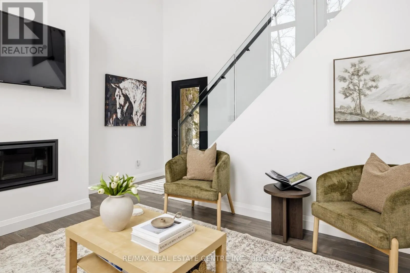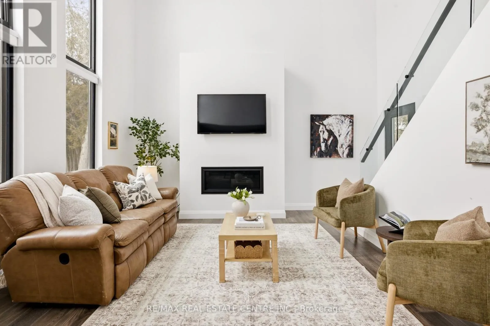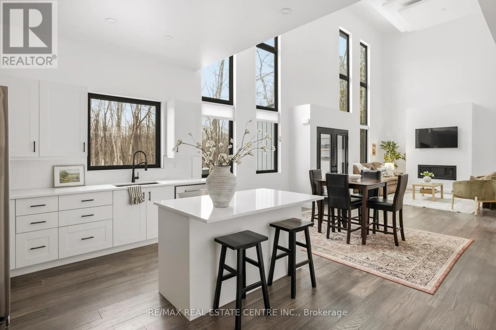 Cross Streets: Highway 12 & Concession 7. ** Directions: Highway 12 & Concession 7 to Louis Lane. There's a feeling the moment you arrive... quiet, private, surrounded by trees, and just steps from the lake. This custom built home was designed to feel different. Walk through the front doors and you are immediately struck by the scale. Soaring ceilings, walls of glass, and natural light that fills the entire space. The open concept main living area is both impressive and inviting, anchored by a fireplace and designed for real everyday living. The kitchen sits at the centre with quartz counters, a large island, and clean modern finishes that make it as functional as it is beautiful.Two bedrooms are tucked on the main level, ideal for guests, kids, or a home office. Upstairs, a glass staircase leads to a loft overlooking the main floor and a private primary retreat with a walkthrough closet and a stunning five piece ensuite with a soaker tub and glass shower. Built to last with steel construction, ICF foundation, and a metal roof. The unfinished basement offers nine foot ceilings and a rough in for a future bathroom. Set on a private 0.6 acre treed lot, this property offers space, privacy, and a lifestyle that feels removed while still being under twenty minutes to Orillia and an easy drive to the GTA. Not just a home, a place to slow down, unwind, and live differently. (id:27476)