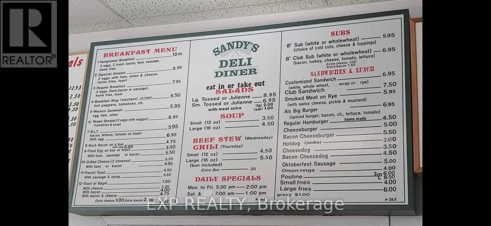 Cross Streets: Gillan & O'Brien. ** Directions: From Highway 17 head west onto O'Brien Road. The property will be on your right, on the corner of Gillan Road & O'Brien Road. Well-known, well-loved, and ready for its next chapter Sandys Deli is for sale! Proudly family owned and operated for over 26 years, this iconic Renfrew restaurant has been a cornerstone of the community, serving generations of loyal customers. Located in a high-visibility, prime location right across from the water tower, this turn-key business comes fully equipped and ready for you to step in and continue the tradition. Whether you're a seasoned restaurateur or a family looking to carry on a legacy, this is a rare chance to own a beloved local favorite. BUSINESS ONLY - PROPERTY IS LEASED. (id:27476)
